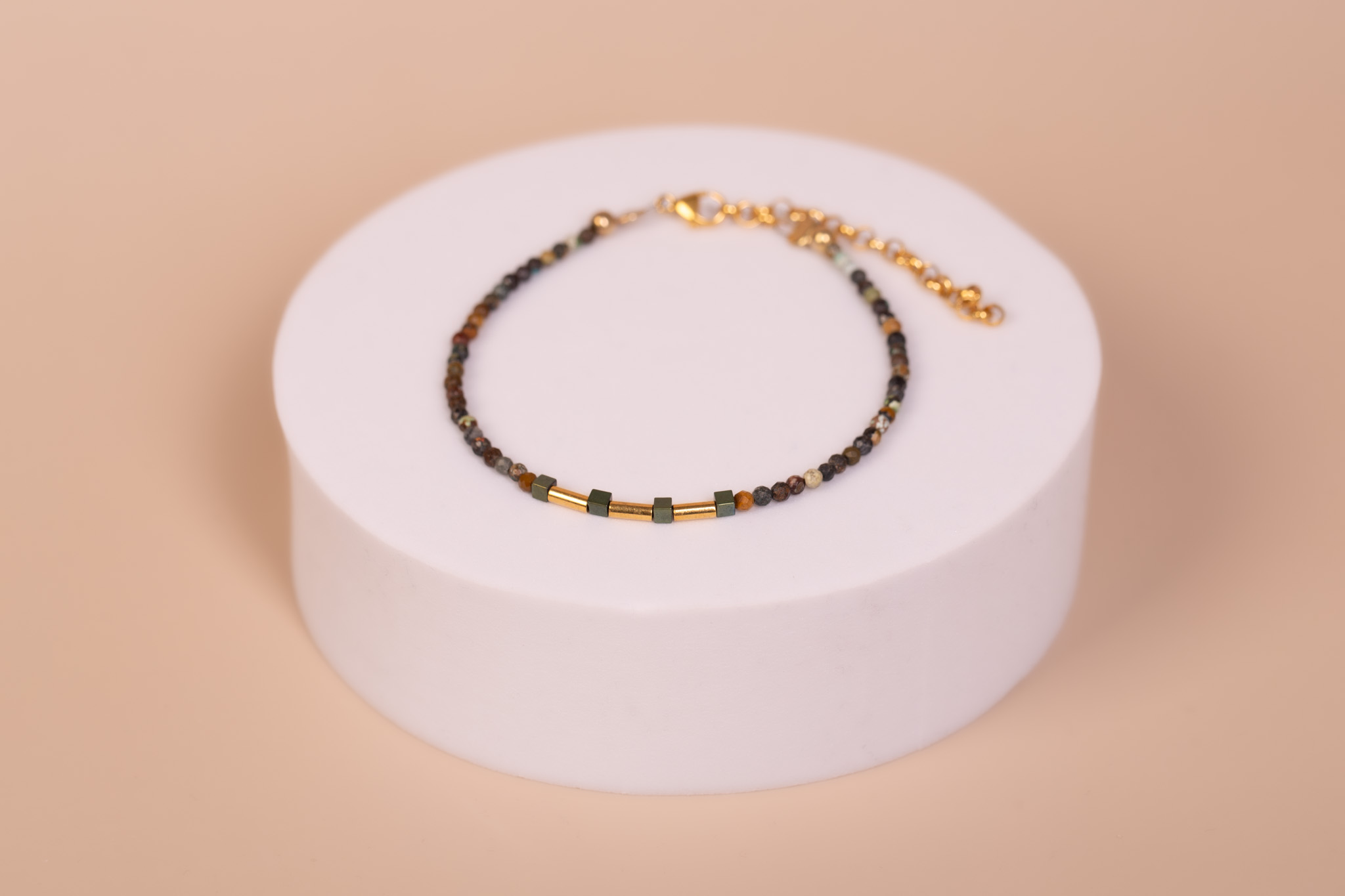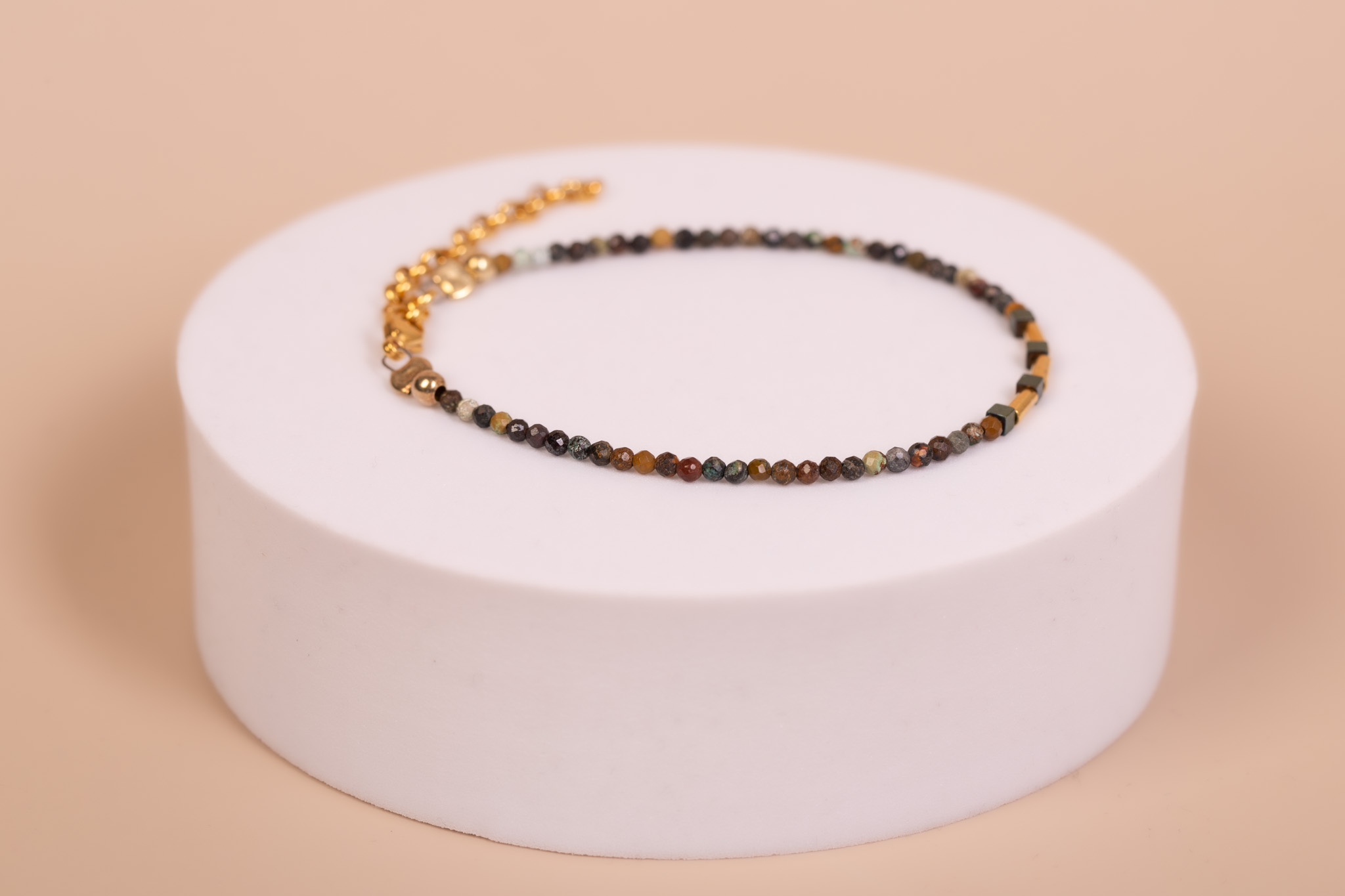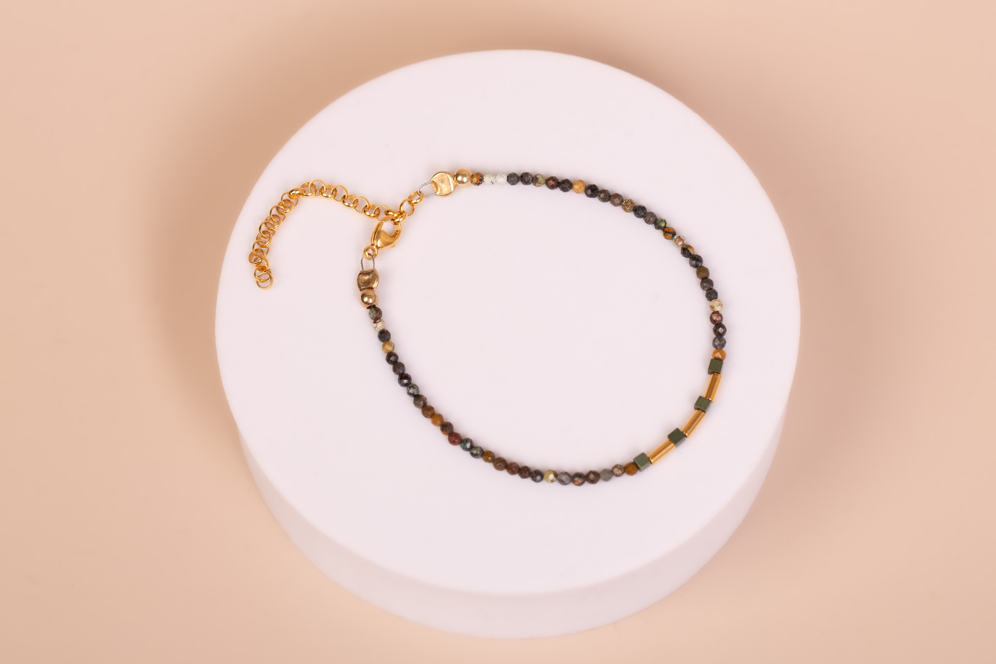 Subtelna, ręcznie wykonana bransoletka na stalowej lince, będąca pochwałą naturalnego piękna minerałów. Główną linię tworzą drobne kuleczki turmalinu, które zachwycają bogatą paletą barw ziemi – od głębokich brązów i czerni, po stonowane zielenie i szarości. Ta naturalna mozaika została wzbogacona o nowoczesne akcenty z hematytu, tworząc biżuterię o minimalistycznym, a zarazem wyrazistym charakterze.