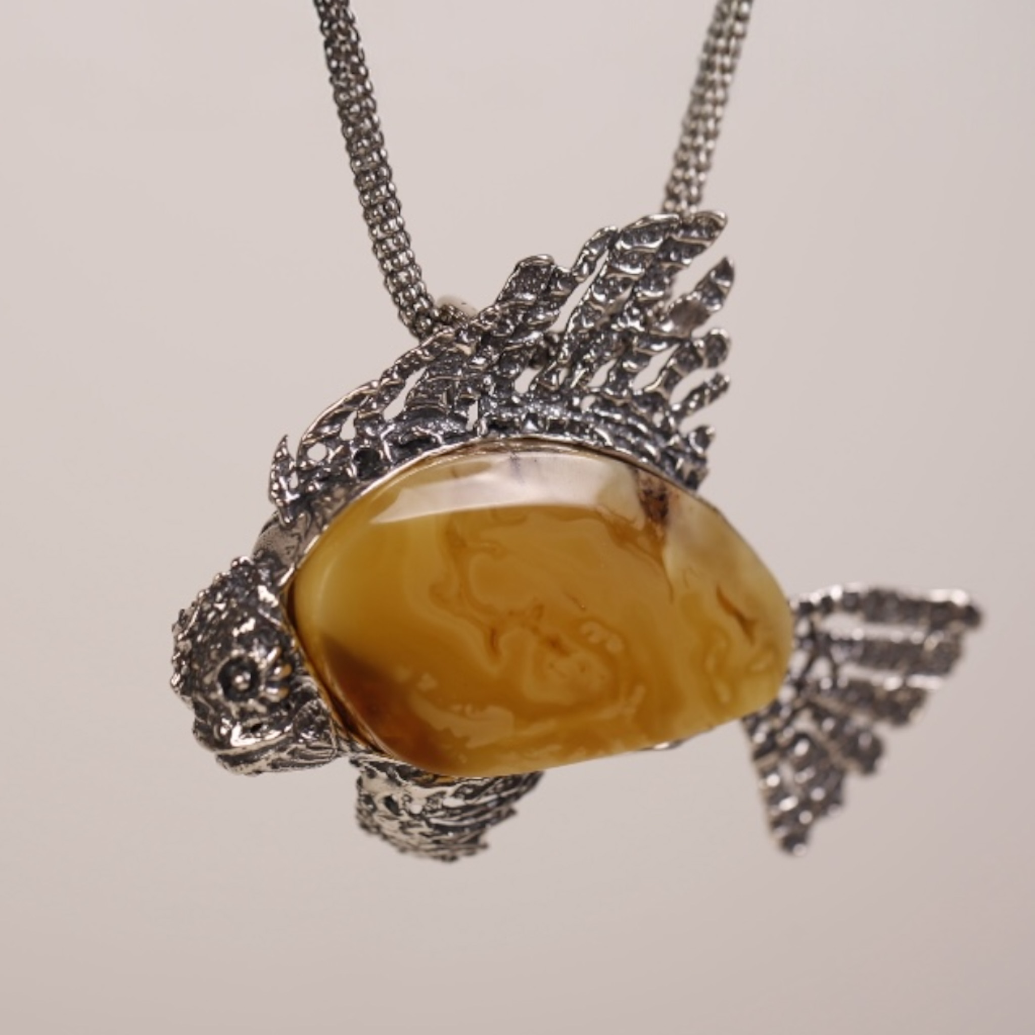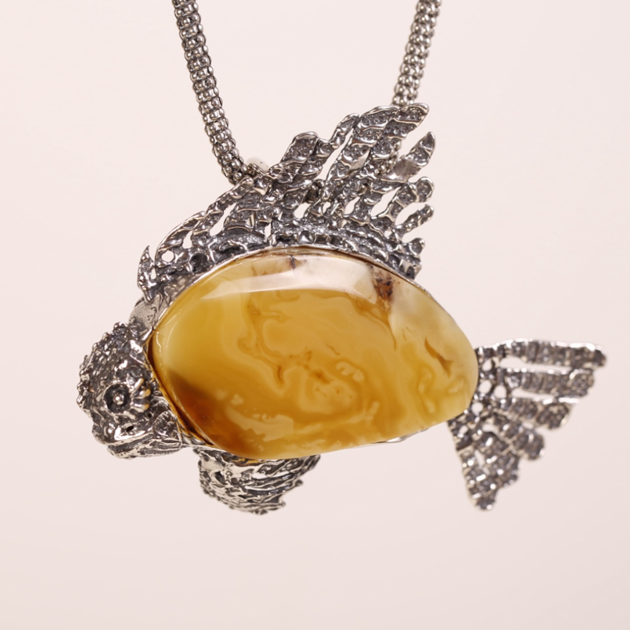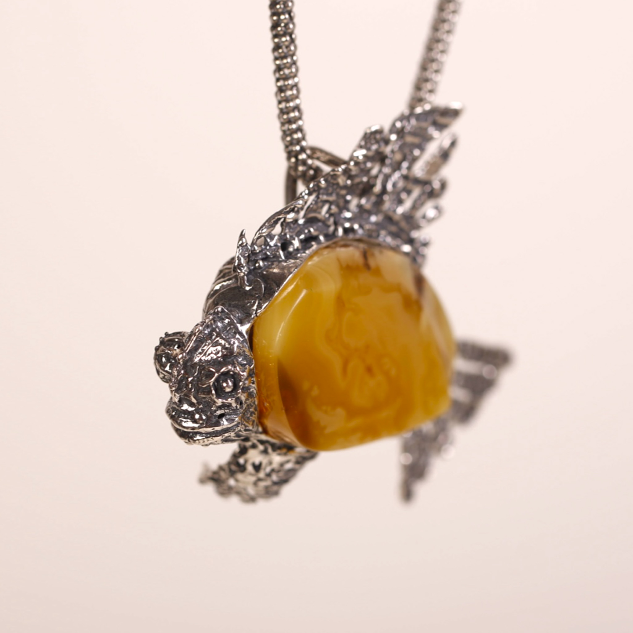 Spektakularny, masywny wisior w kształcie ryby, wykonany ze srebra próby 925 i ozdobiony dużym bursztynem bałtyckim w ciepłym, mleczno-miodowym odcieniu. Bogato ażurowe płetwy i ogon tworzą rzeźbiarską oprawę dla bursztynu, który stanowi centralny punkt kompozycji. To wyrazista biżuteria, która natychmiast przyciąga spojrzenia i najlepiej prezentuje się na prostych, gładkich ubraniach.