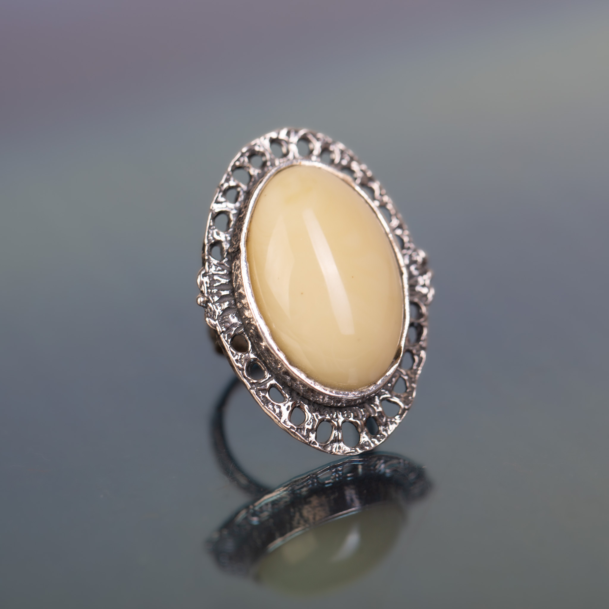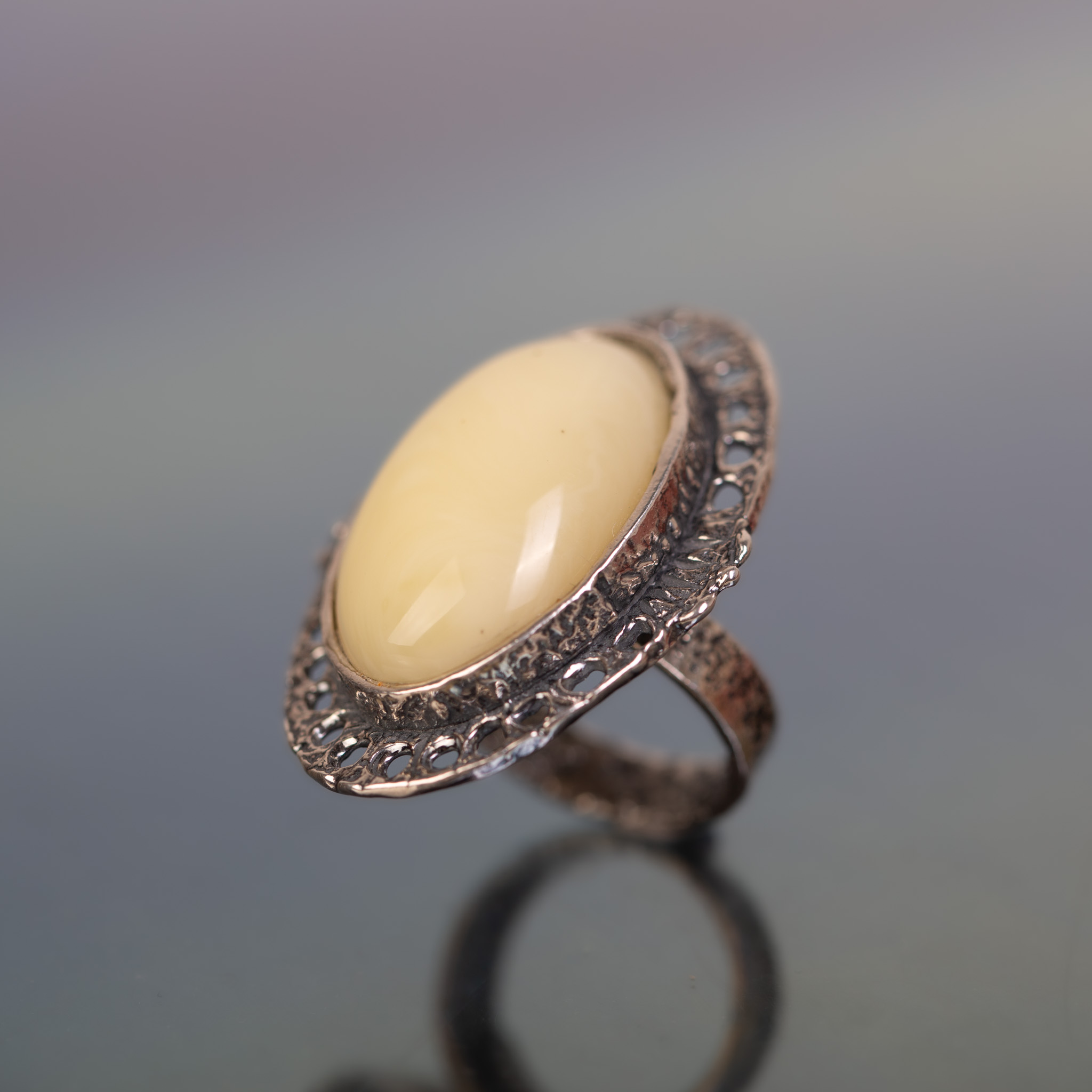 Elegancki pierścionek z naturalnym, mlecznym bursztynem bałtyckim o delikatnym, owalnym kształcie. Gładka, jasna bryła bursztynu ma miękki, subtelny blask. Ażurowa, ręcznie formowana srebrna oprawa o bogatym, dekoracyjnym wykończeniu tworzy wokół bursztynu delikatną ramę, podkreślając jego szlachetny charakter. To biżuteria o klasycznym, jednocześnie artystycznym charakterze.