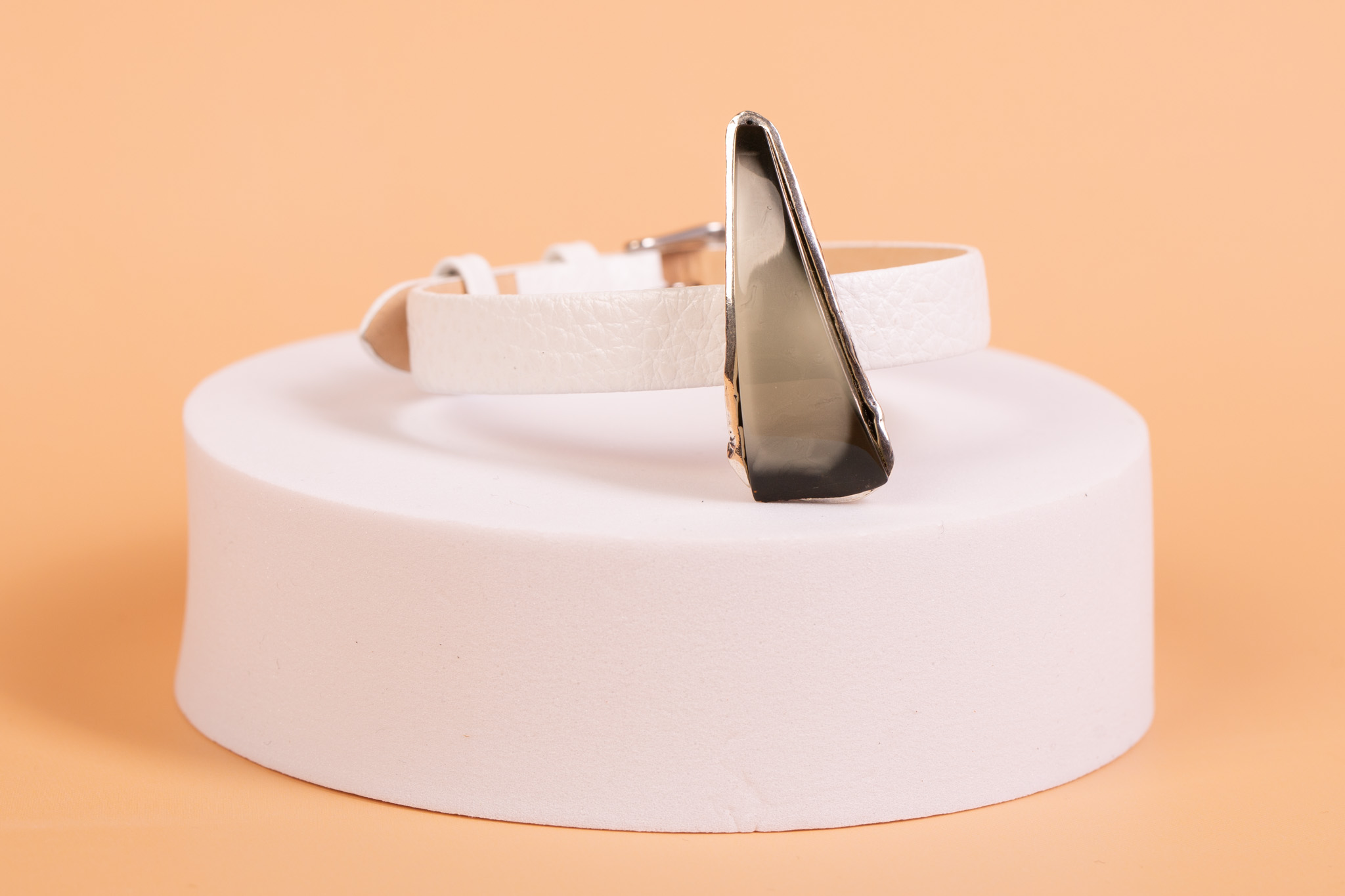 Waga i odczucie: Masa srebrnej części z bursztynem (9 g) sprawia, że bransoleta jest lekka i niezwykle komfortowa w codziennym noszeniu. Smukły profil bursztynu o wysokości 0,9 cm subtelnie układa się na ręce, stanowiąc elegancki akcent. Miękki, biały pasek jest przyjemny dla skóry, a naturalne ciepło bursztynu podnosi komfort użytkowania. To autorski projekt stworzony dla kobiet ceniących nowoczesną klasykę.