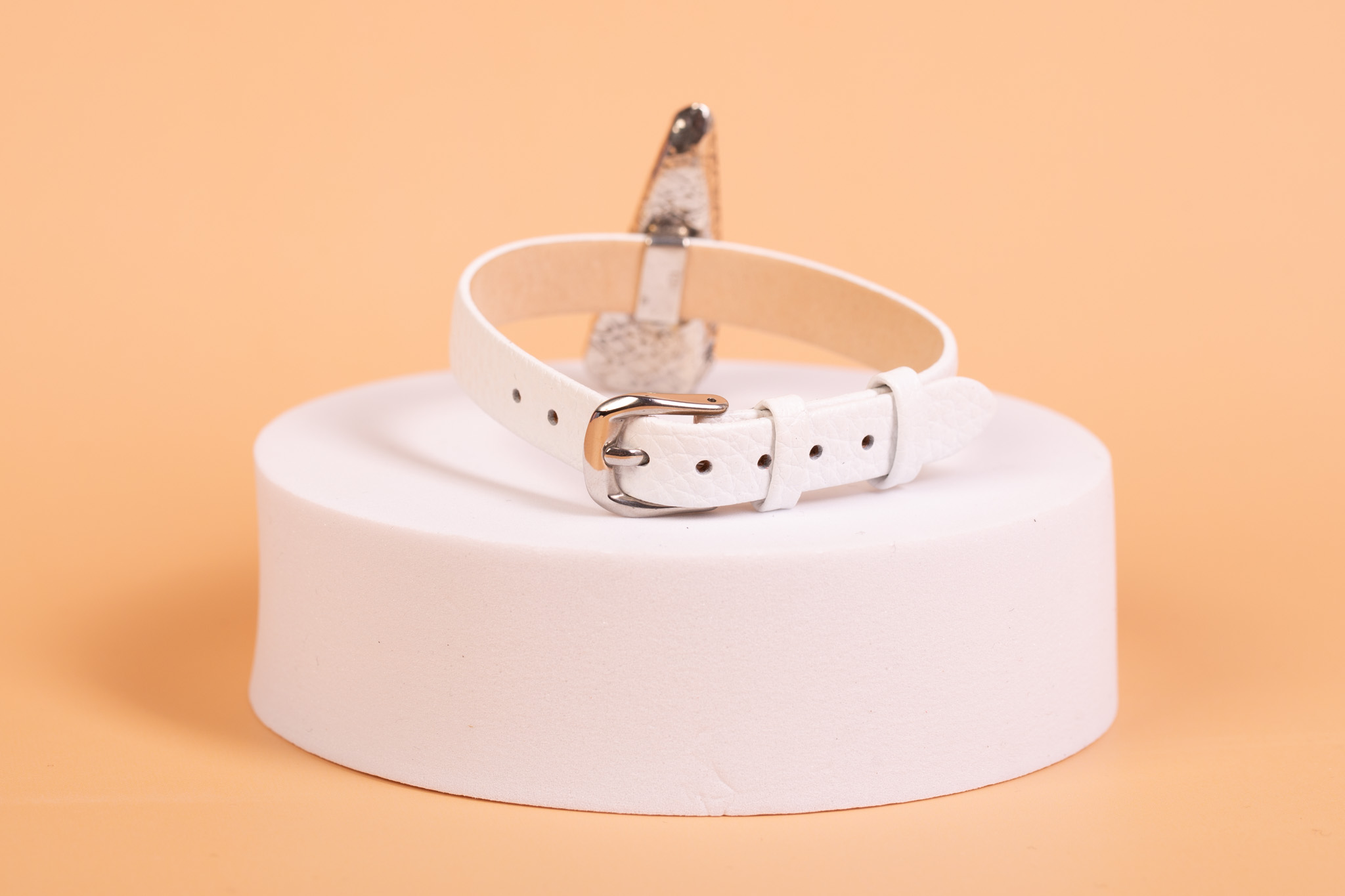Srebro próby 925 · bursztyn bałtycki (naturalny) · pasek skórzany (biały) z metalowymi elementami w kolorze srebra · waga części ozdobnej 9 g · bursztyn 4 cm x 1,4 cm · wysokość bursztynu 0,9 cm · długość paska 23 cm · szerokość paska 1 cm