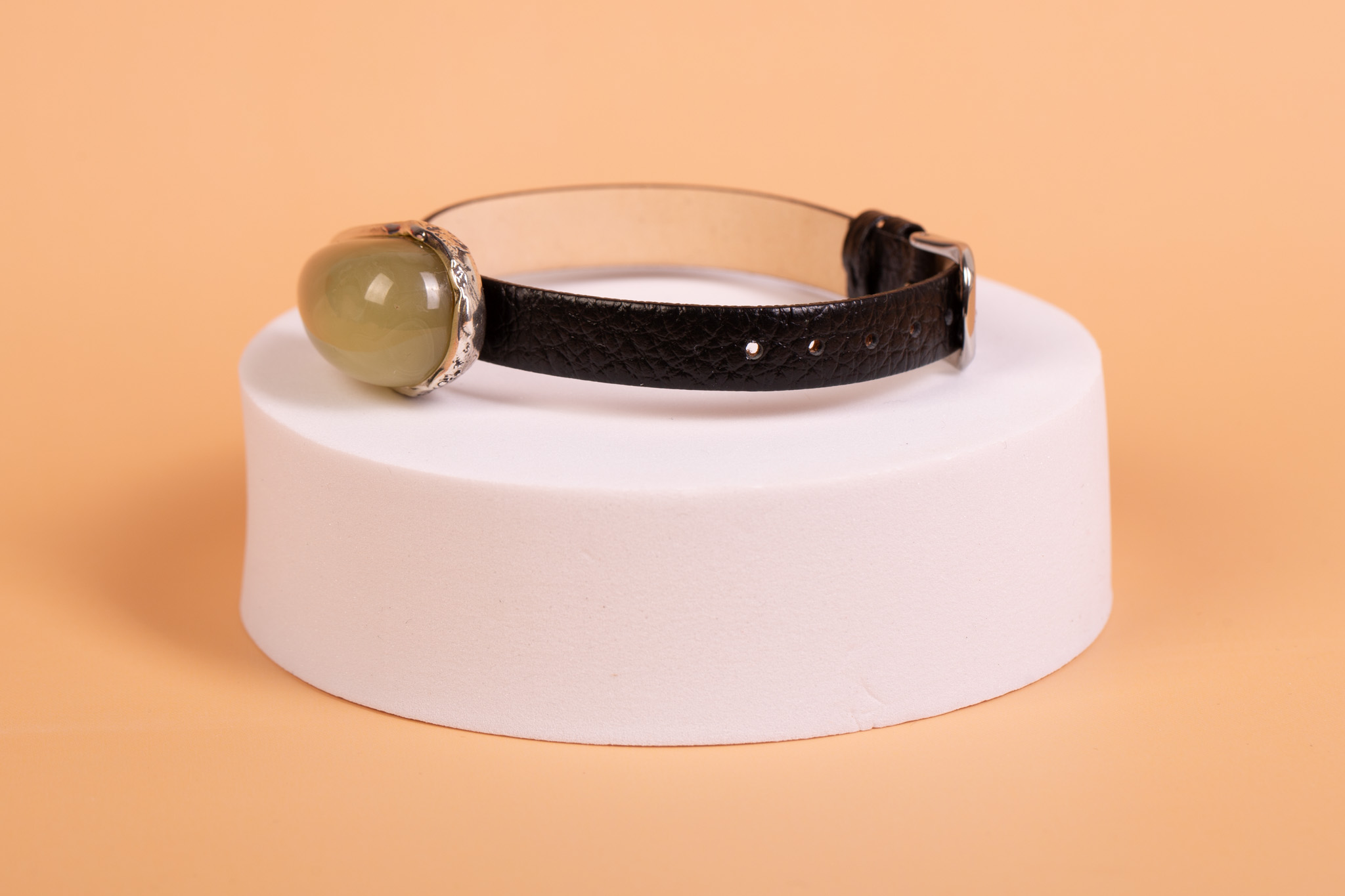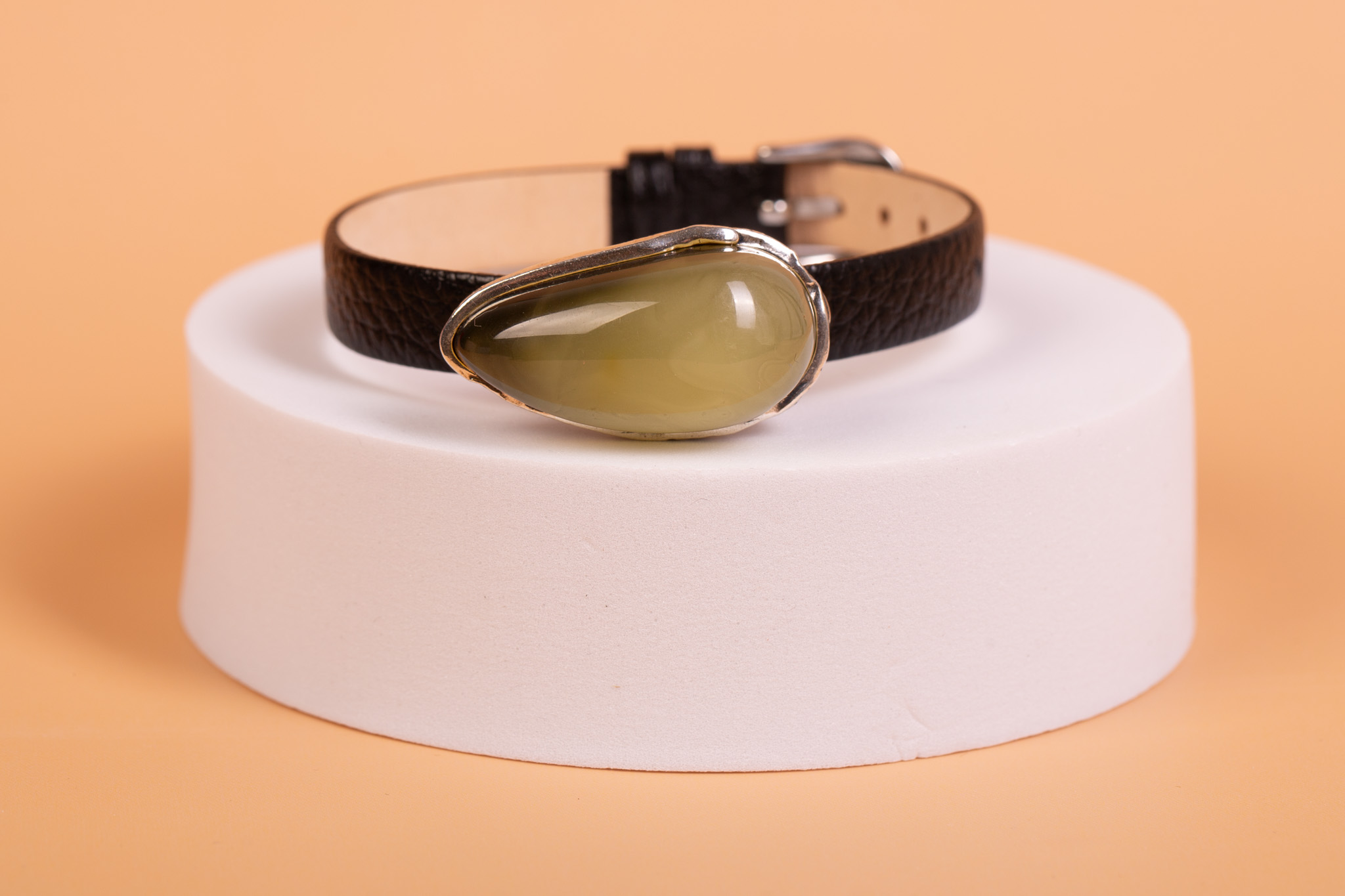 Oryginalna bransoleta łącząca surowy charakter czarnej skóry z organicznym pięknem naturalnego bursztynu bałtyckiego. Centralnym punktem projektu jest okazała bryła bursztynu o rzadkim, oliwkowym odcieniu i wysokim, soczewkowym szlifie. Bursztyn został osadzony w ręcznie wykonanej oprawie z wysokiej próby srebra, która idealnie dopasowuje się do kształtu bursztynu, podkreślając jego unikatowy charakter.