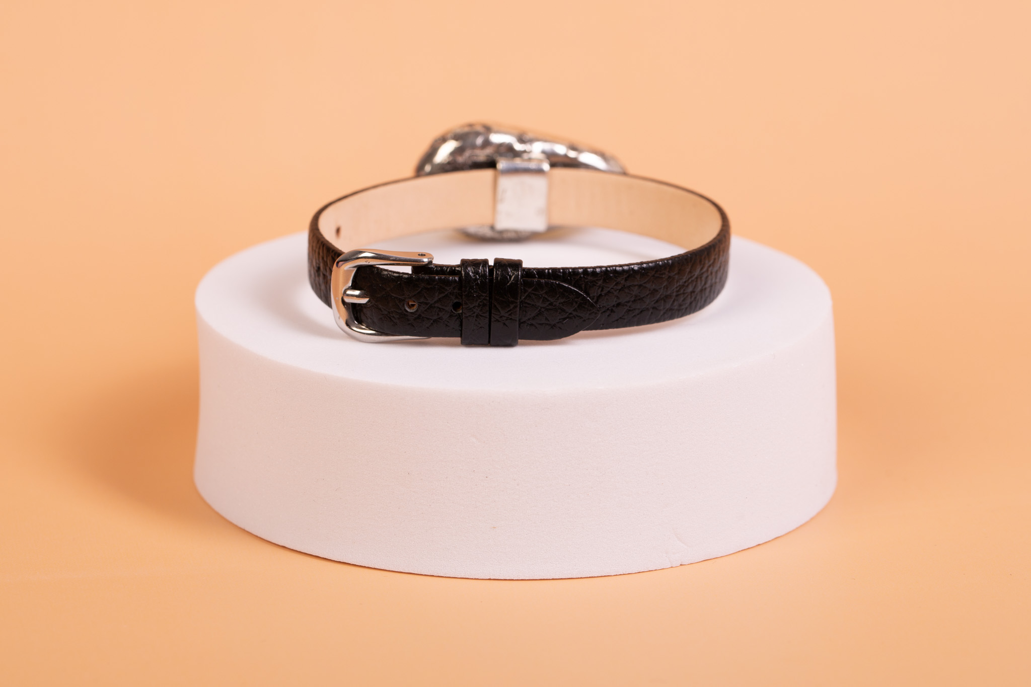 Forma i charakter: Bransoleta wyróżnia się nowoczesną formą inspirowaną klasycznym paskiem zegarkowym. Połączenie fakturowanej skóry z gładkim, lśniącym bursztynem tworzy intrygujący kontrast faktur. Srebrna oprawa, wykonana w całości ręcznie, stanowi solidną i elegancką ramę dla kamienia, nadając całości artystycznego sznytu. Dzięki zapięciu na klamerkę, biżuteria oferuje szeroki zakres regulacji, co pozwala na idealne dopasowanie do każdego nadgarstka.