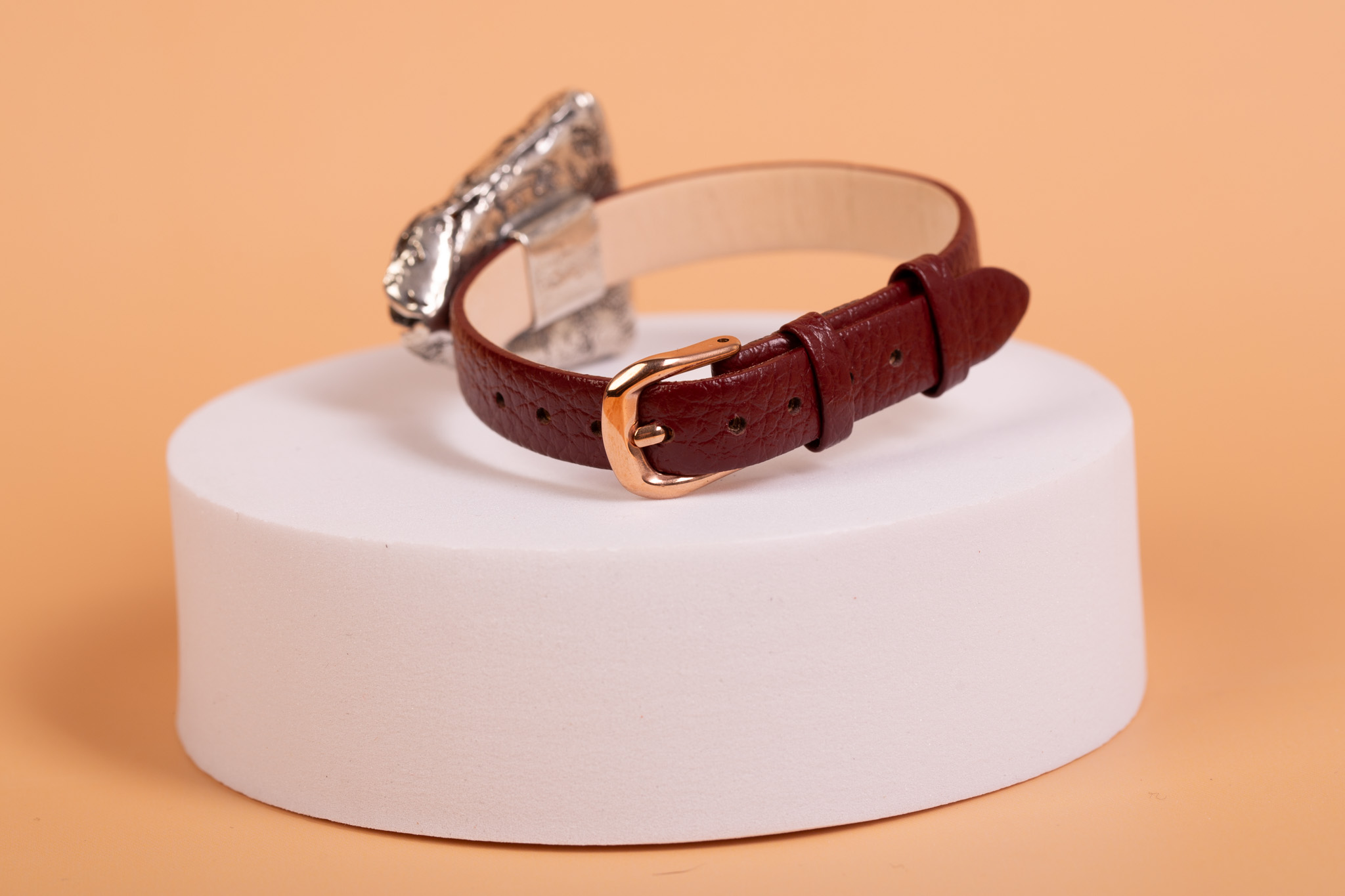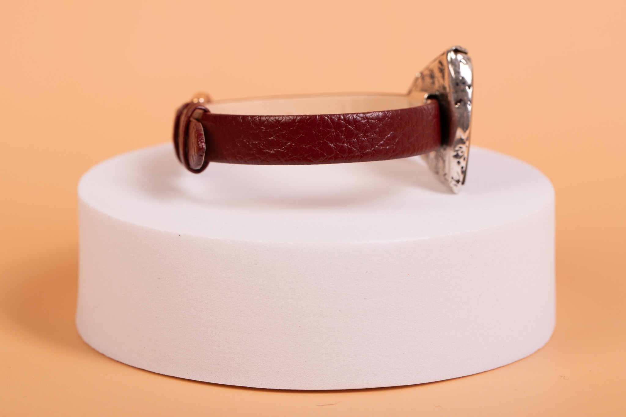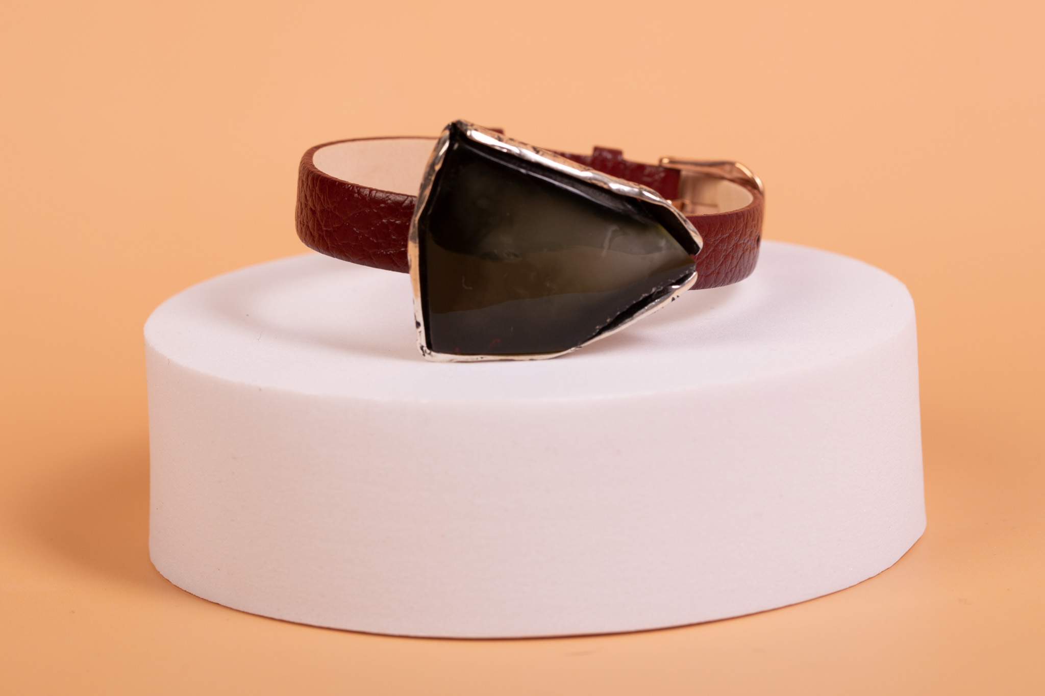 Oryginalna bransoleta łącząca surowy charakter burgundowej skóry z organicznym pięknem naturalnego bursztynu bałtyckiego. Centralnym punktem projektu jest okazała bryła bursztynu o rzadkim ciemnym odcieniu i zatopionej chmurze. Bursztyn został osadzony w ręcznie wykonanej oprawie z wysokiej próby srebra, która idealnie dopasowuje się do kształtu bursztynu, podkreślając jego unikatowy charakter.