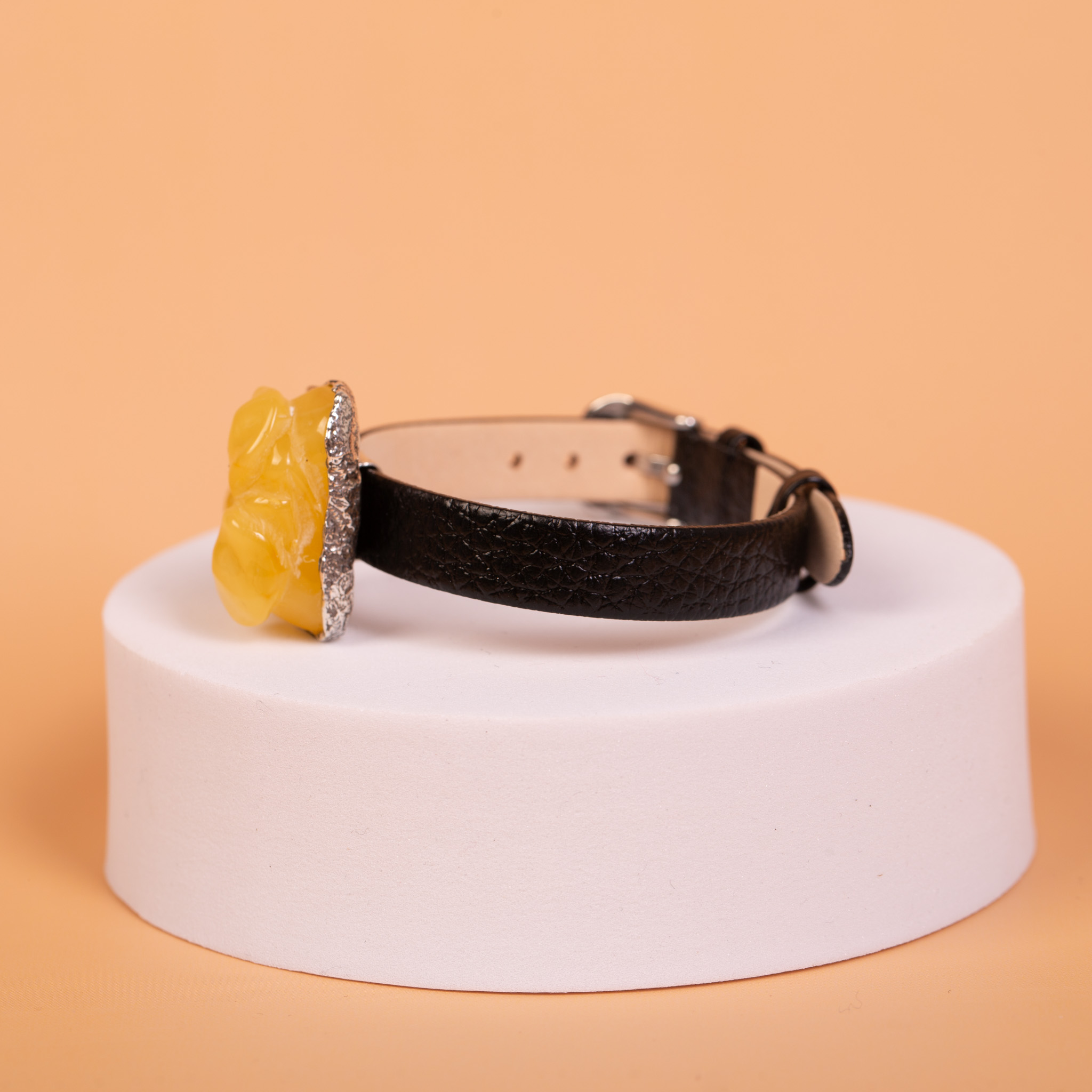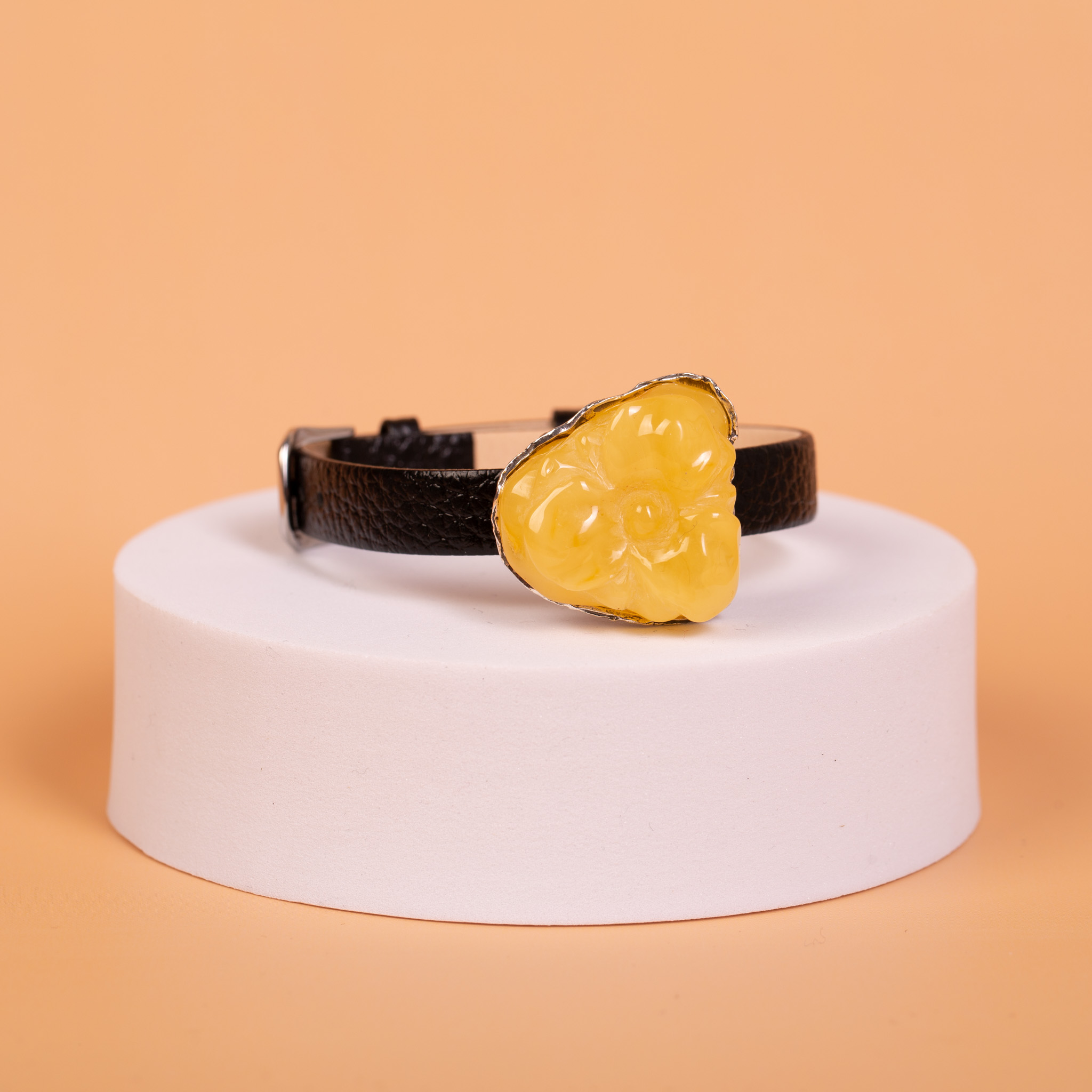 Bransoleta wykonana ręcznie, łącząca skórzany pasek od zegarka z tradycyjnie rzeźbionym bursztynem bałtyckim. Centralnym elementem jest naturalny bursztyn o miodowym odcieniu, w którym wyrzeźbiono motyw kwiatu. Bursztyn ma matowe wykończenie, co nadaje mu satynowy wygląd i sprawia, że rzeźba jest łagodna w odbiorze.