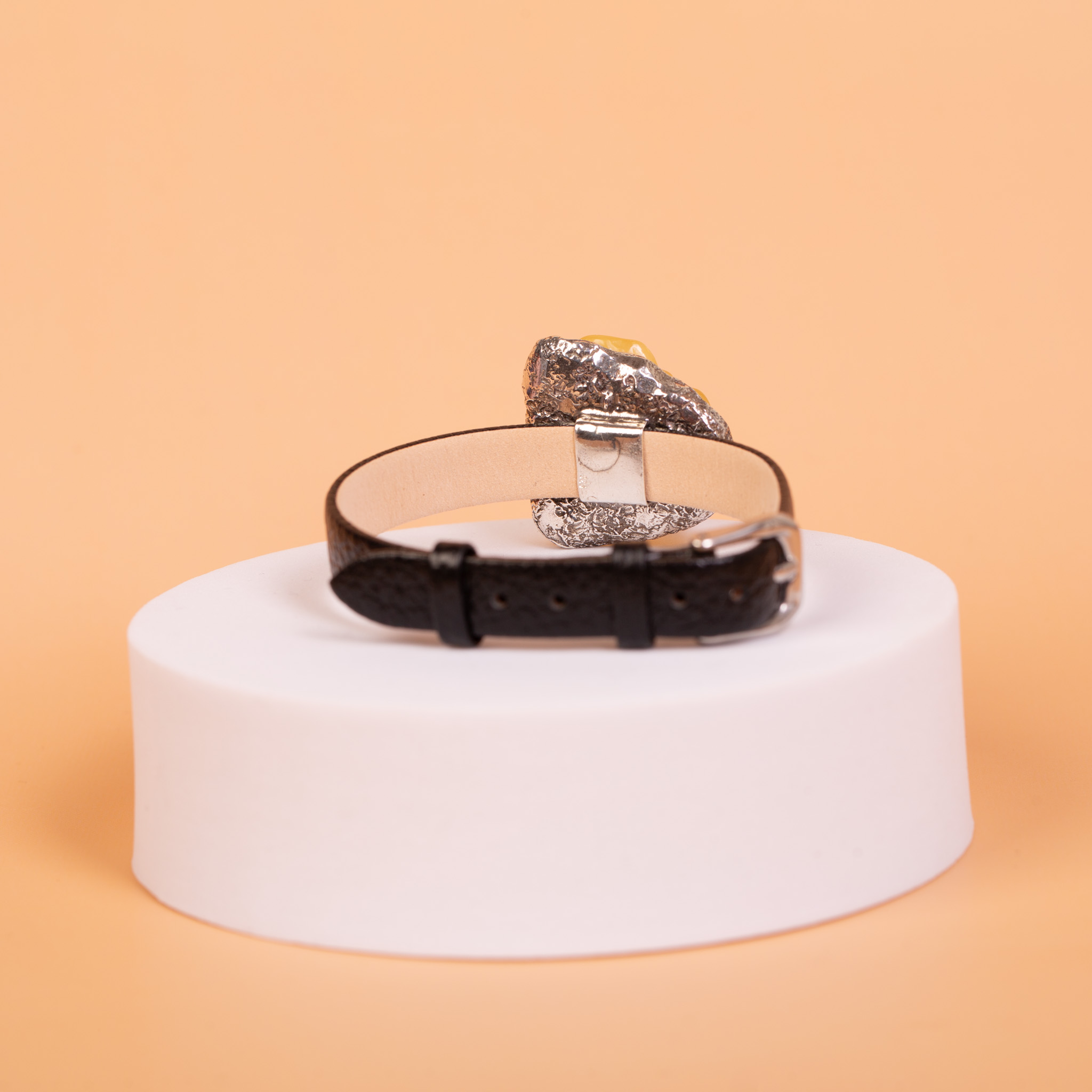Forma i charakter: Bransoleta opiera się na kontraście czarnej, fakturowanej skóry i jasnego, matowego bursztynu. Kwiat został osadzony w prostej, srebrnej oprawie wykonanej ręcznie ze srebra próby 925. Konstrukcja to klasyczny pasek od zegarka z metalowymi elementami w kolorze srebrnym, co nadaje całości nowoczesny, codzienny styl. Zapięcie na klamerkę pozwala na swobodną regulację obwodu.