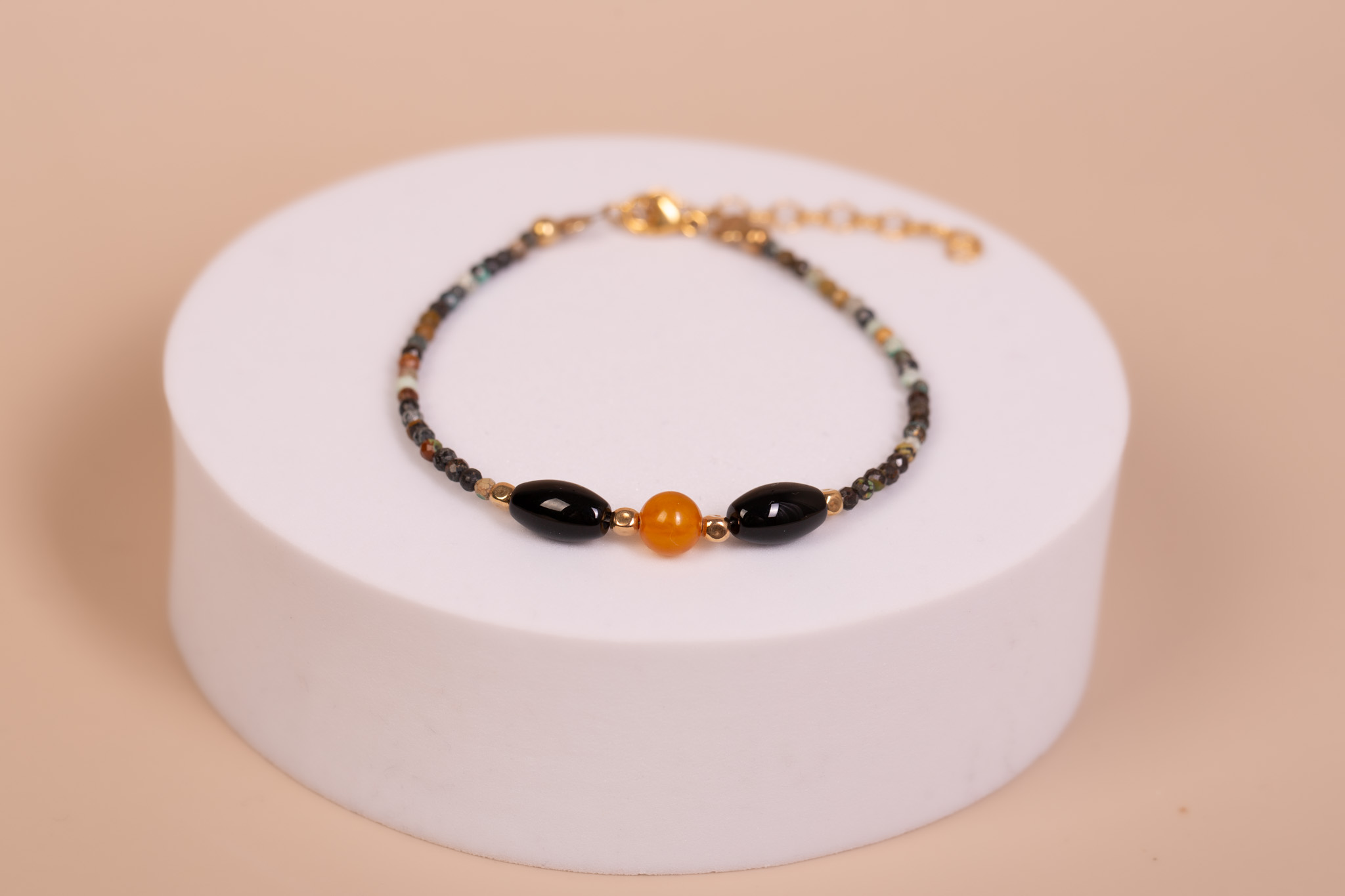 Elegancka, ręcznie wykonana bransoletka na stalowej lince, stanowiąca wyrafinowane połączenie głębokiej czerni i słonecznego ciepła. Centralnym punktem projektu jest kulka naturalnego bursztynu bałtyckiego o miodowym odcieniu, ujęta w ramę z dwóch gładkich, lśniących oliwek onyksu. Tę klasyczną kompozycję dopełnia sznur drobnych kuleczek turmalinu o stonowanej, wielobarwnej kolorystyce.