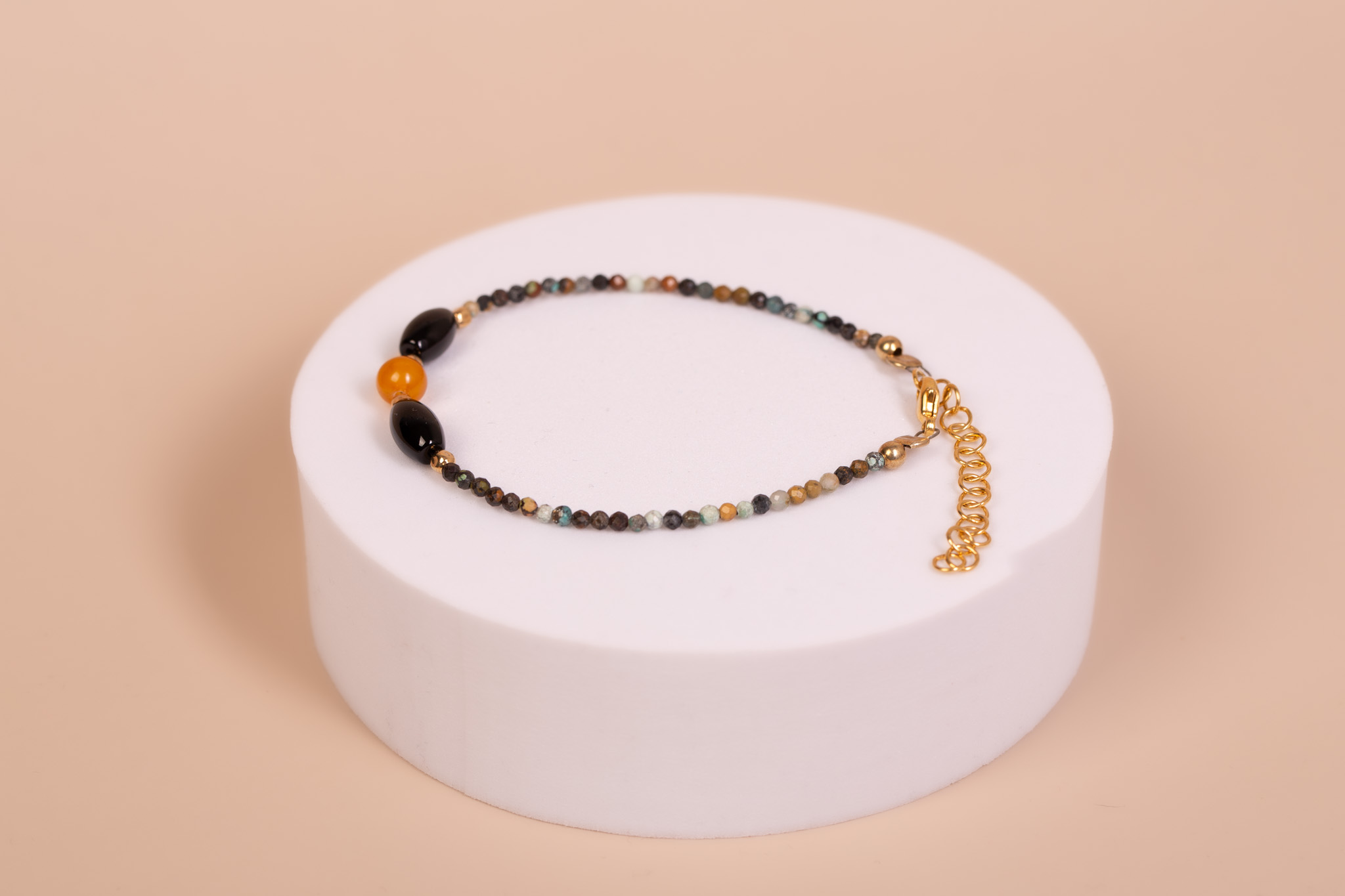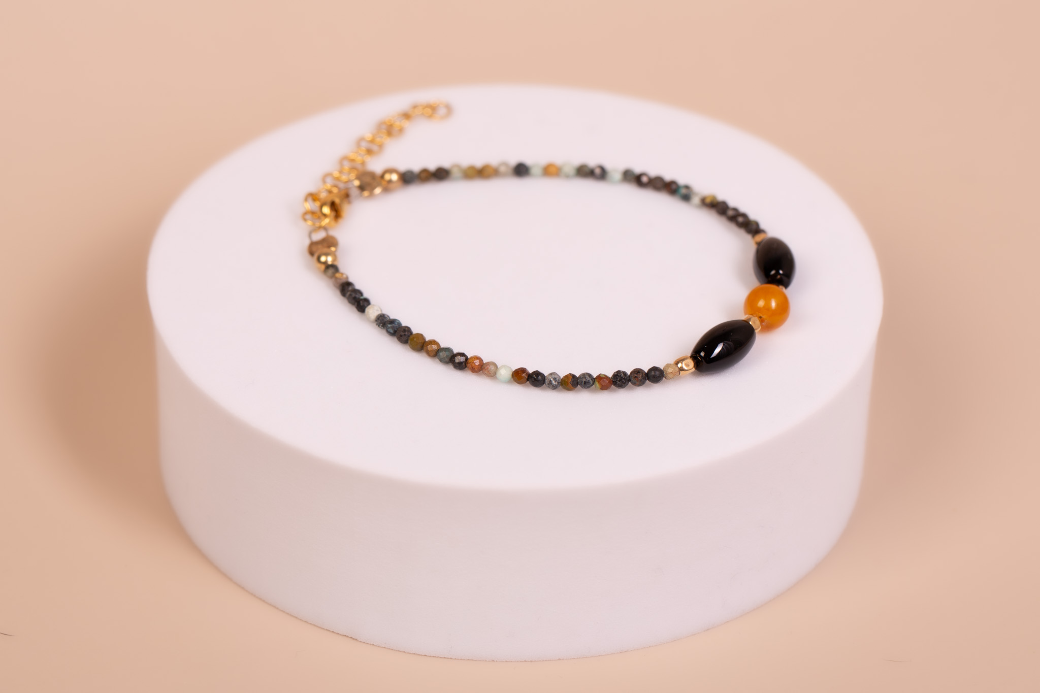 Forma i charakter: Bransoletka wyróżnia się rytmicznym układem kształtów i faktur. Kontrast między lustrzaną powierzchnią onyksu, ciepłym blaskiem bursztynu a naturalną strukturą turmalinu nadaje projektowi nowoczesnego charakteru. Złociste akcenty w formie kuleczek ze srebra próby 925 pozłacanego wprowadzają do kompozycji szlachetny blask, harmonijnie łącząc wszystkie elementy w spójną, biżuteryjną całość. To projekt idealny dla osób ceniących elegancję z nutą naturalności.