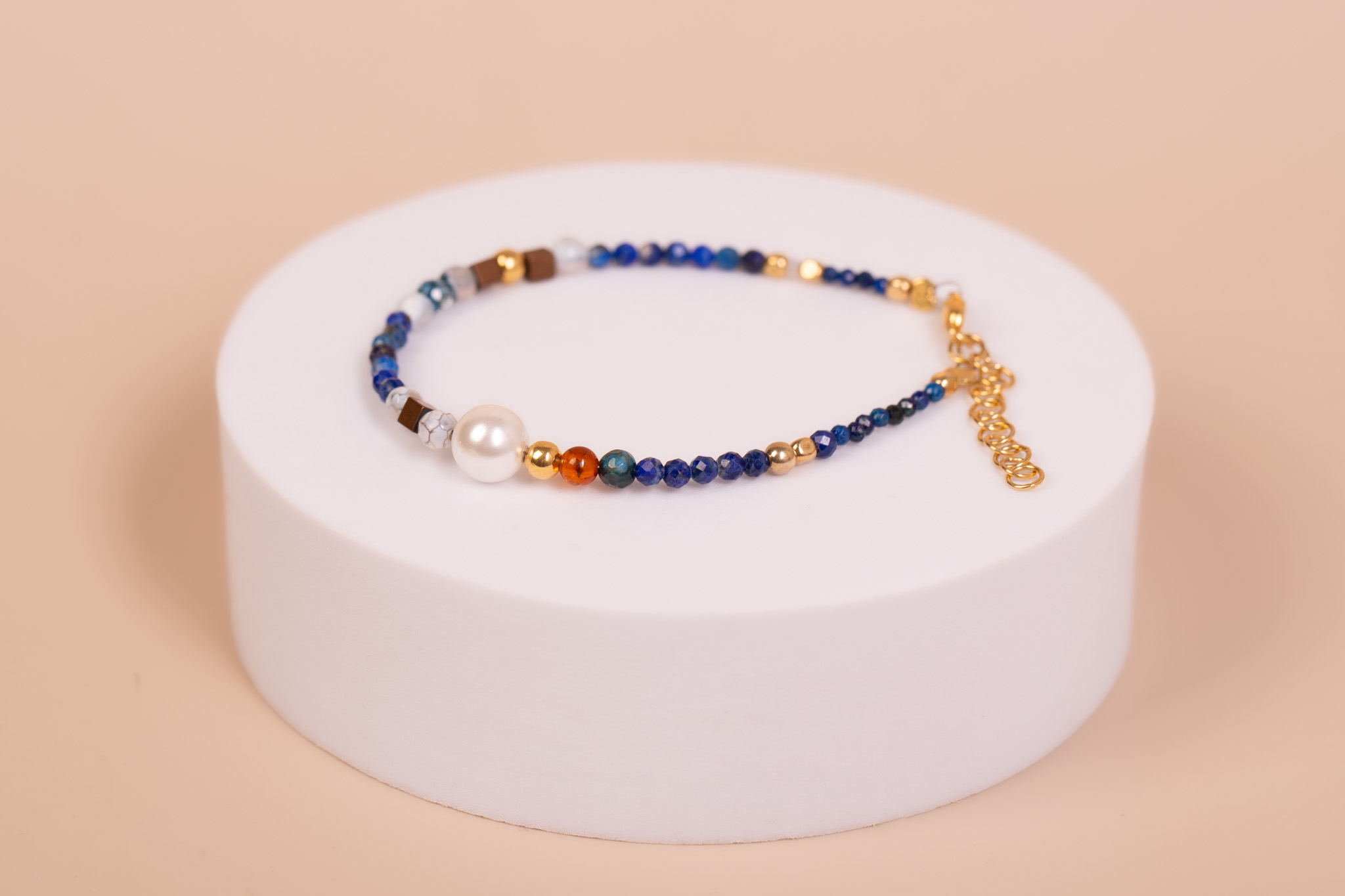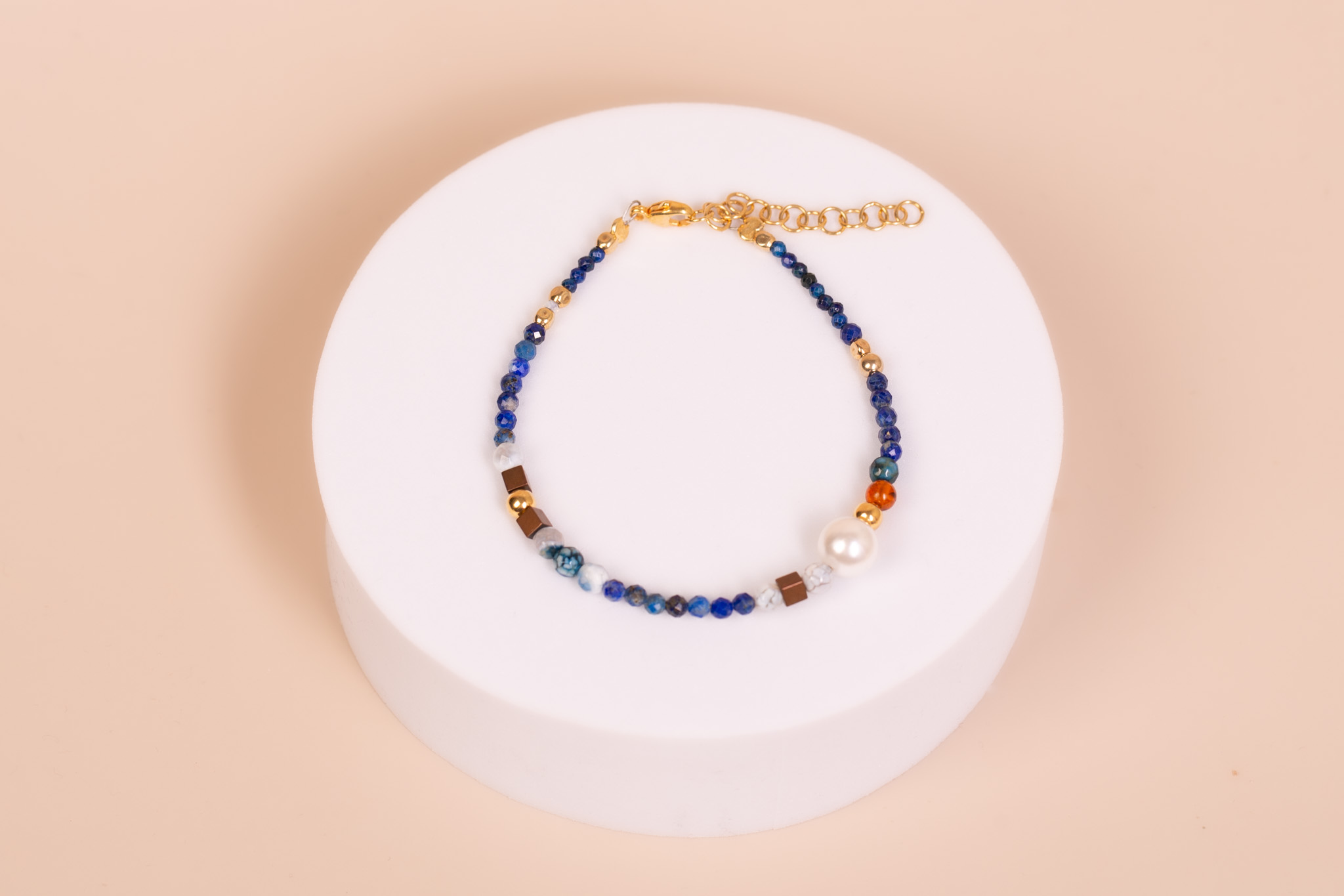 Artystyczna bransoletka na stalowej lince, będąca bogatą kompozycją barw i naturalnych tekstur. Centralnym punktem projektu jest lśniąca perła hodowlana, obok której umieszczono słoneczną kulkę bursztynu bałtyckiego. Całość dopełnia sznur drobnych kamieni: głębokiego lapis lazuli oraz howlitu o unikatowym, marmurkowym wzorze w odcieniach bieli i błękitu.