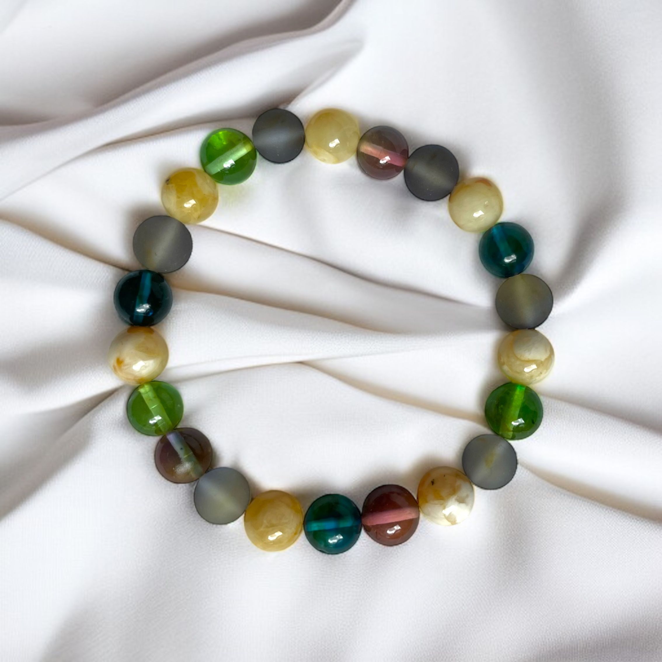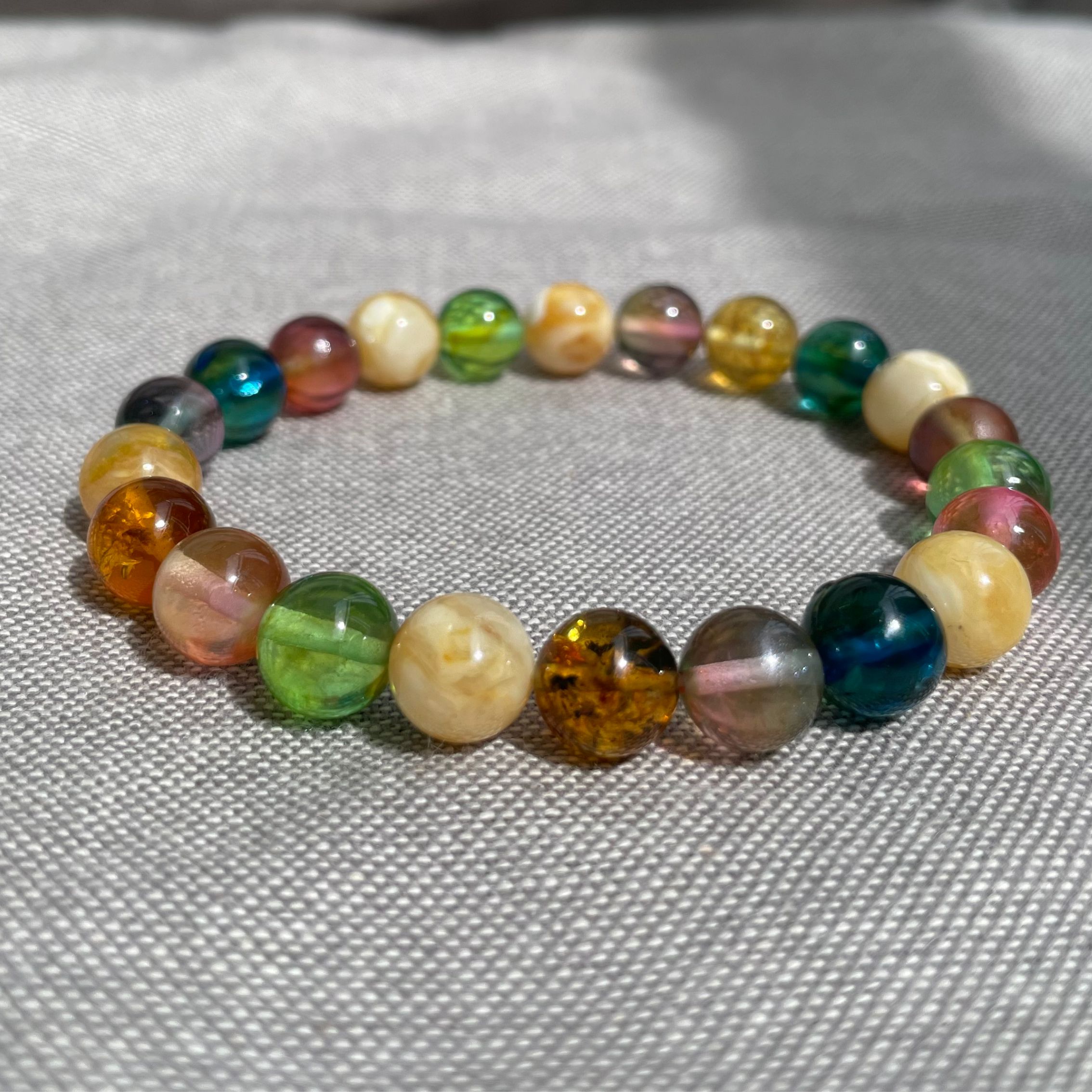 Bransoletka z barwionego bursztynu bałtyckiego, nawleczonego na elastyczną gumkę. Wykonana z gładkich kolorowych kulek z barwionych bursztynów. Dzięki elastycznej formie bransoletka łatwo dopasowuje się do nadgarstka i jest bardzo wygodna w noszeniu. Pięknie prezentuje się na nadgarstku.