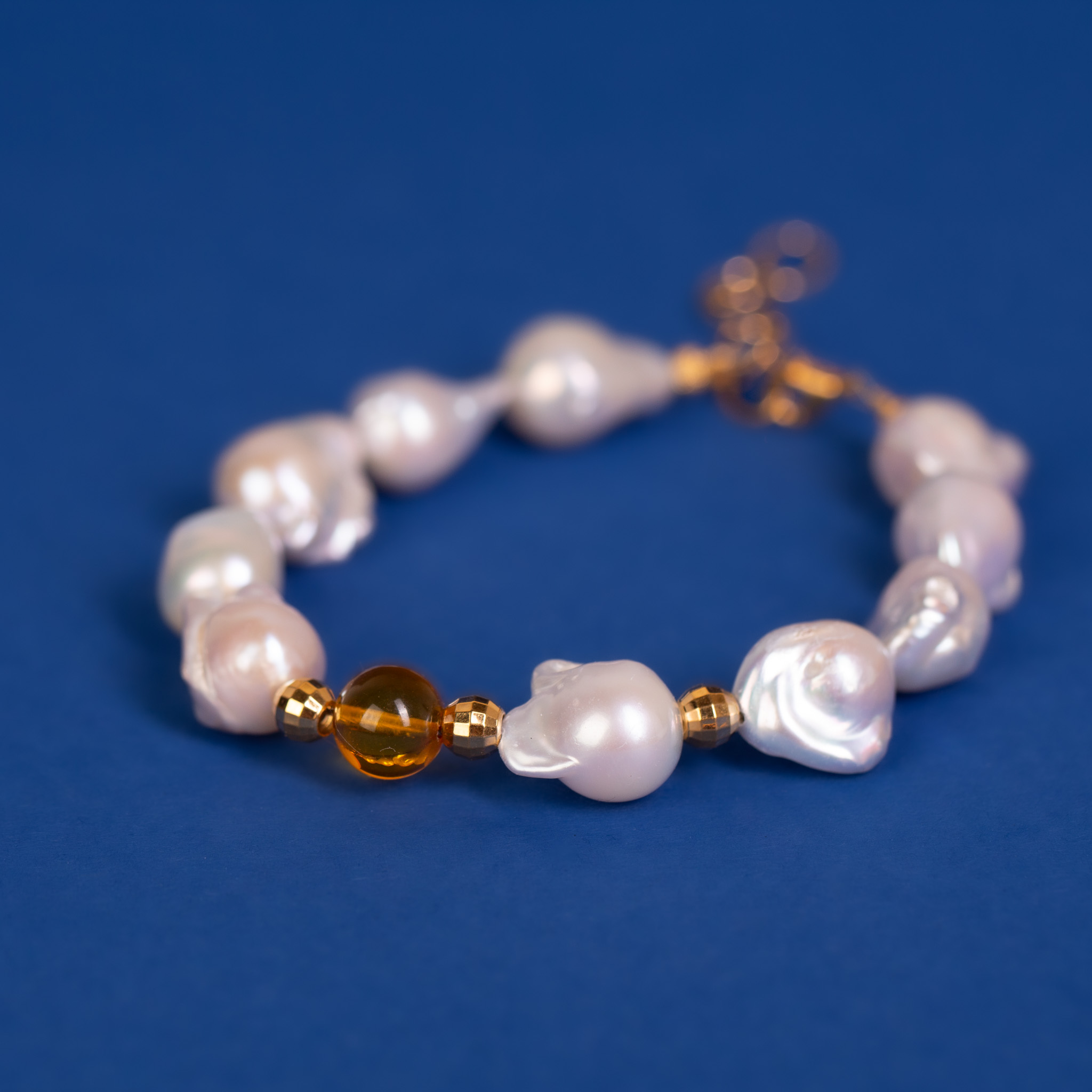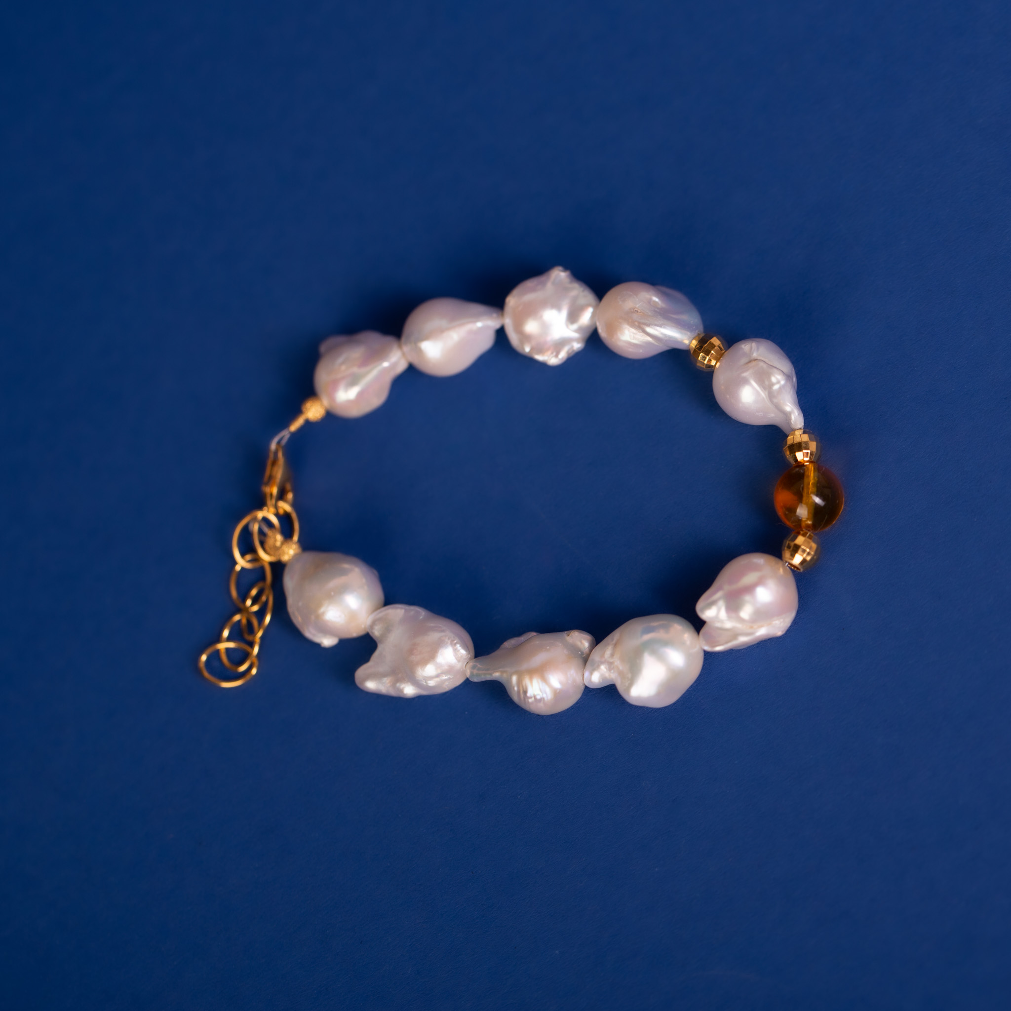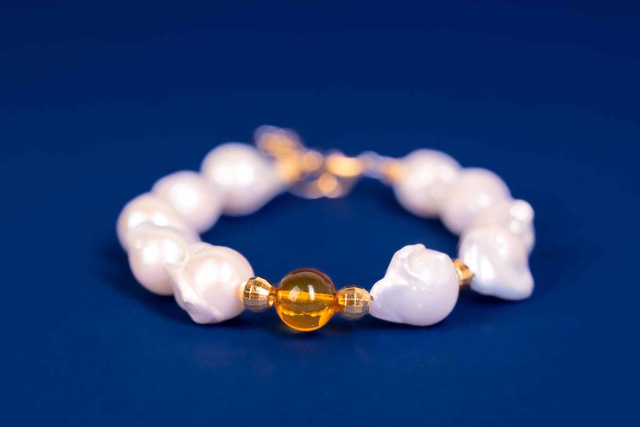 Luksusowa bransoletka łącząca naturalne perły słodkowodne z bursztynem bałtyckim. Perły o nieregularnym, organicznym kształcie i delikatnym, mlecznym połysku tworzą główną linię biżuterii, przełamane zostały złocistymi, ozdobnymi kulkami i jedną słoneczną kulką bursztynu. Wszystkie elementy osadzone są na trwałej stalowej lince i wykończone złotym karabińczykiem. To biżuteria, która łączy naturalne piękno z nowoczesnym, luksusowym stylem.