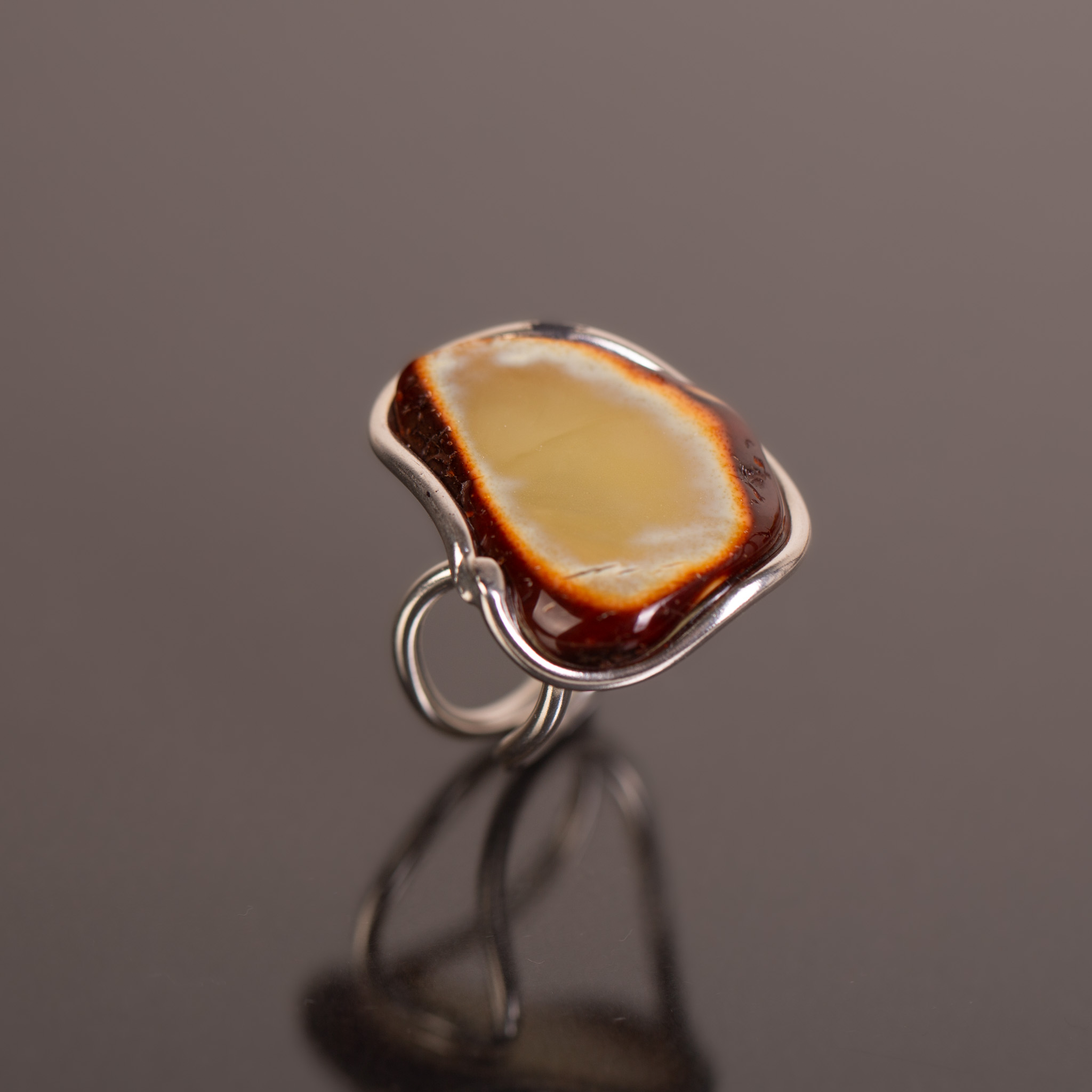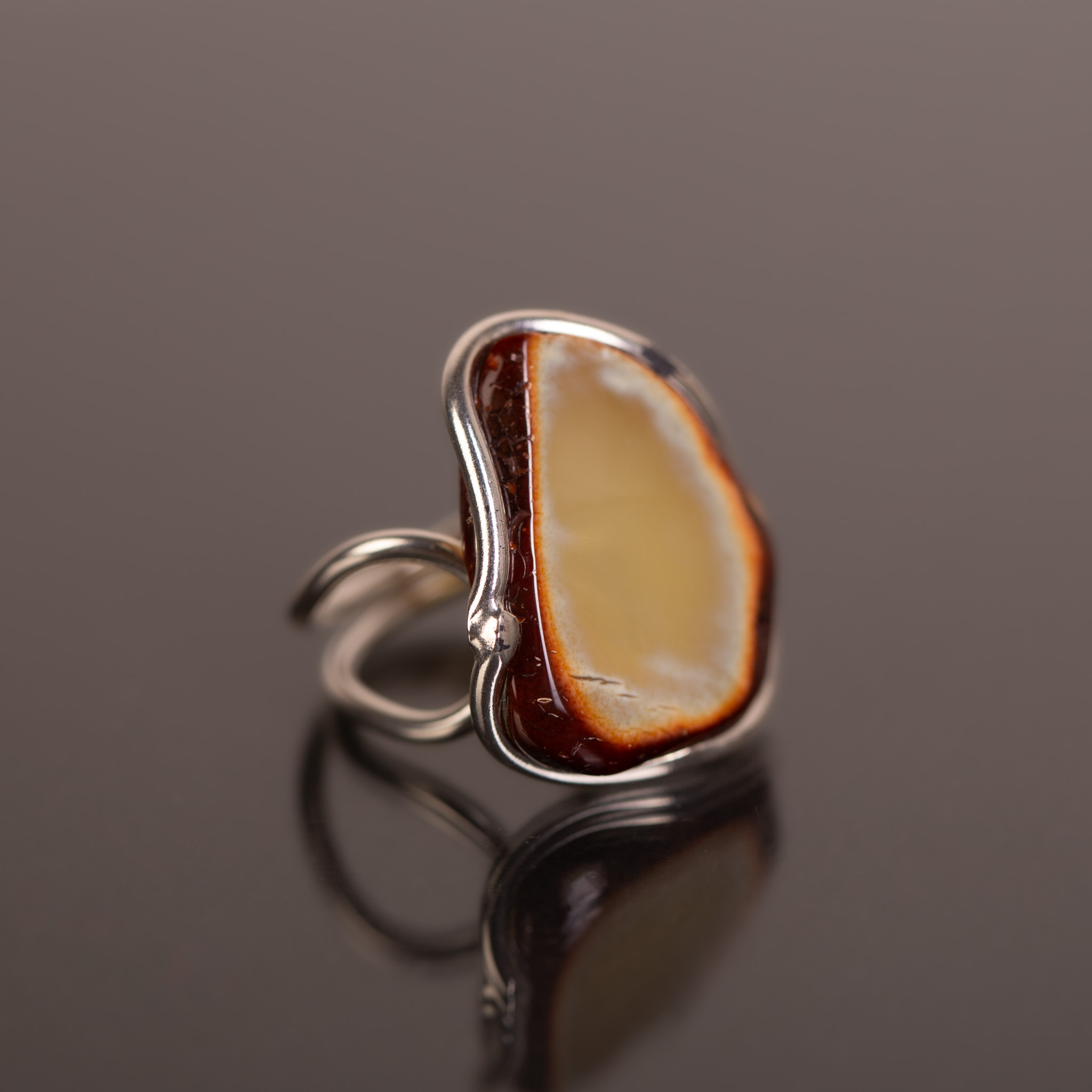 Subtelny, artystyczny pierścionek z naturalnym plastrem bursztynu bałtyckiego. Bursztyn zachowuje swój surowy charakter — ciemniejsza, koniakowa krawędź kontrastuje z jasnym, mlecznym wnętrzem, tworząc efekt naturalnego obramowania. Minimalistyczna oprawa ze srebra próby 925 płynnie przechodzi w podwójną, lekką obrączkę, co nadaje całości nowoczesny i lekki wygląd.