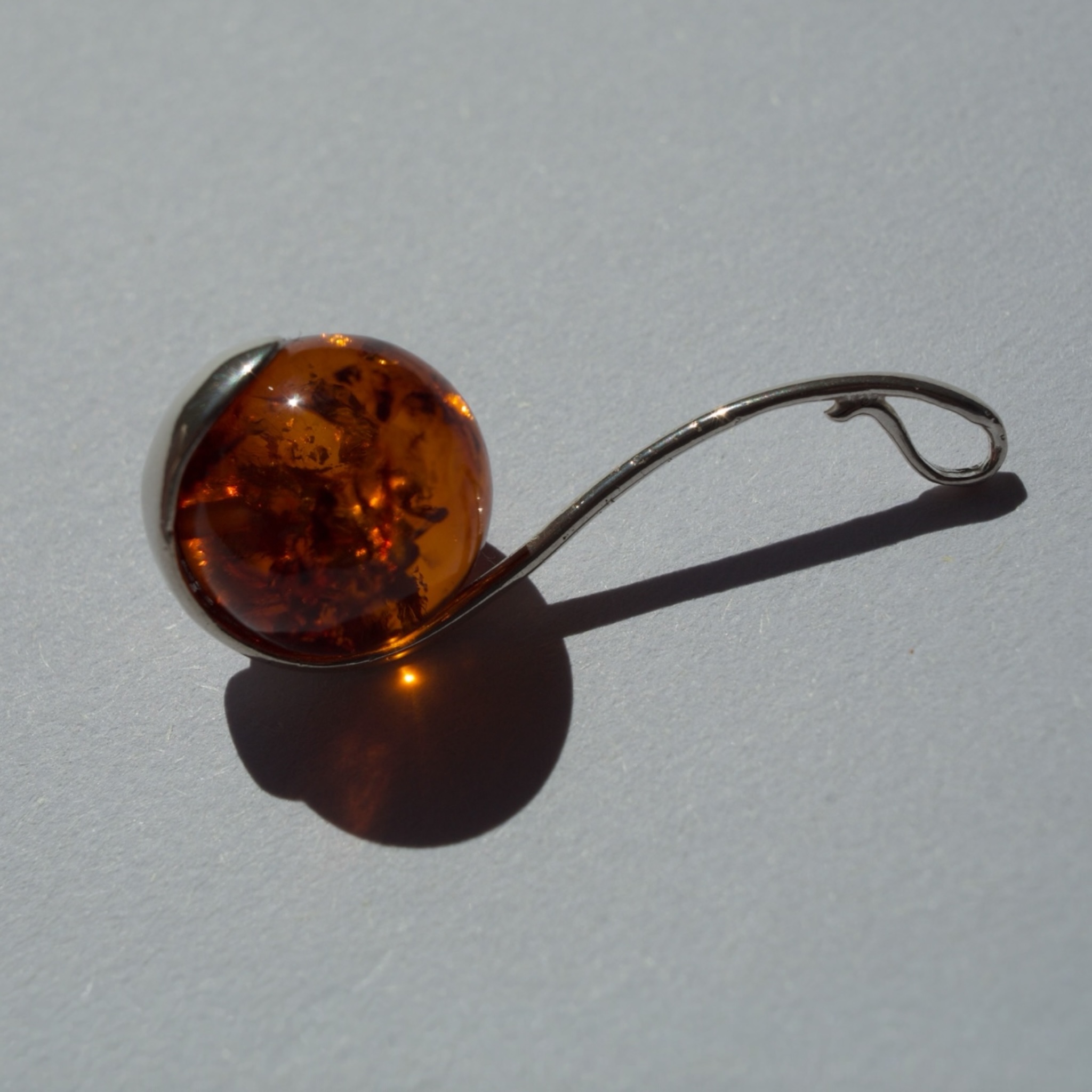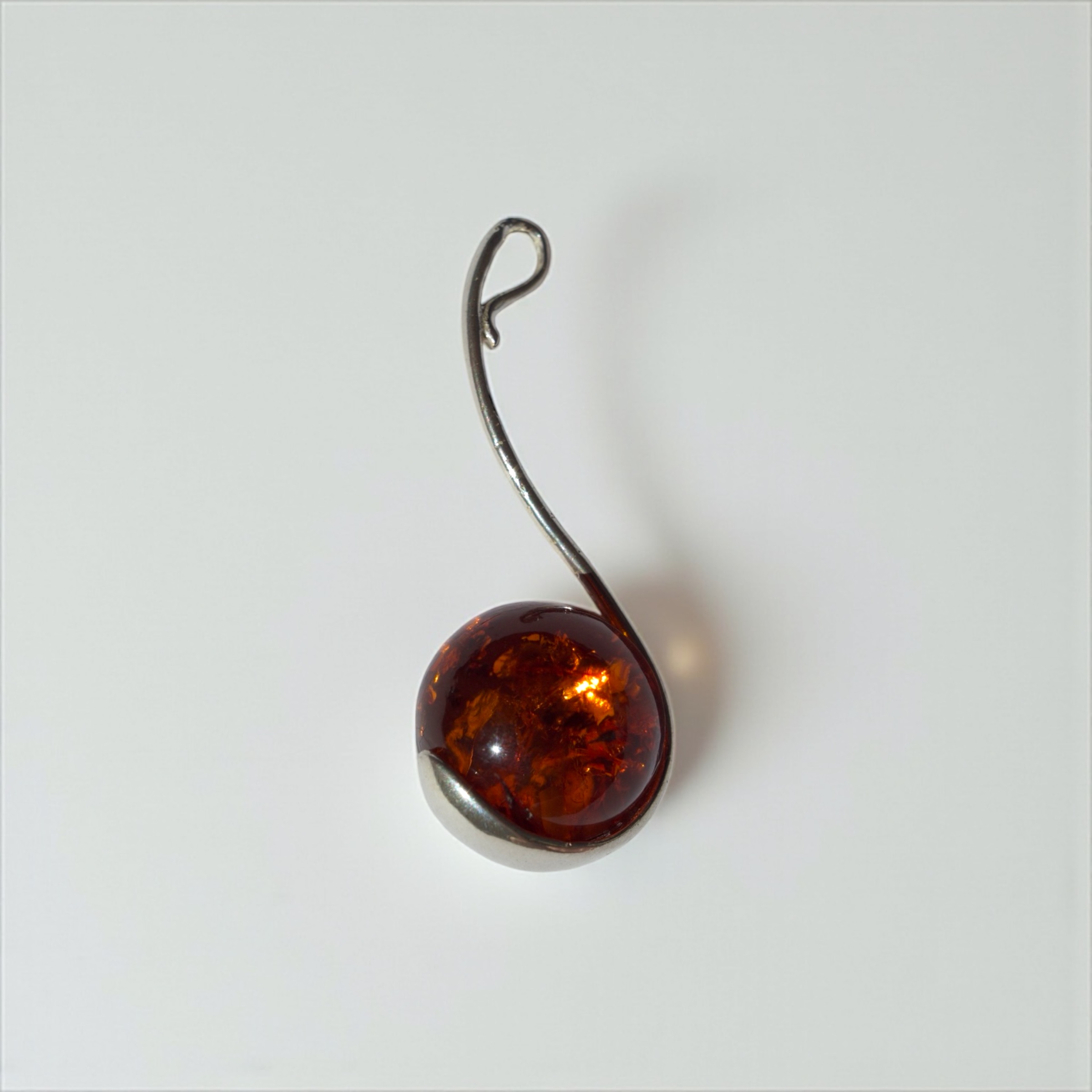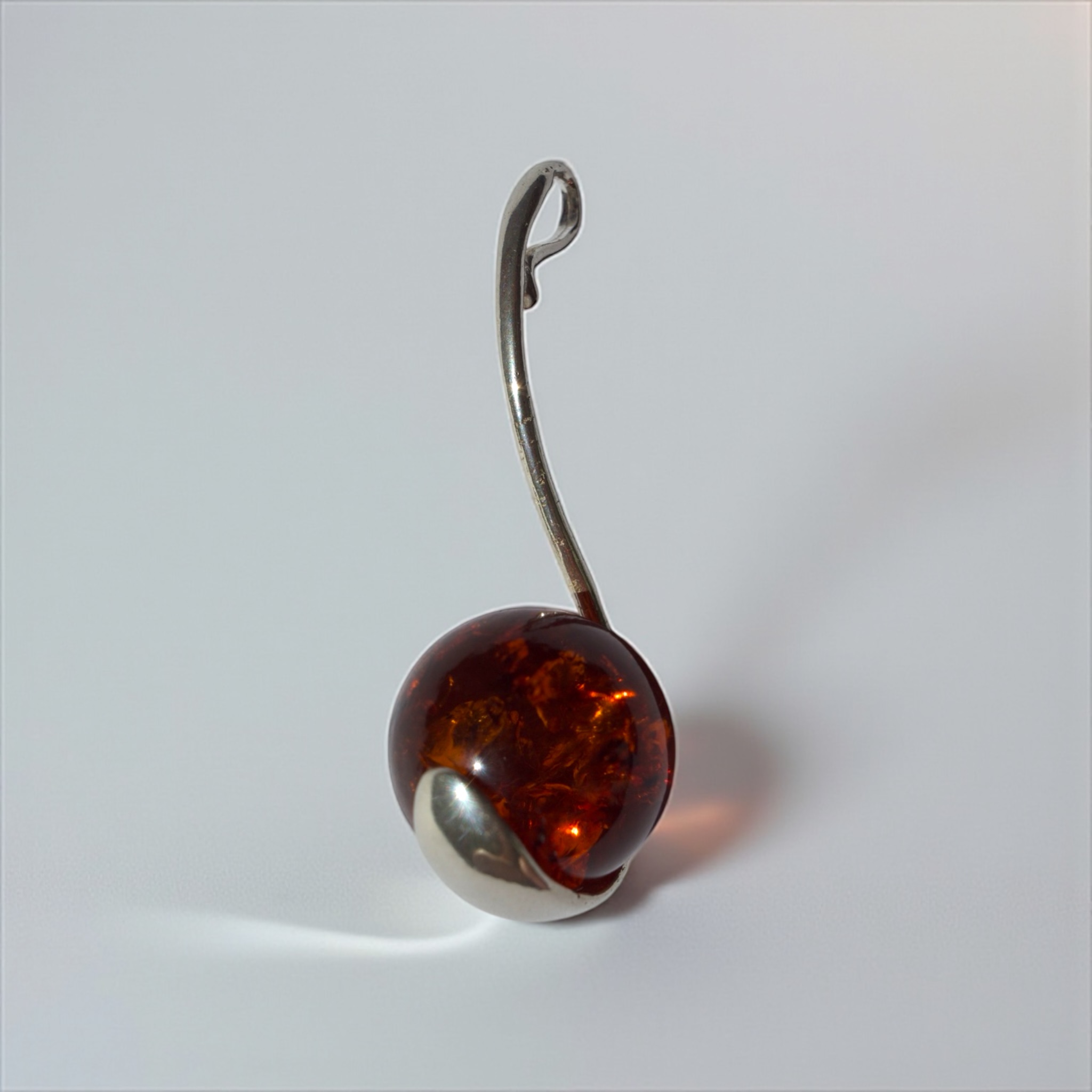 Subtelny wisiorek o lekkiej, eleganckiej formie. Jego centralnym elementem jest kulisty bursztyn bałtycki w ciepłym koniakowym kolorze, oprawiony w delikatne srebro, które tworzy kształt przypominający łodyżkę. Minimalistyczny design sprawia, że biżuteria doskonale pasuje zarówno do codziennych, jak i bardziej eleganckich stylizacji.