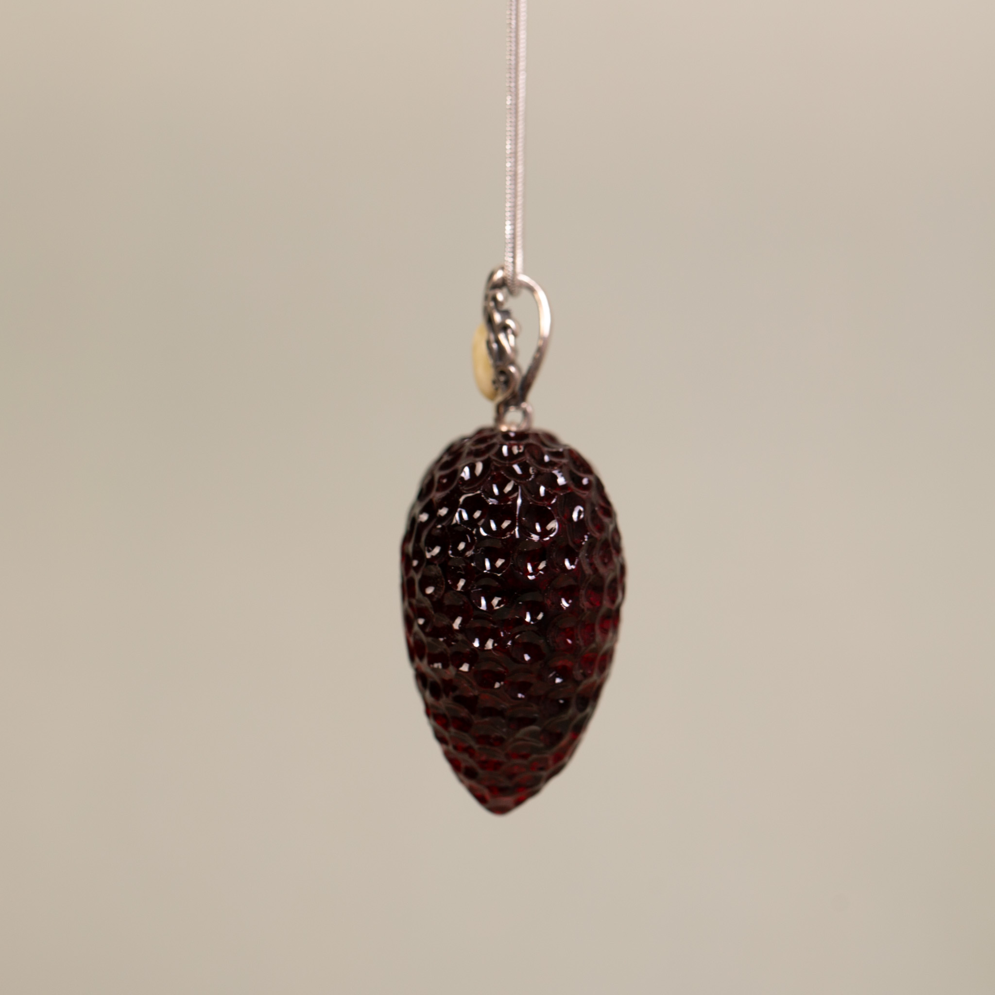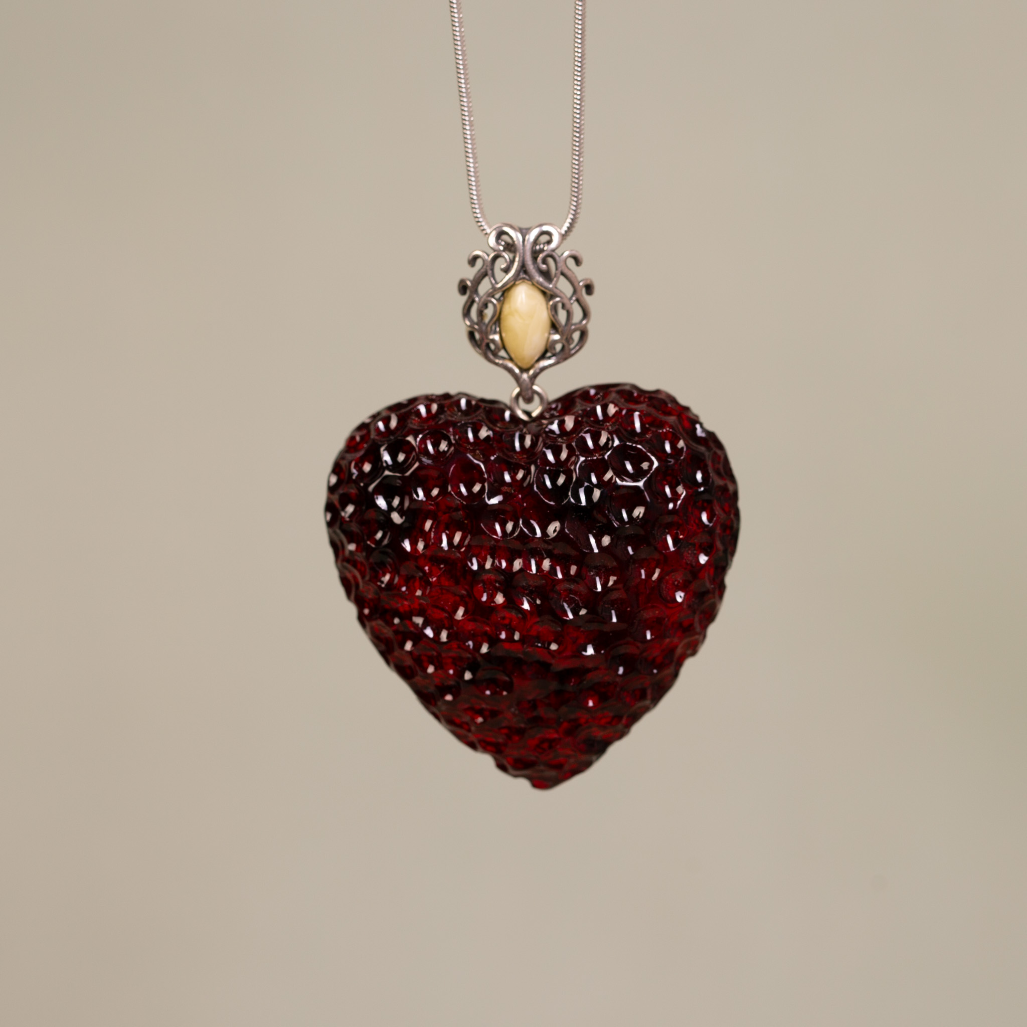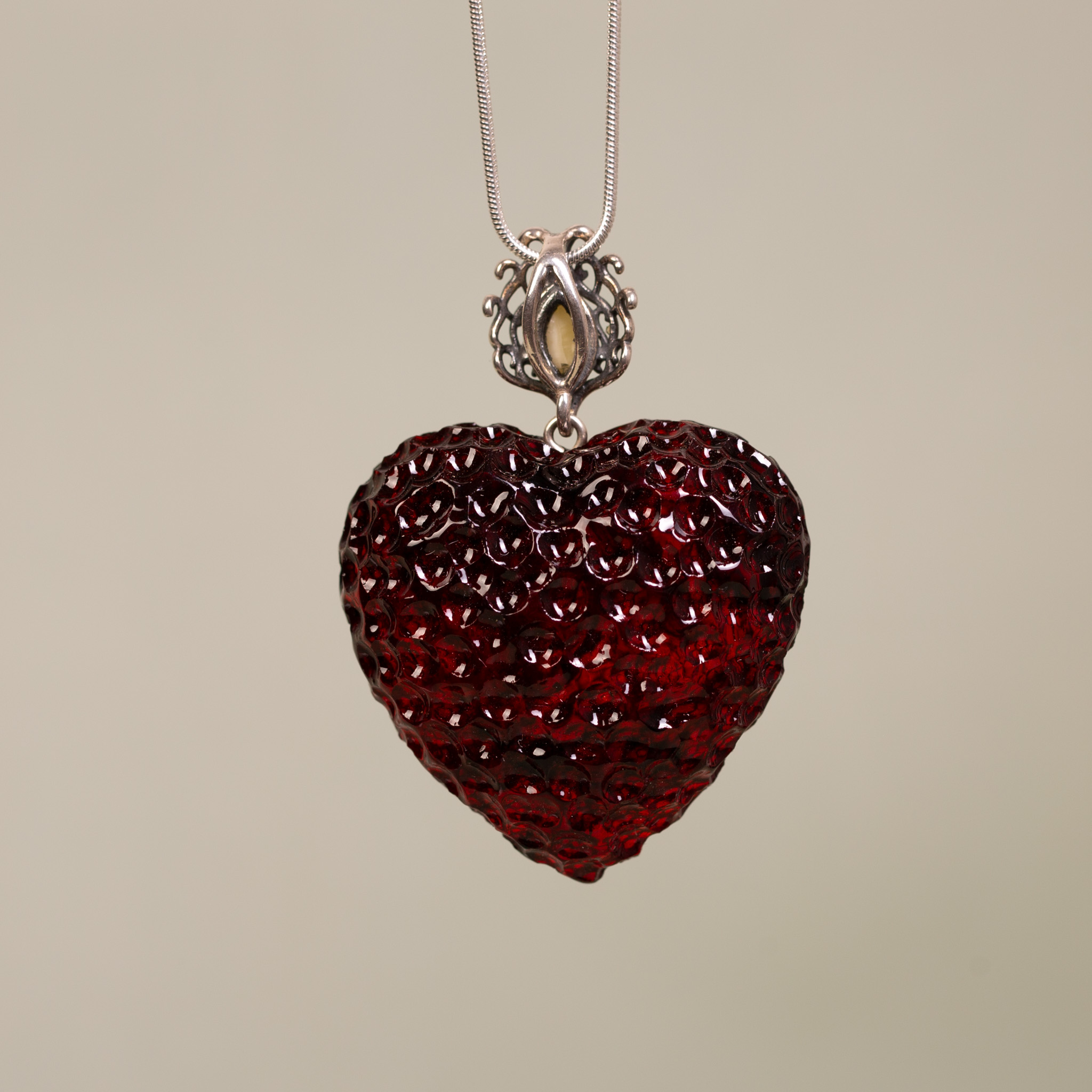 Imponujący, ręcznie rzeźbiony wisior z bursztynu bałtyckiego w kształcie serca, barwionego na głęboki, winny odcień czerwieni. Unikatowa, fakturowana struktura oraz soczysta barwa sprawiają, że kamień kształtem przypomina dojrzałą truskawkę. Całość wieńczy ozdobna, srebrna krawatka z subtelnym akcentem miodowego bursztynu.