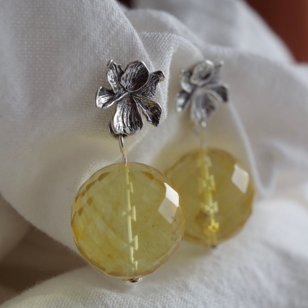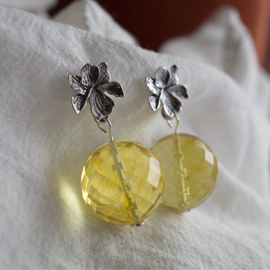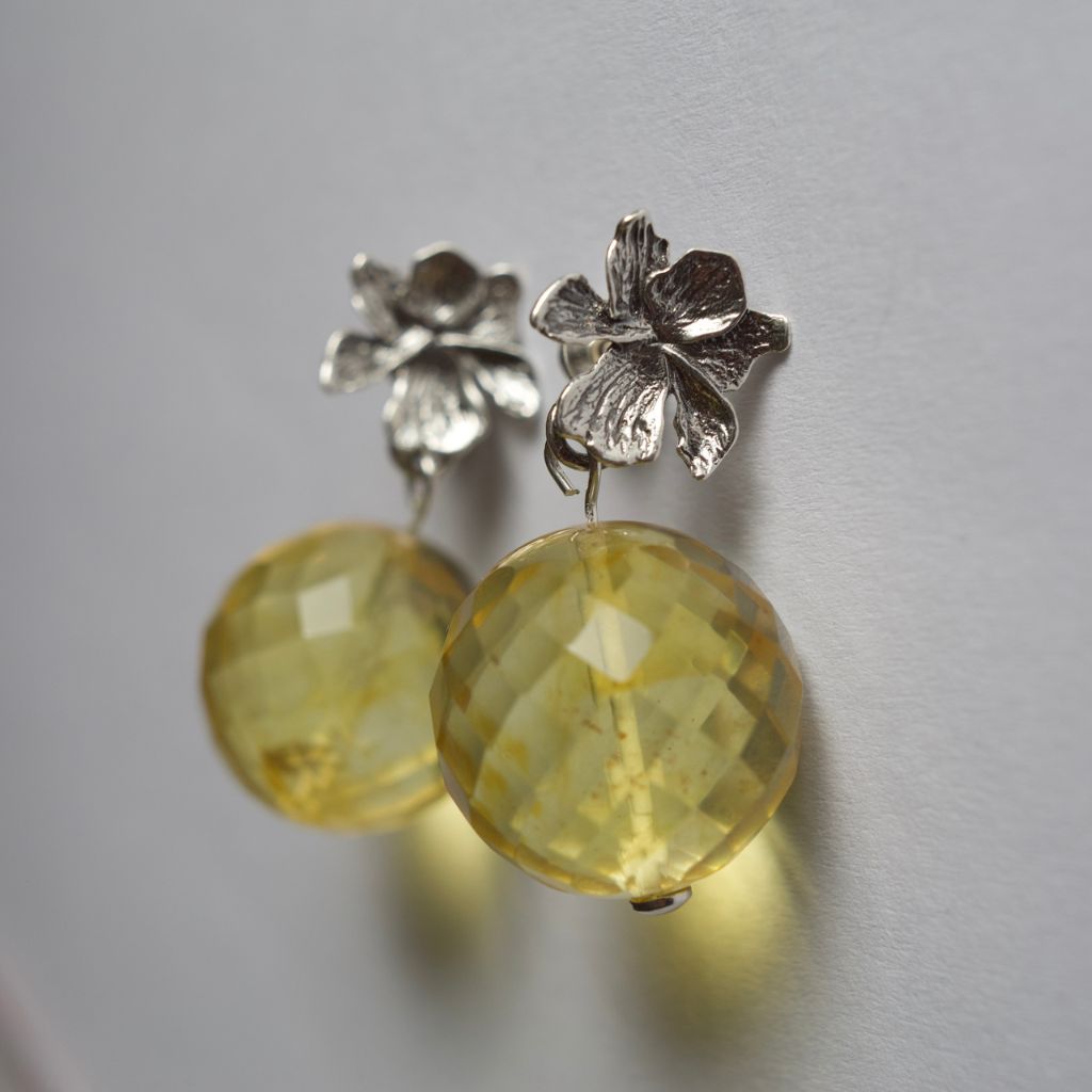 Subtelne i bardzo świetliste. Fasetowane kule bursztynu w jasnym, miodowym odcieniu odbijają światło jak kryształki, a srebrne kwiaty miękko dopełniają kompozycję. Lekka, romantyczna forma, która rozjaśni każdy profil i pięknie pracuje przy ruchu.