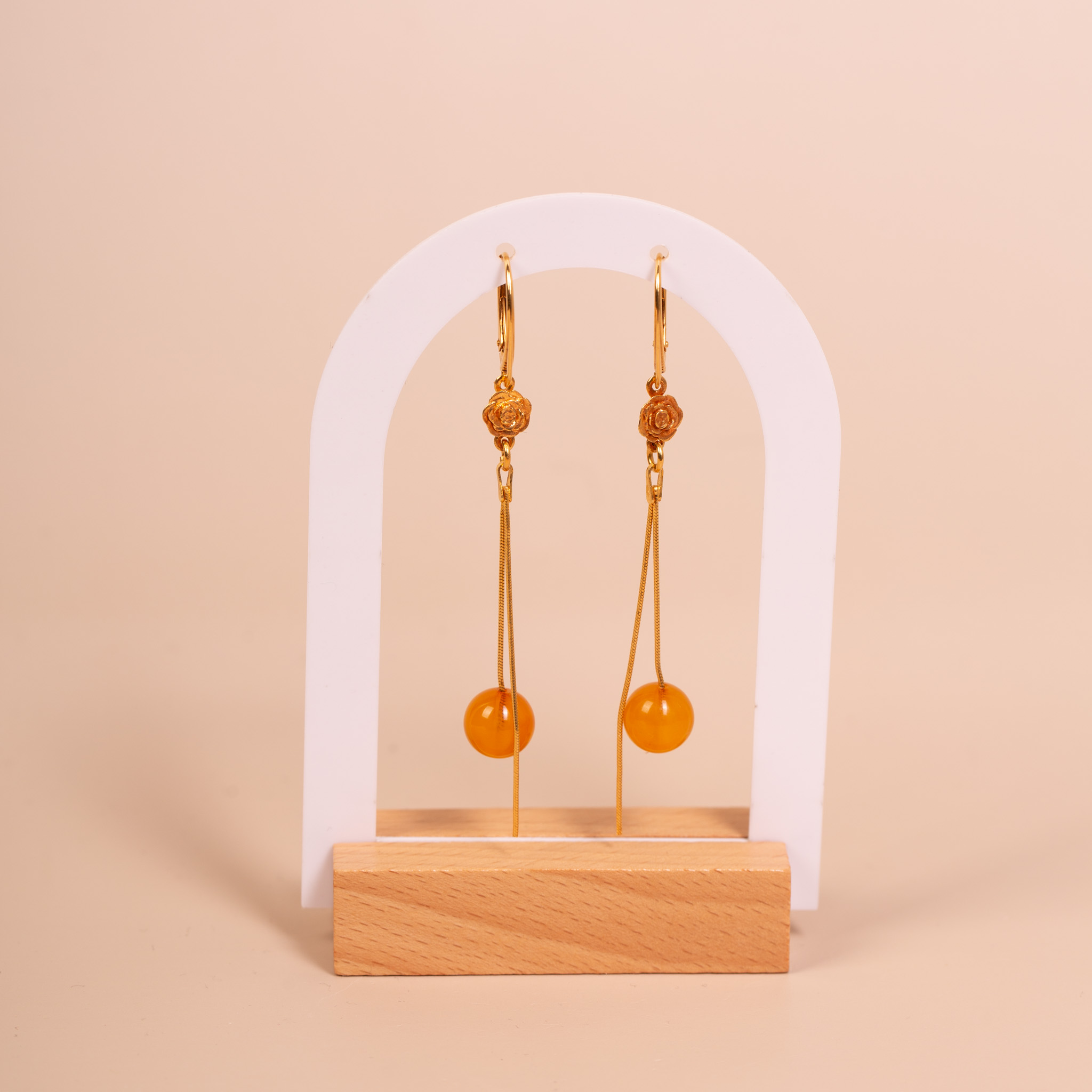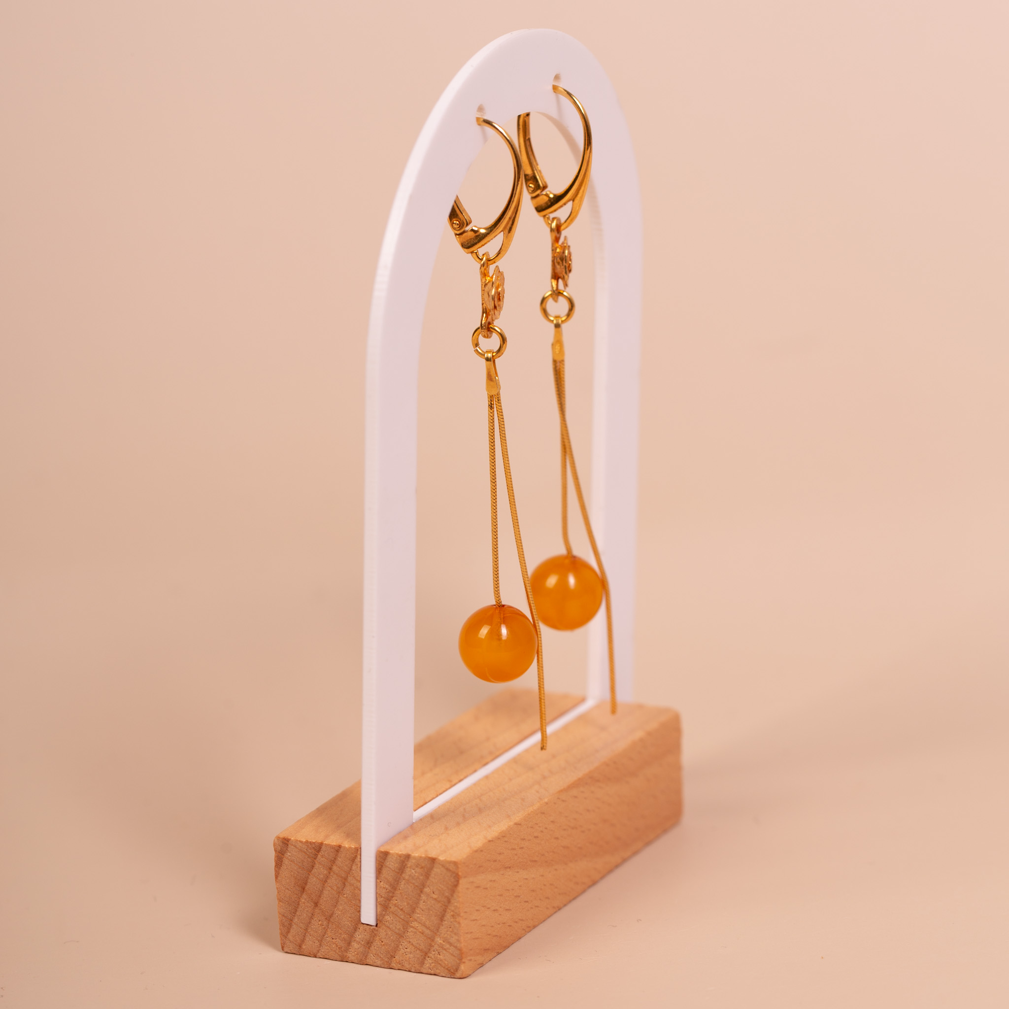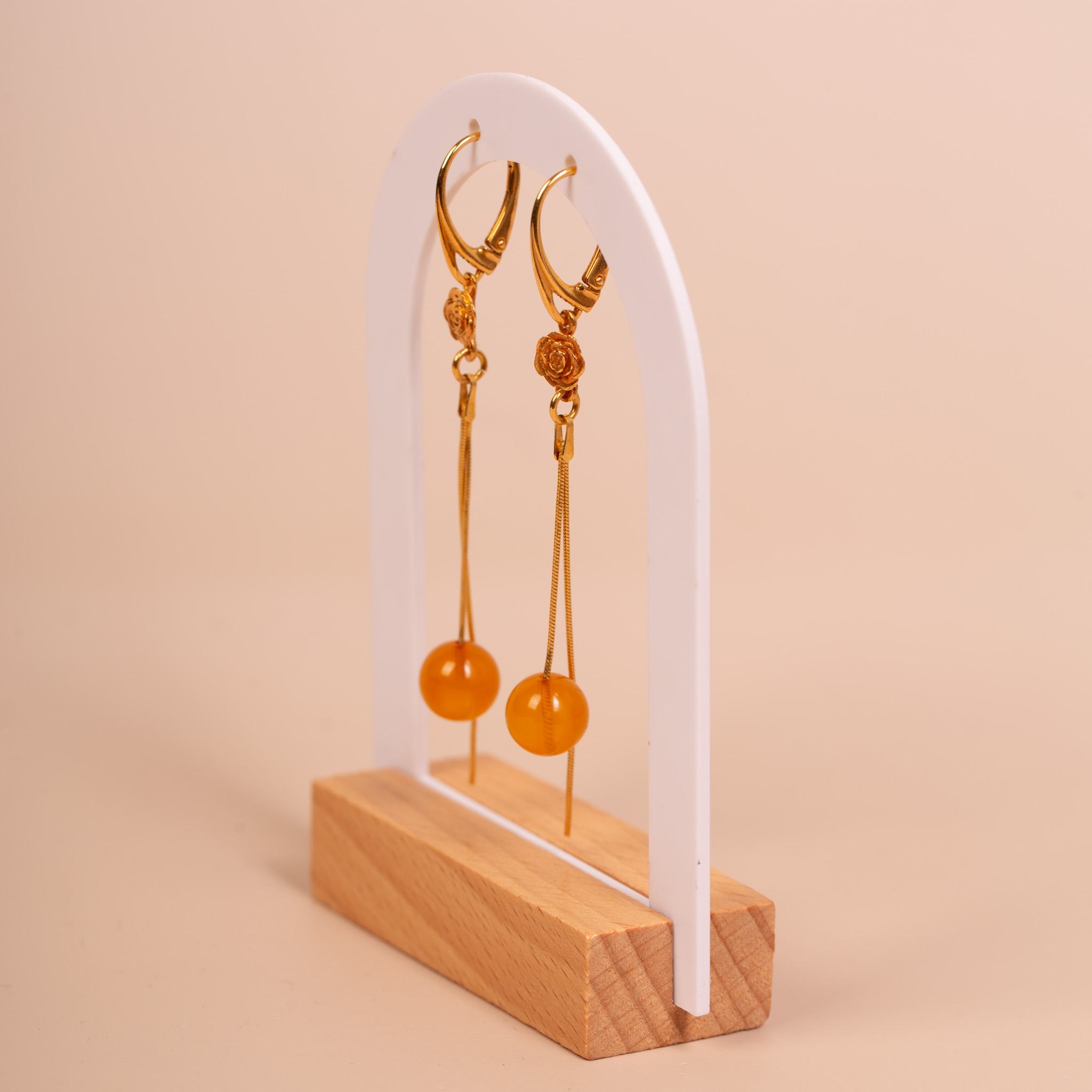 Eleganckie, wiszące kolczyki wykonane ze srebra próby 925, pokrytego warstwą złota. Projekt łączy w sobie klasyczną formę z subtelnym, romantycznym detalem. Głównym elementem biżuterii są idealnie gładkie kulki naturalnego bursztynu bałtyckiego o średnicy 1 cm, w ciepłym, miodowym odcieniu. Bursztyny zostały zawieszone na delikatnych łańcuszkach, które wieńczy misternie wykonany, ozdobny kwiat.