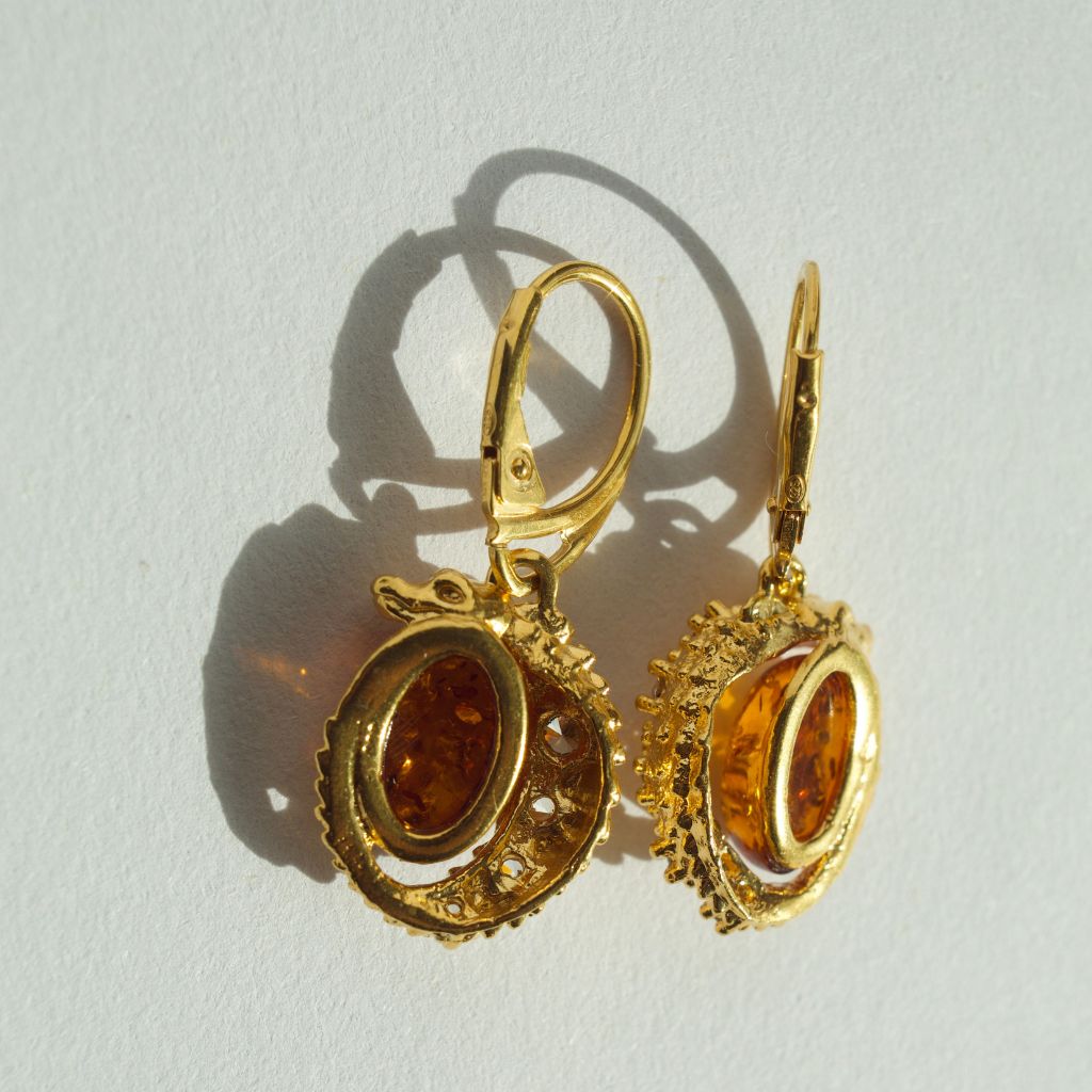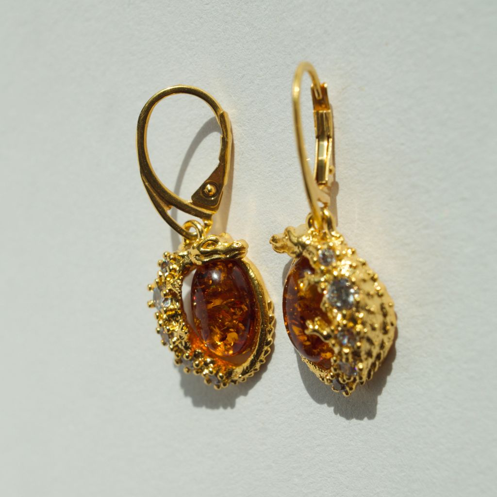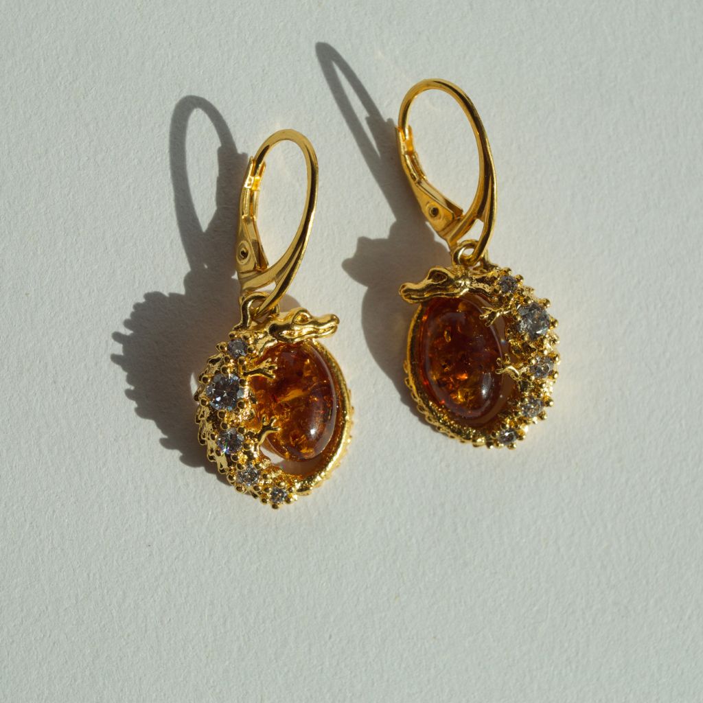 Kolczyki w wyjątkowym motywie krokodyla, w których bursztyn bałtycki osadzony został w złoconej oprawie, ozdobionej błyszczącymi cyrkoniami. Niezwykłe połączenie zwierzęcego symbolu z elegancją bursztynu tworzy biżuterię pełną charakteru i oryginalności. To dodatek, który przyciąga spojrzenia i podkreśla indywidualny styl.