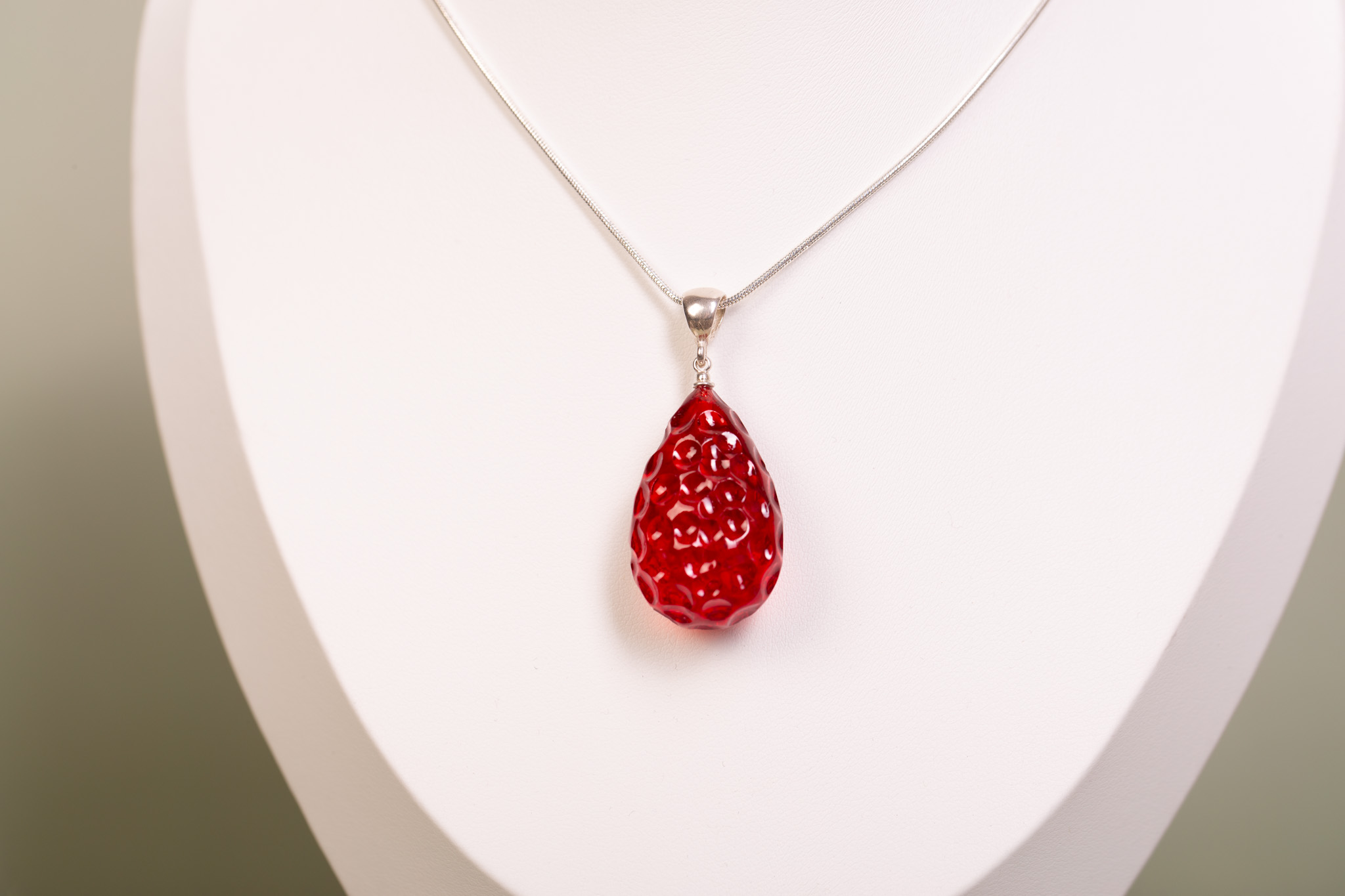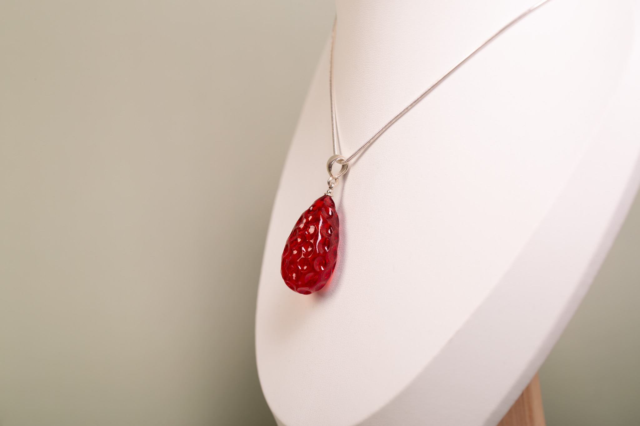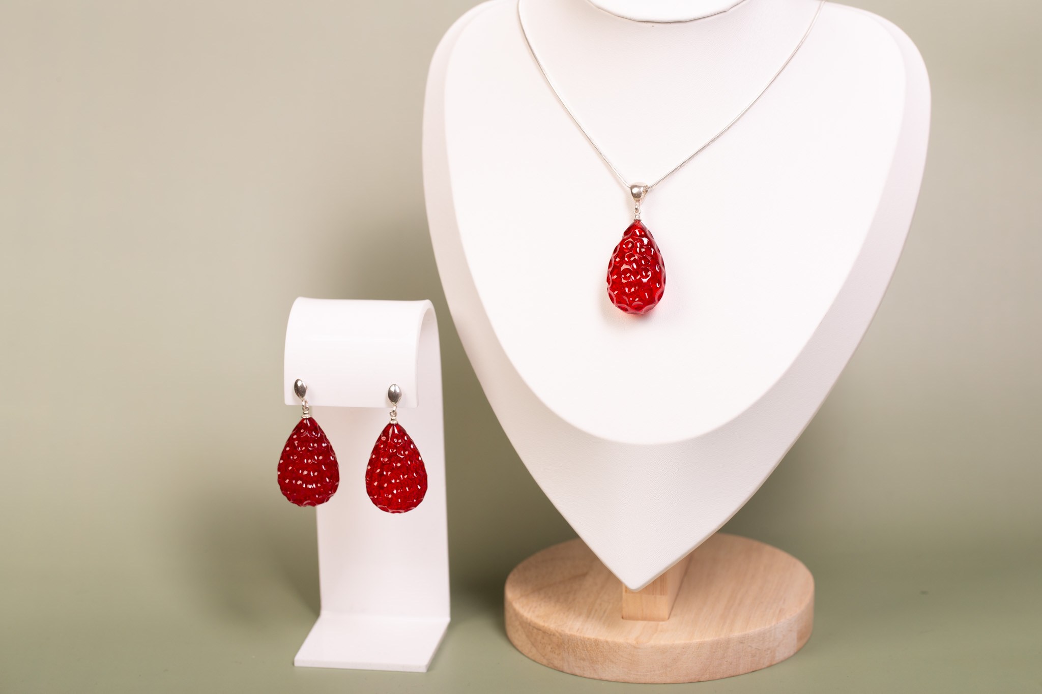 Artystyczny zestaw składający się z wisiorka oraz kolczyków na sztyfcie, wykonany z bursztynu bałtyckiego barwionego na intensywny, soczysty odcień czerwieni. Bursztyny zostały ręcznie wyrzeźbione, dzięki czemu ich trójwymiarowa faktura oraz kształt do złudzenia przypominają dojrzałe owoce malin. To radosna i energetyczna biżuteria o unikatowym charakterze.