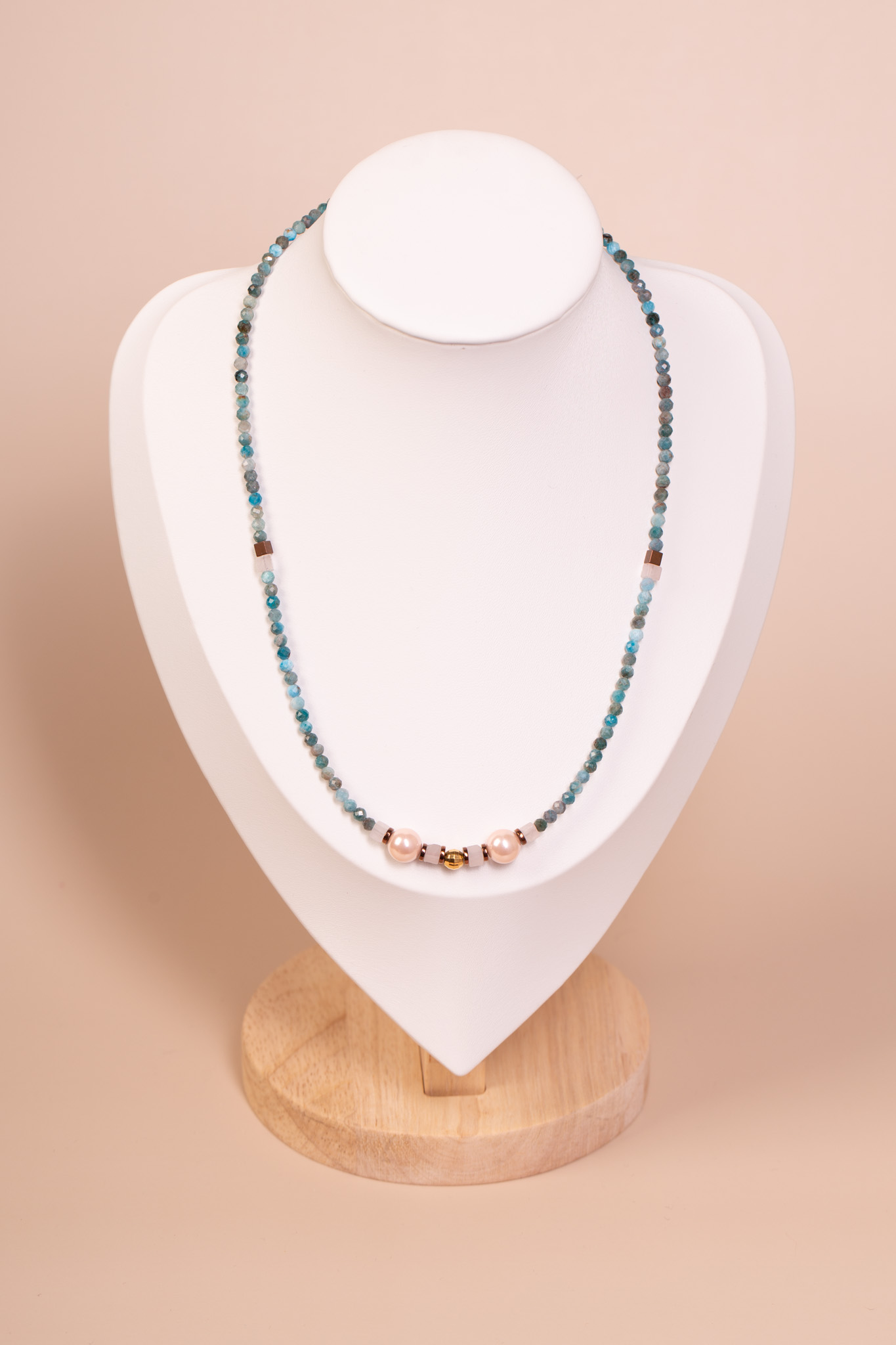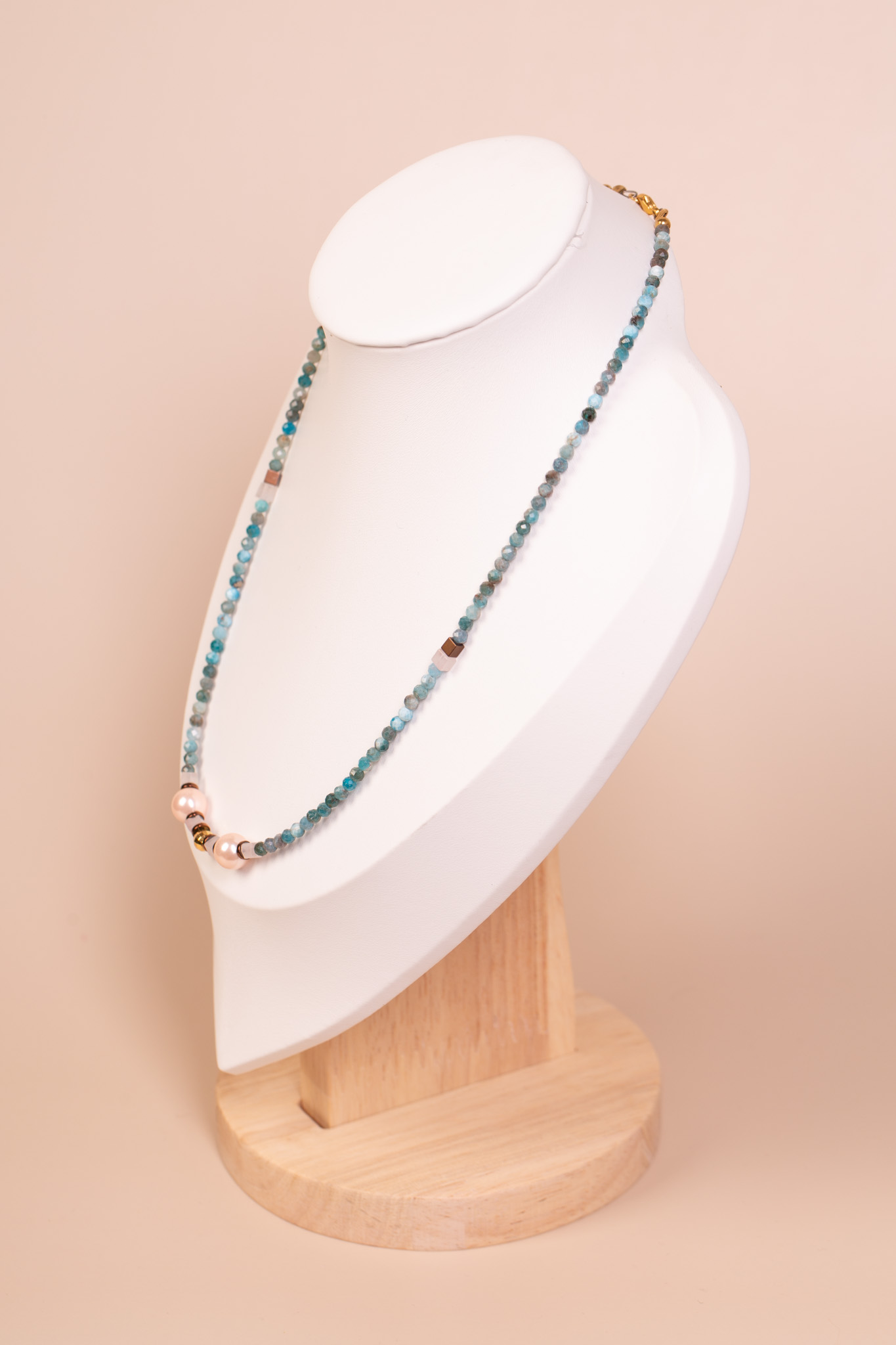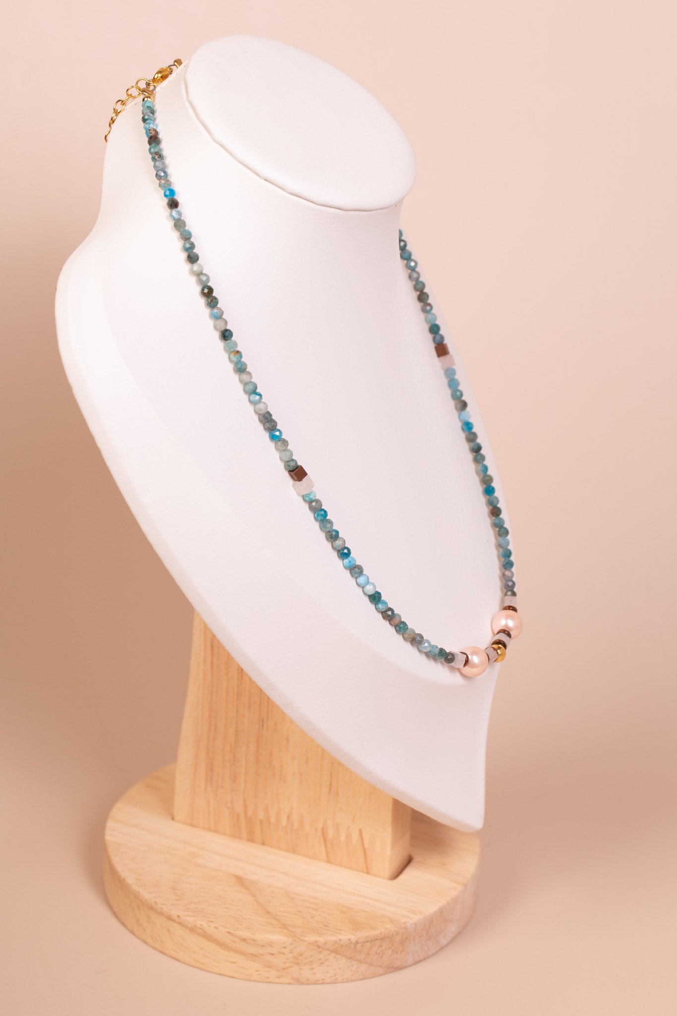 Forma i charakter: Drobne kamienie tworzą lekką, równą linię, a w centrum wzrok przyciąga połączenie dwóch pereł, złotego elementu i ciemniejszych kostek. Amazonit nadaje całości świeży, morski charakter, perły – odrobinę klasyki, a brązowy hematyt wprowadza spokojny, ziemisty akcent. Naszyjnik jest subtelny, ale zwraca uwagę zestawieniem kolorów.