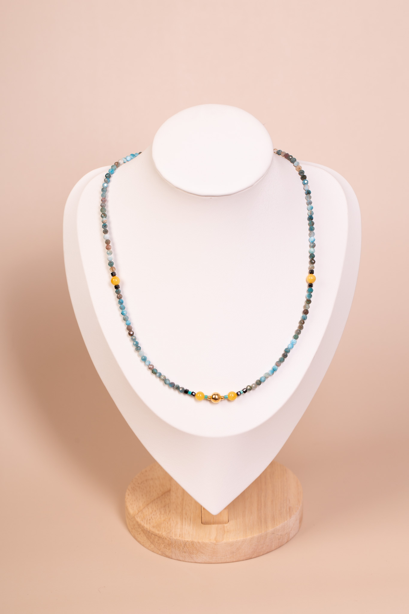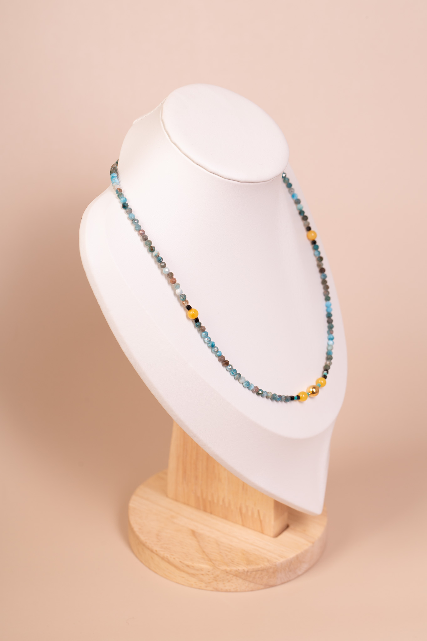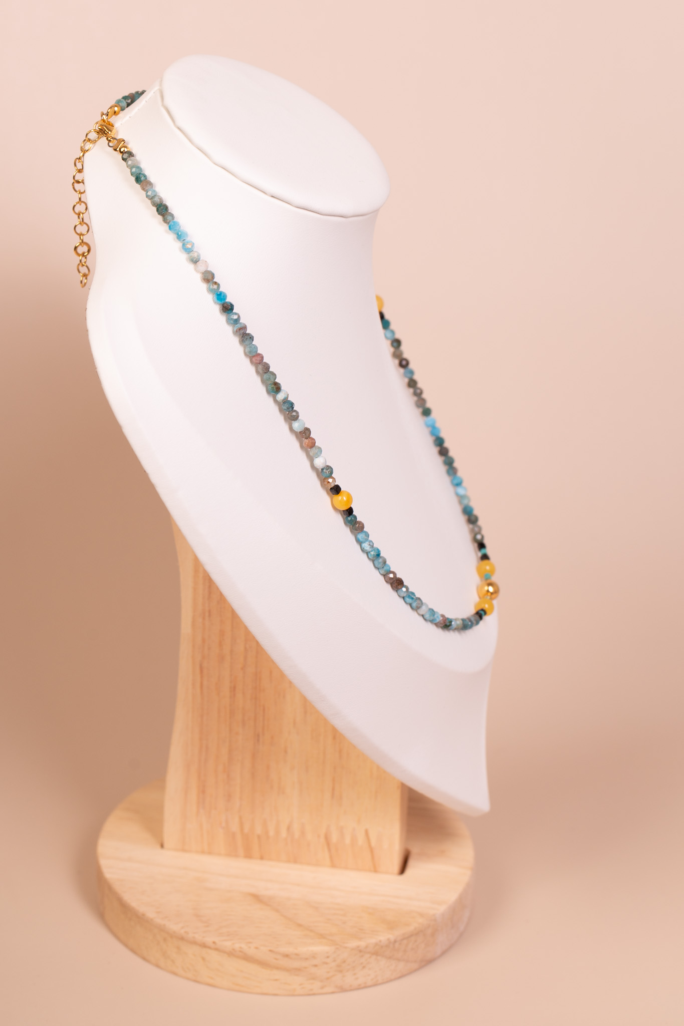 Subtelny, ręcznie wykonany naszyjnik na stalowej lince, stanowiący świeże połączenie chłodnych błękitów i słonecznego ciepła. Główną linię tworzą drobne, fasetowane kuleczki apatytu o głębokim, morskim odcieniu, które efektownie załamują światło. Kompozycję rozświetlają naturalne, żółte bursztyny bałtyckie oraz złote akcenty, tworząc biżuterię o lekkim, wakacyjnym charakterze.