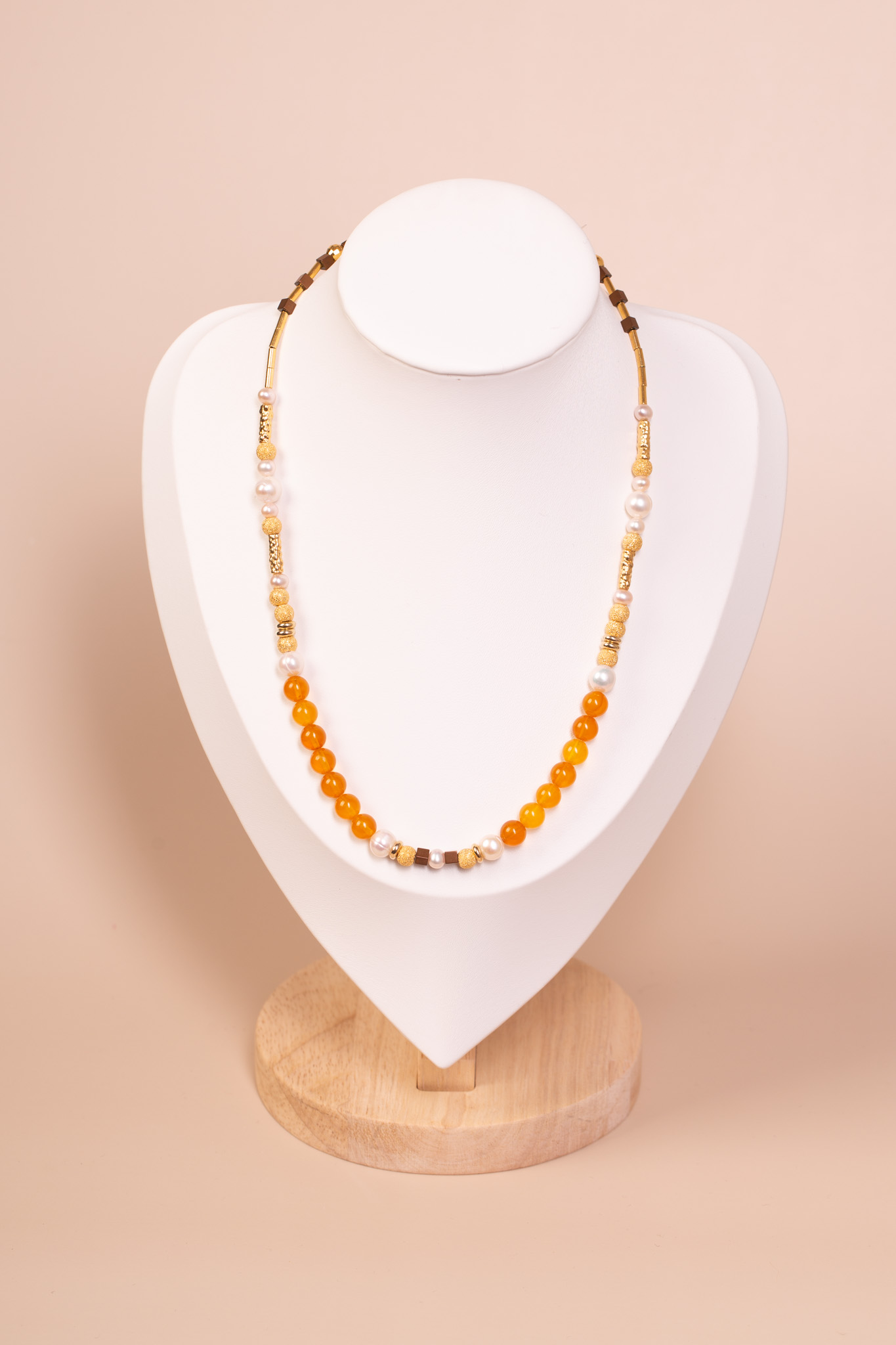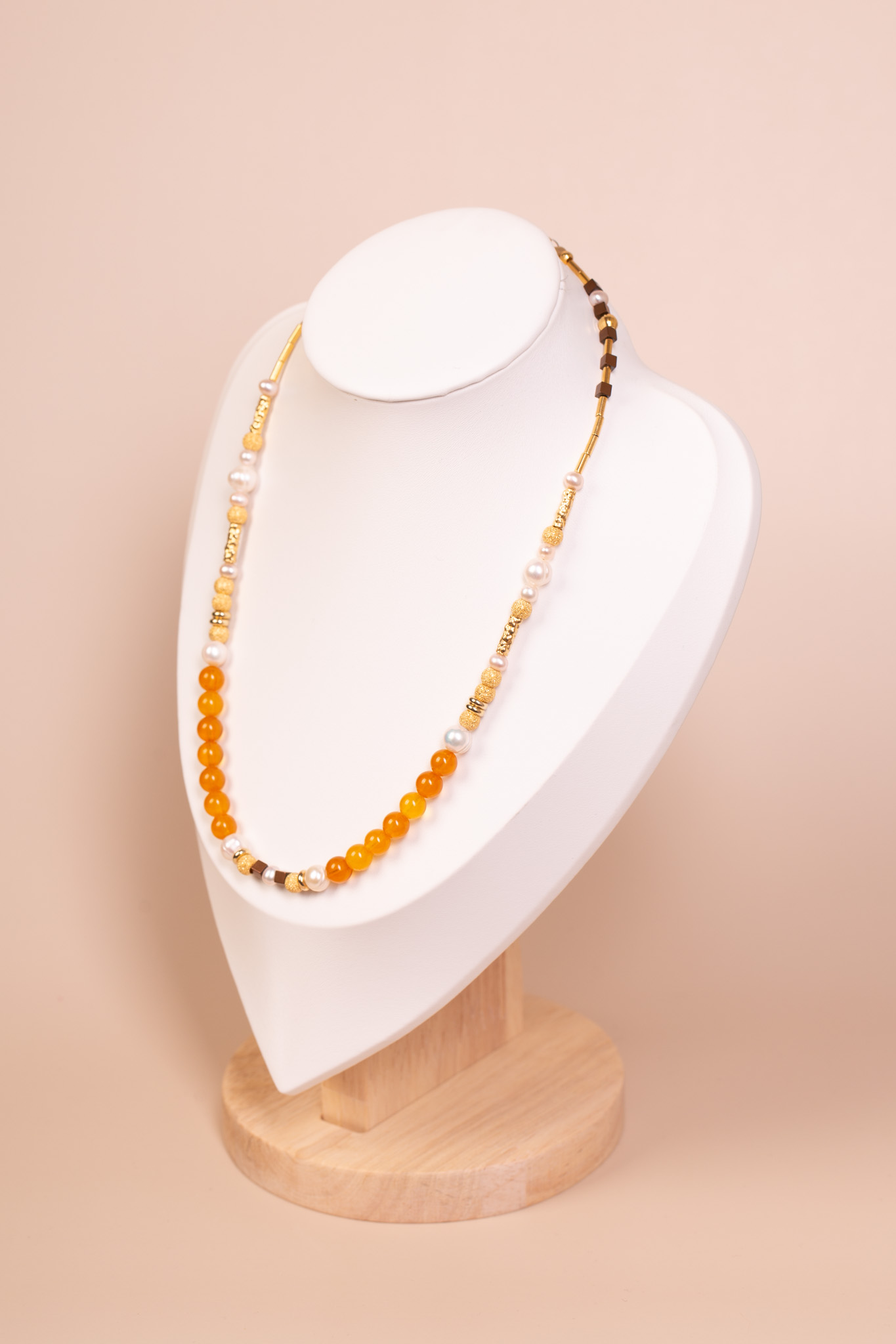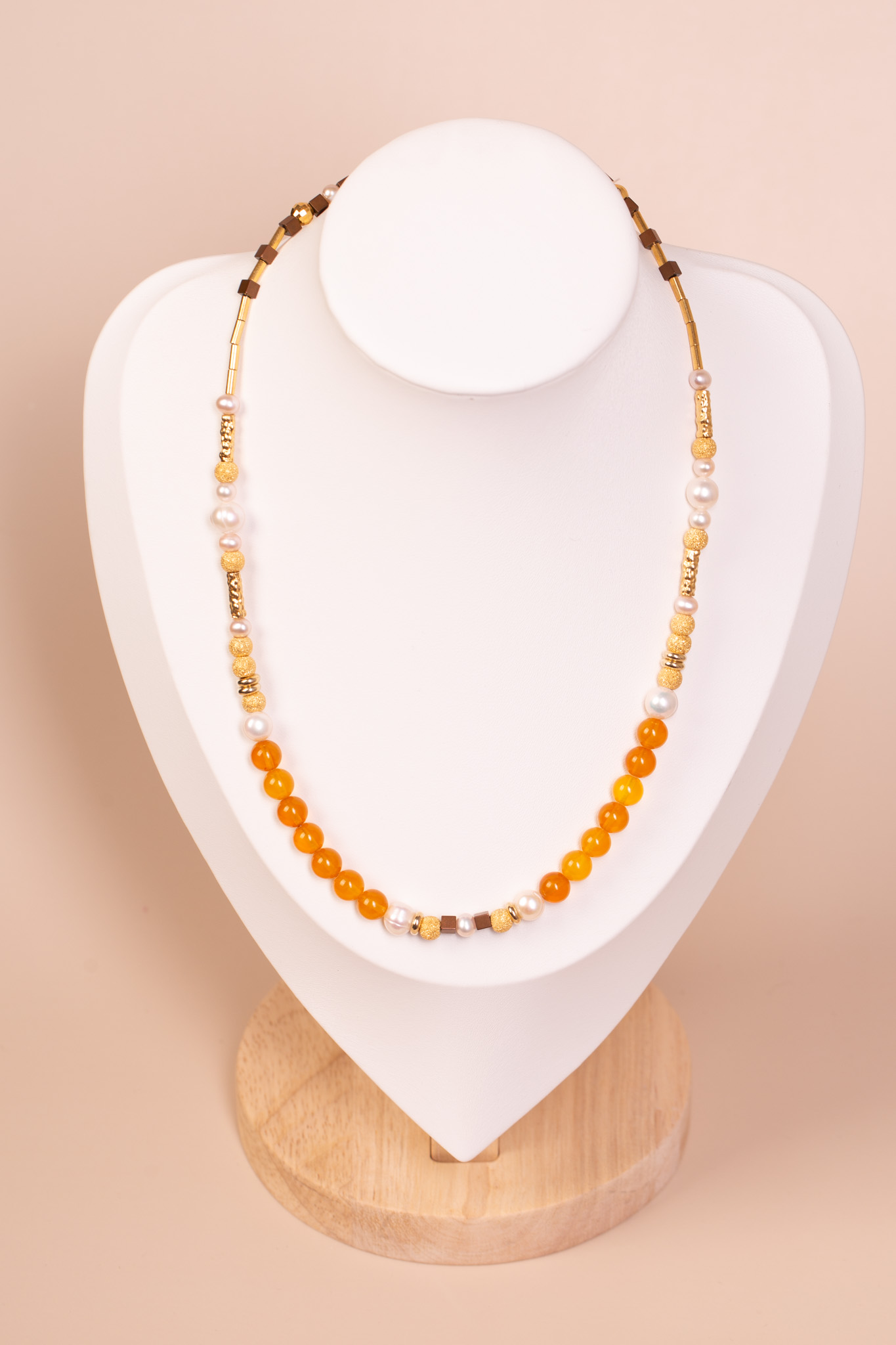 Forma i charakter: Naszyjnik wyróżnia się rytmicznym układem kamieni i ozdobnych detali. Złocone rurki i fakturowane kulki tworzą świetlistą ramę dla bursztynów i pereł, a ciemniejsze akcenty hematytu wprowadzają do projektu spokojny, ziemisty ton. Połączenie słonecznego bursztynu z perłową poświatą tworzy biżuterię niezwykle kobiecą, która doskonale rozświetla dekolt.