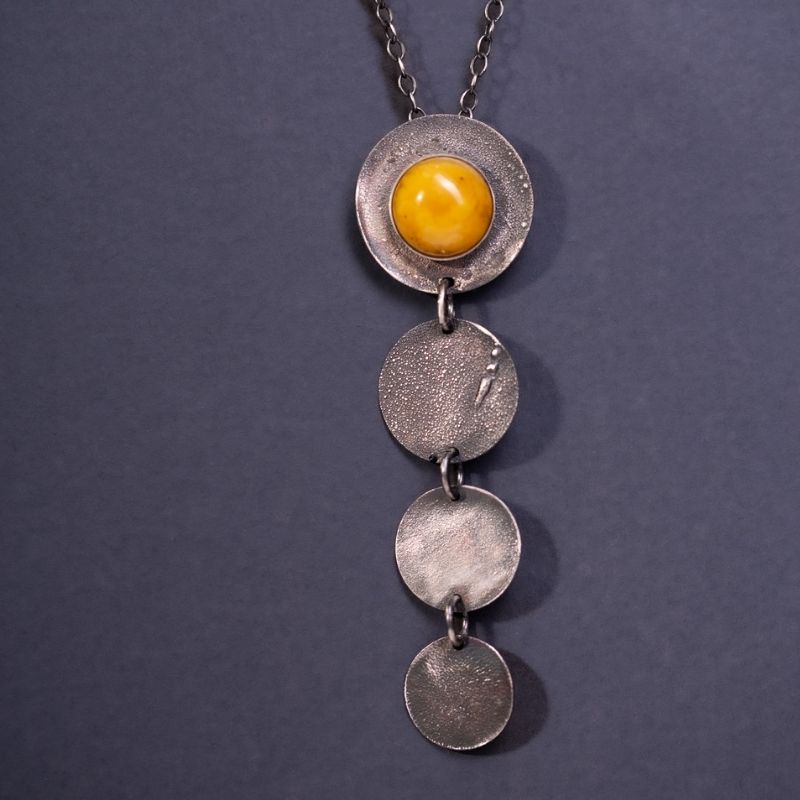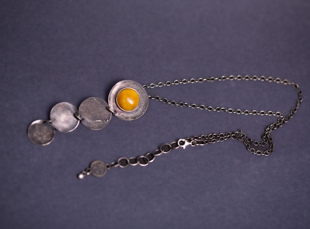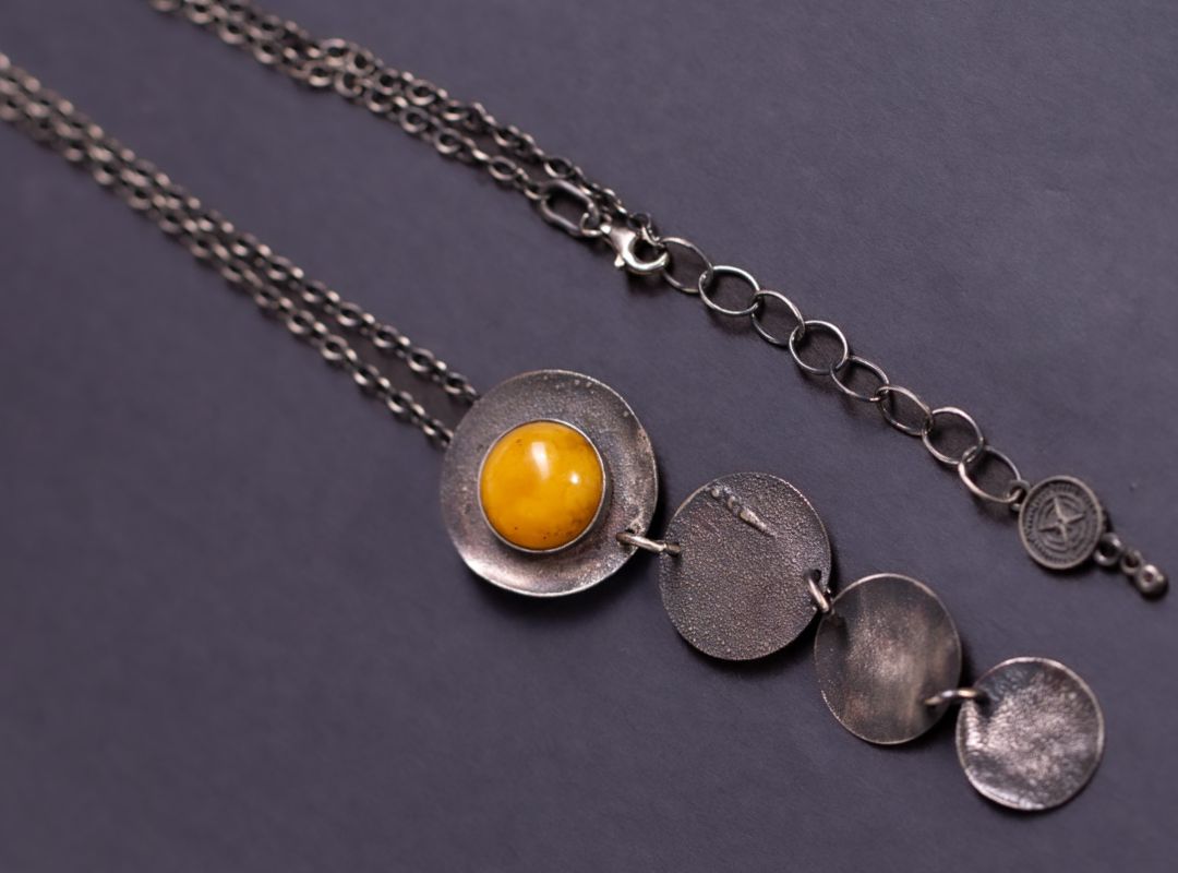 Naszyjnik z kolekcji AURA to kompozycja ręcznie fakturowanych, srebrnych krążków zakończona ciepłą, miodową kroplą bursztynu. Każdy element został uformowany i wykończony ręcznie, dzięki czemu powierzchnie delikatnie migoczą przy ruchu, jakby łapały promienie słońca tylko dla Ciebie. To biżuteria, która uspokaja, dodaje otuchy i pięknie podkreśla dekolt – subtelna, a jednocześnie wyrazista.