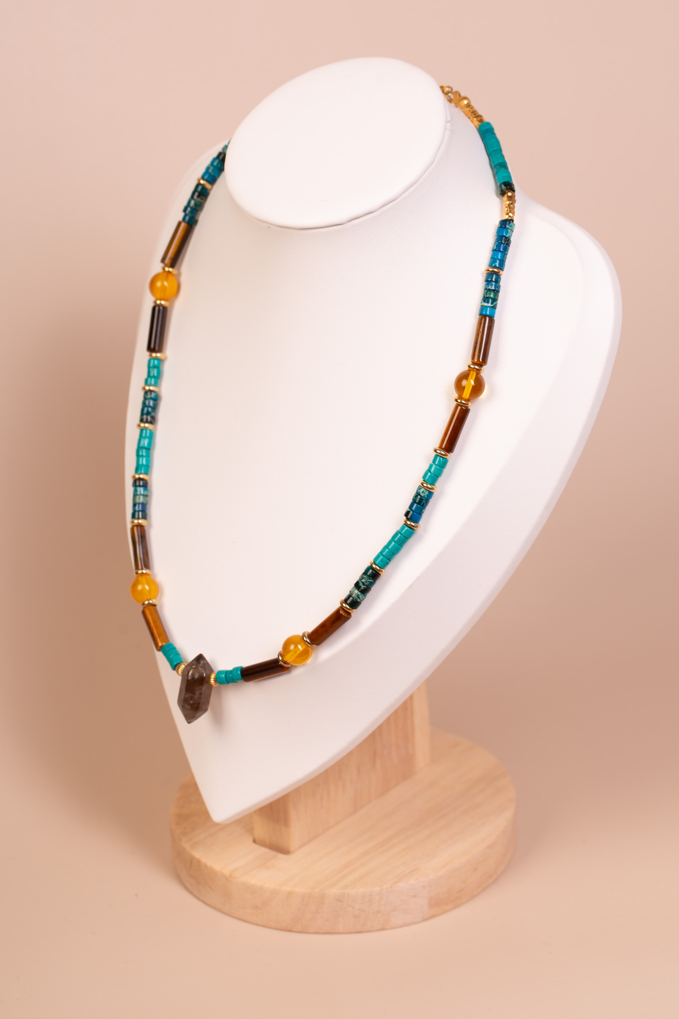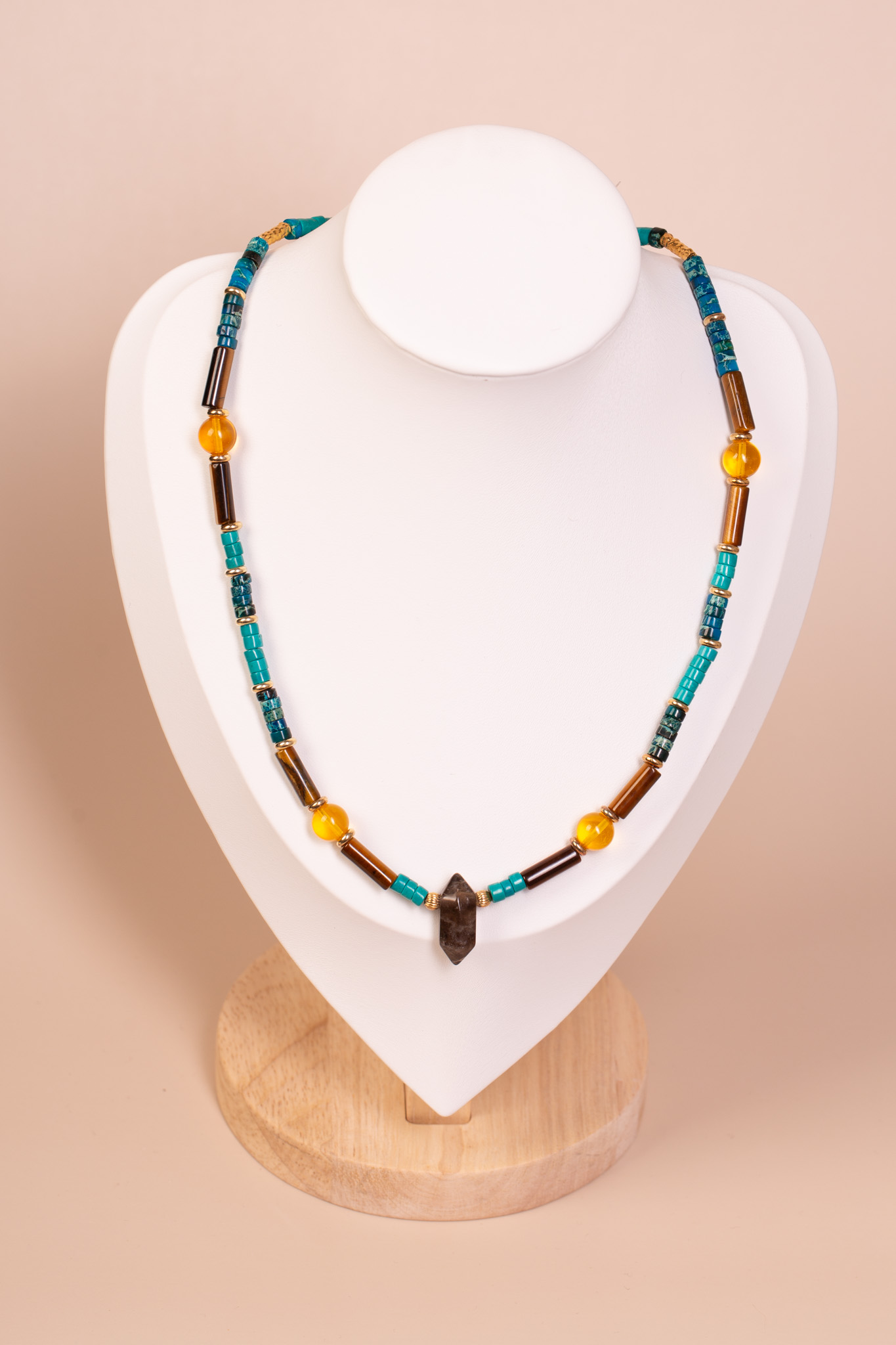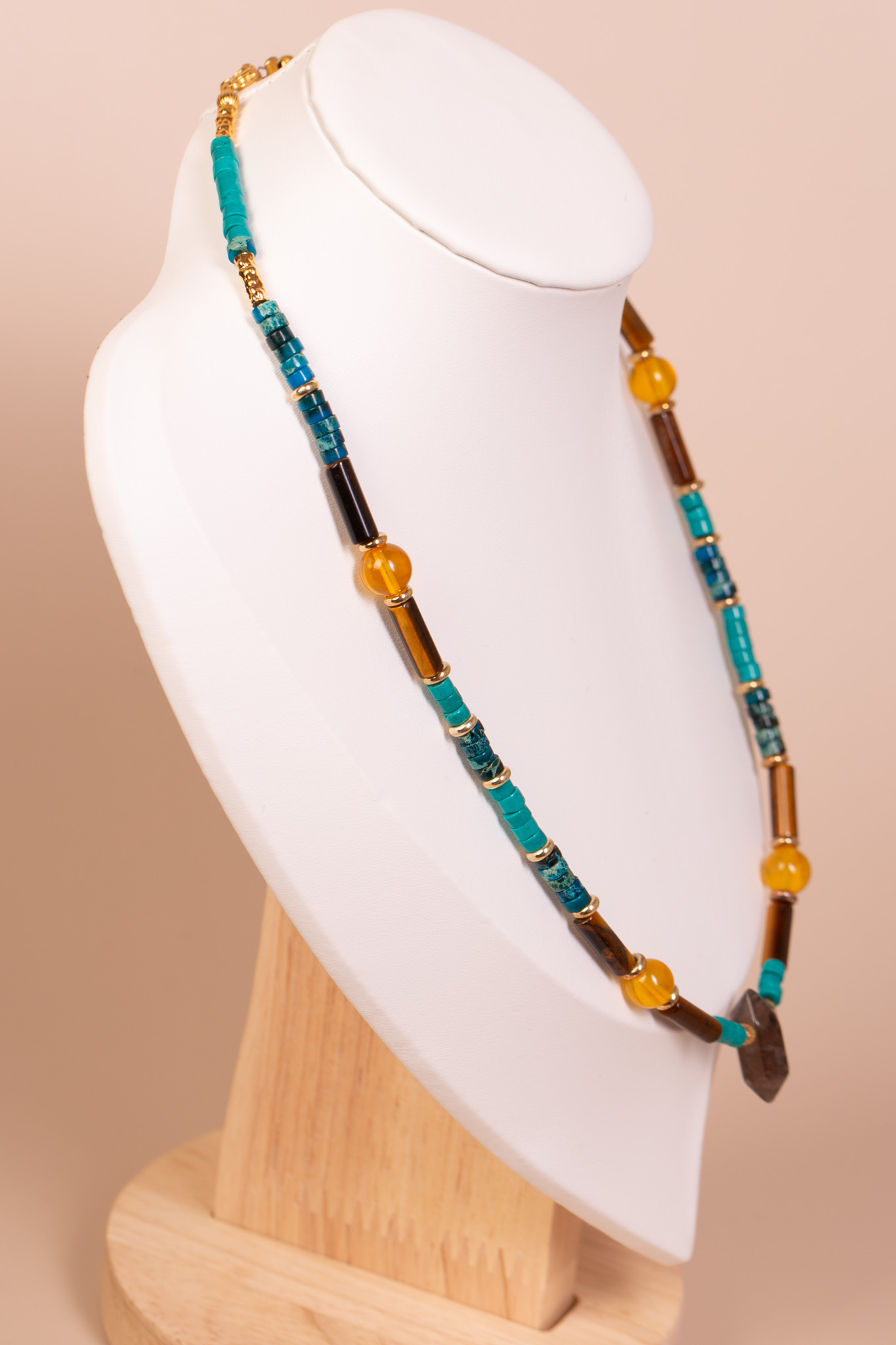 Forma i charakter: Naszyjnik wyróżnia się rytmicznym układem różnorodnych kształtów – od klasycznych kulek, przez cylindryczne rurki, aż po fasetowany kwarc. Połączenie chłodnego turkusu amazonitu z ciepłymi brązami tygrysiego oka i słonecznym blaskiem bursztynu tworzy energetyczną paletę barw. To biżuteria o silnej osobowości, która łączy surowość naturalnych kamieni z jubilerską precyzją wykonania.