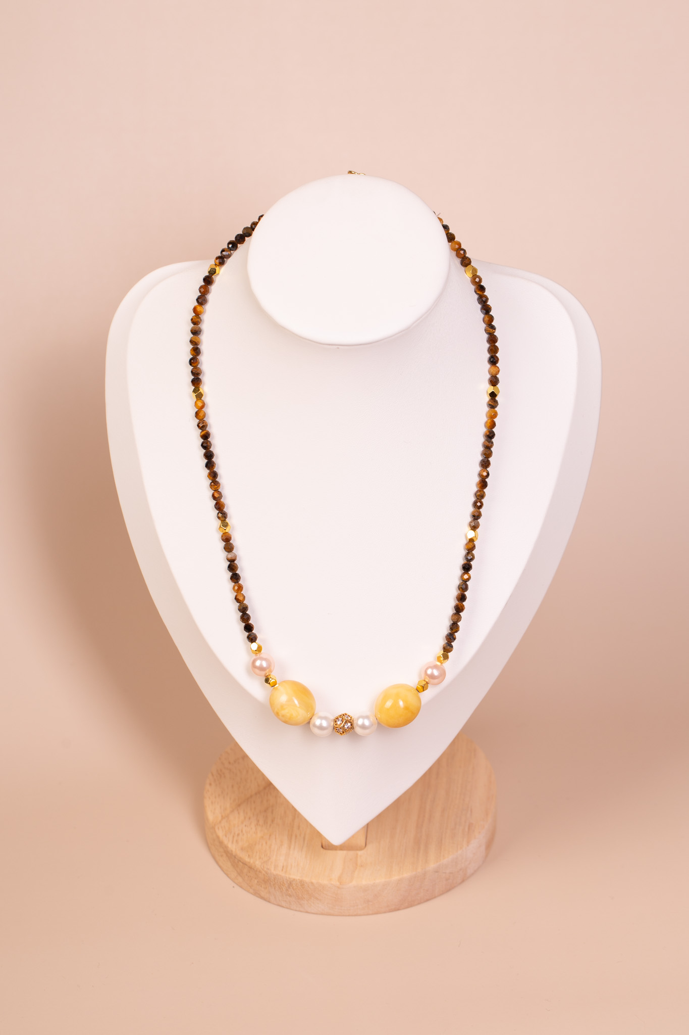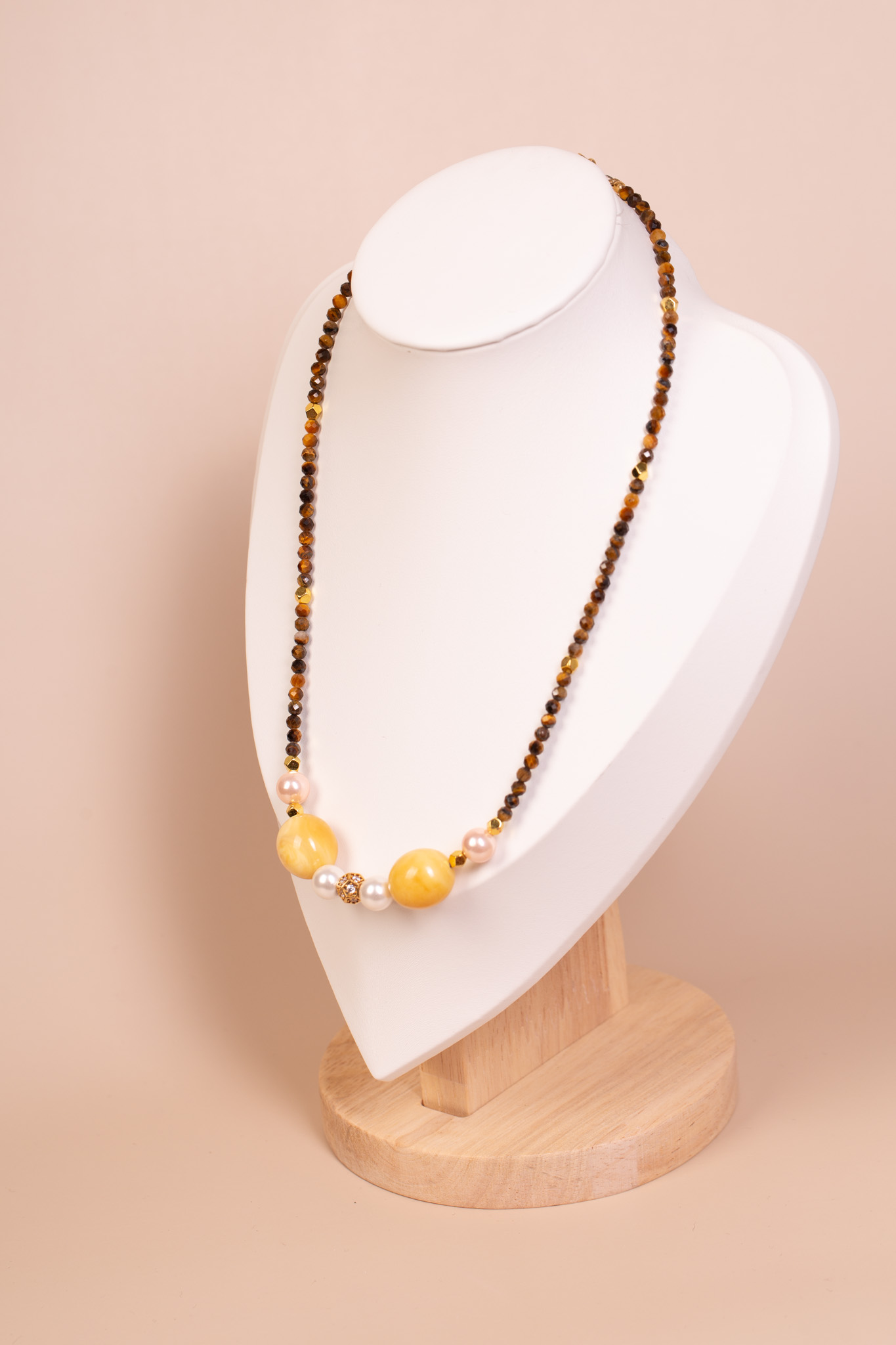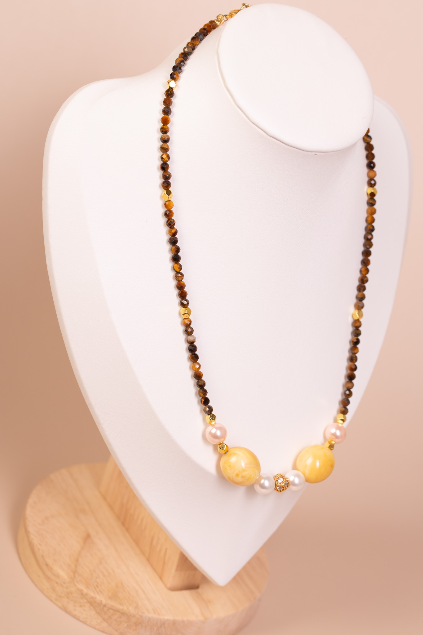 Tygrysie oko (fasetowane) · bursztyn bałtycki (żółty) · perły hodowlane · srebro pozłacane · cyrkonie · długość 44 cm + 4 cm przedłużka · zapięcie karabińczyk · ręczna praca autorska