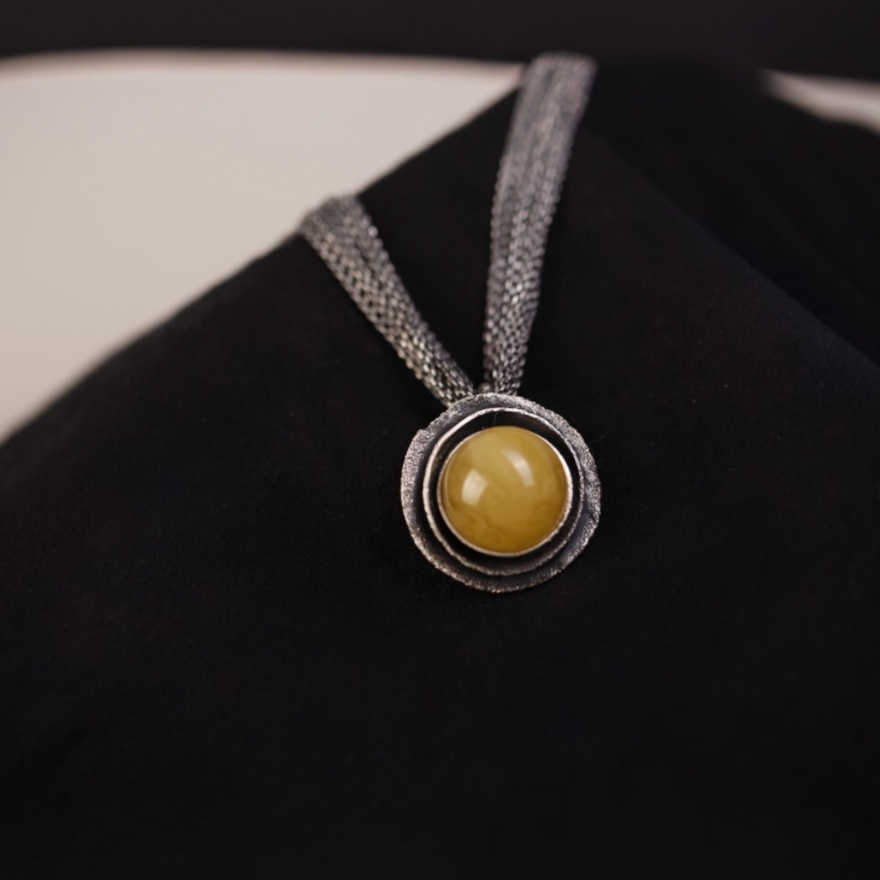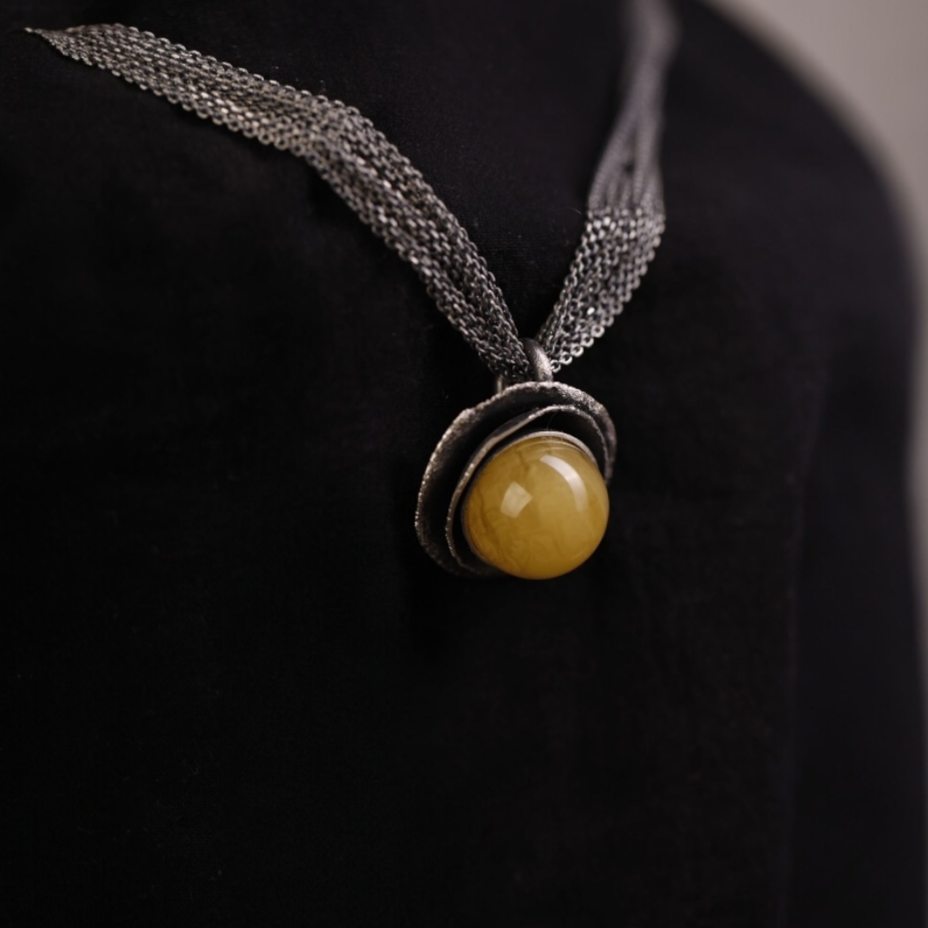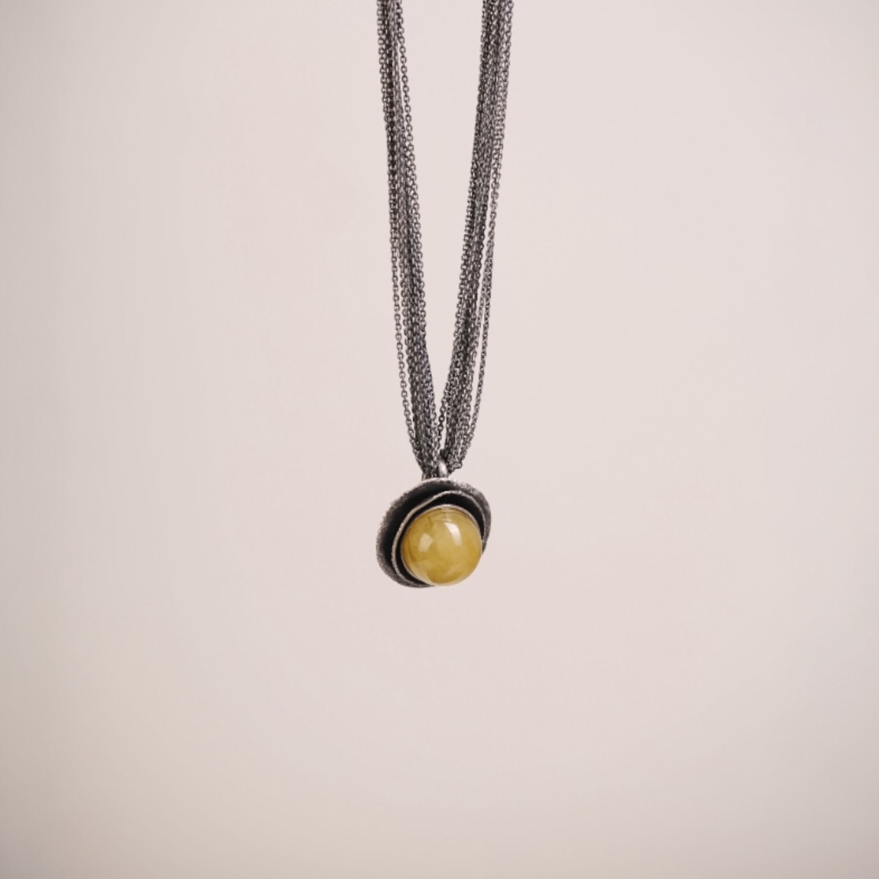 Naszyjnik ręcznie wykonany z jedenastu delikatnych łańcuszków, które miękko układają się na dekolcie, tworząc subtelną kaskadę. W centrum znajduje się autorski wisiorek z bursztynową kulką w mlecznym odcieniu – prosty, a jednocześnie wyrazisty akcent, który pięknie dopełnia codzienne i eleganckie stylizacje.