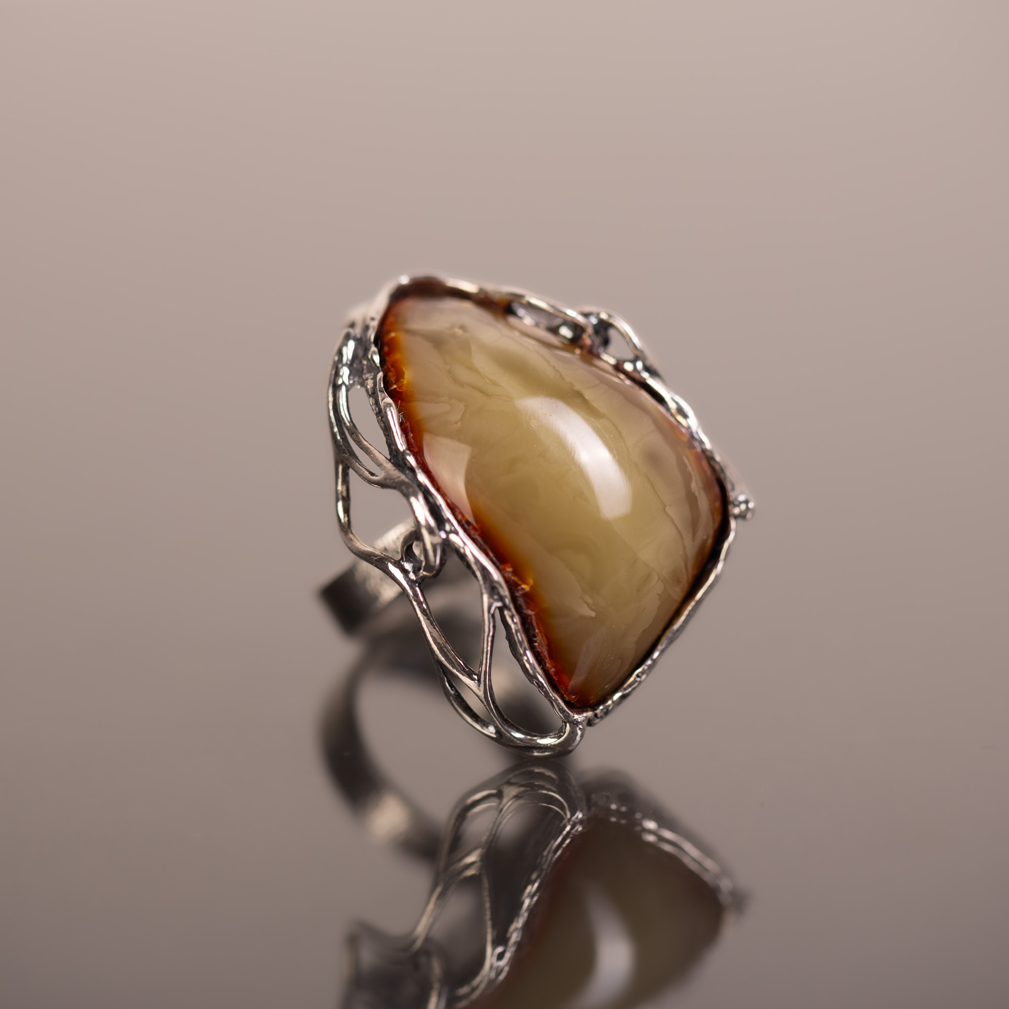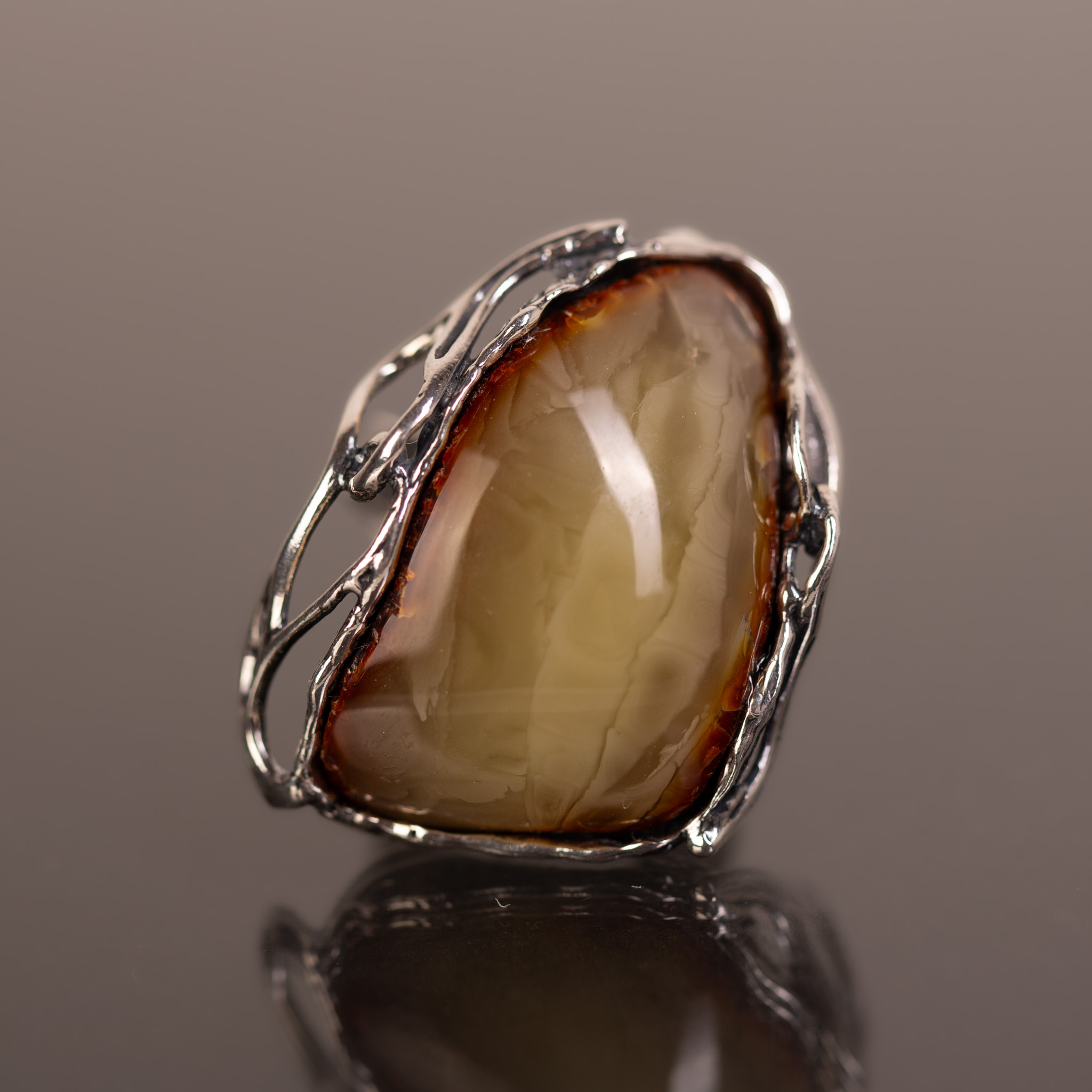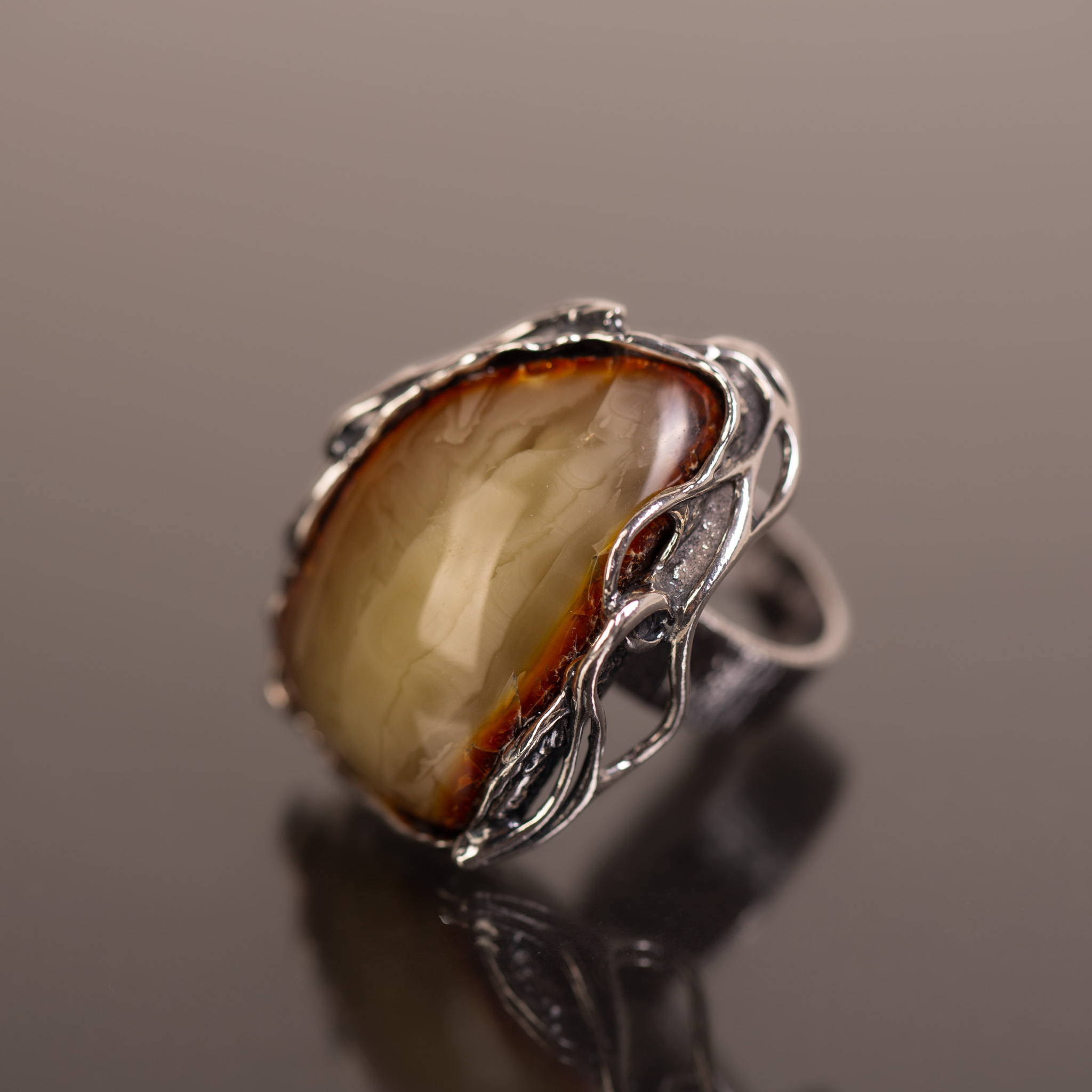 Pierścionek z naturalnym bursztynem bałtyckim o rzadkim, mleczno-miodowym odcieniu, oprawionym w ażurowe srebro. Unikatowa, lekka wizualnie konstrukcja oprawy kontrastuje z solidną bryłą kamienia, tworząc biżuterię o artystycznym i nowoczesnym charakterze. Regulowana obrączka zapewnia pełną swobodę dopasowania i codzienny komfort.