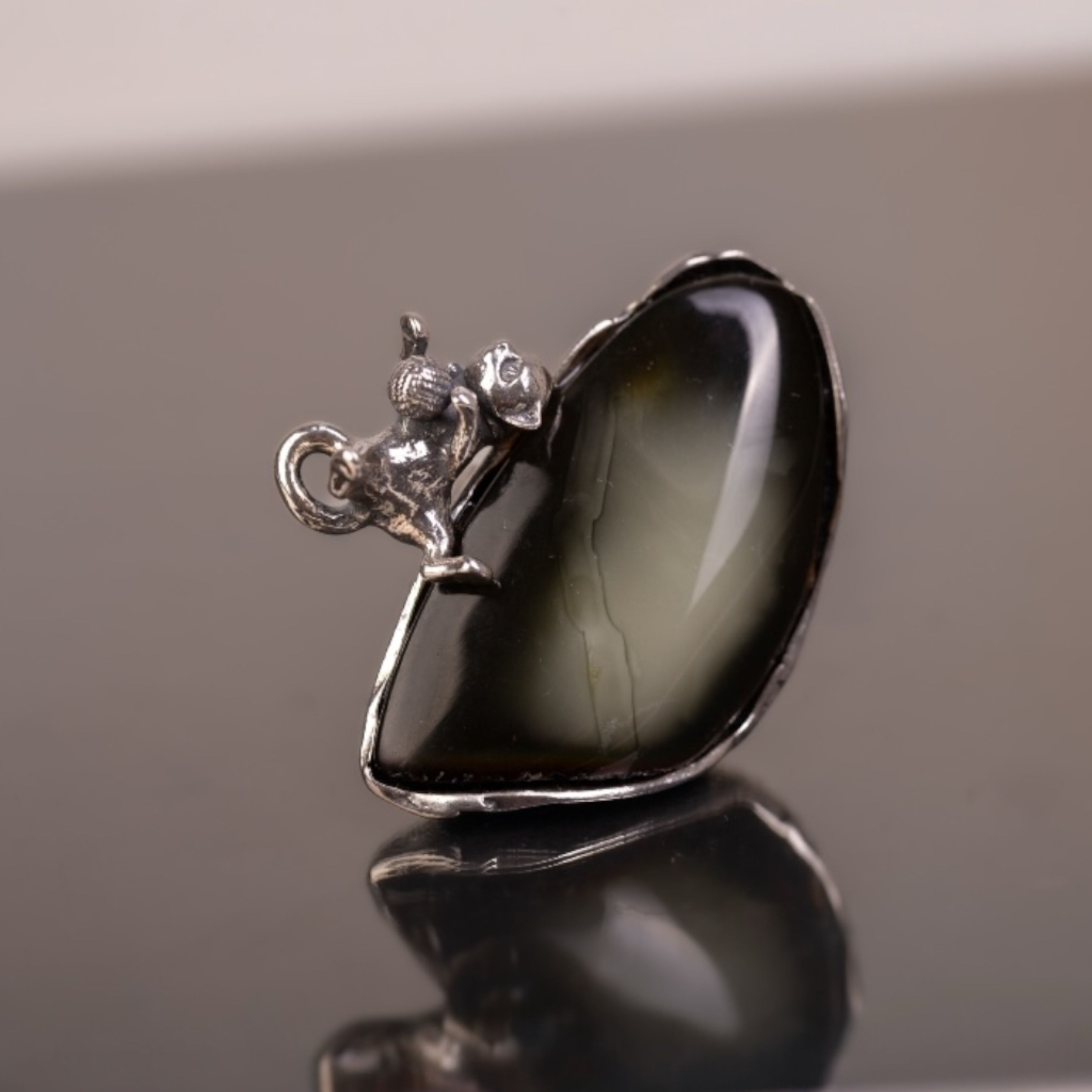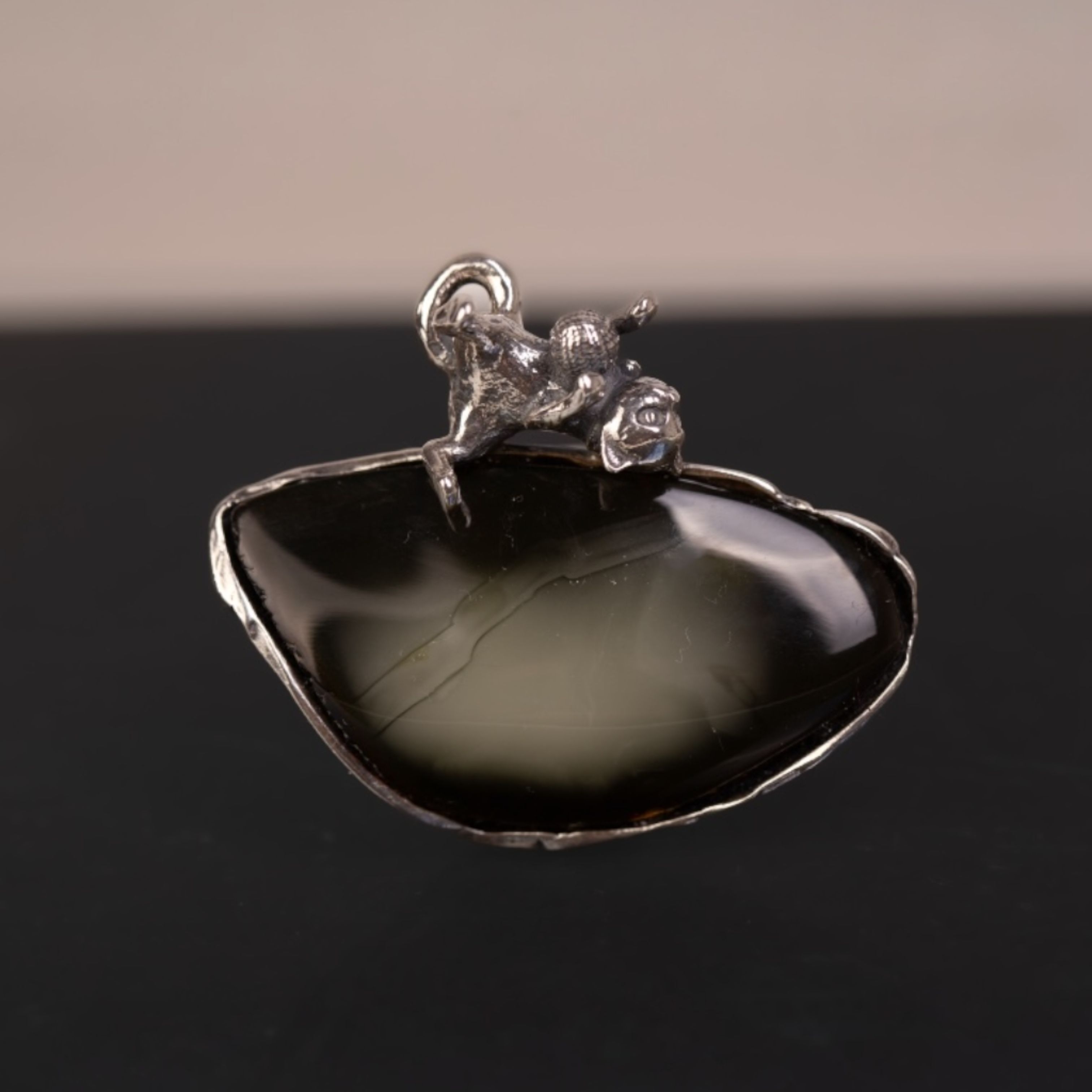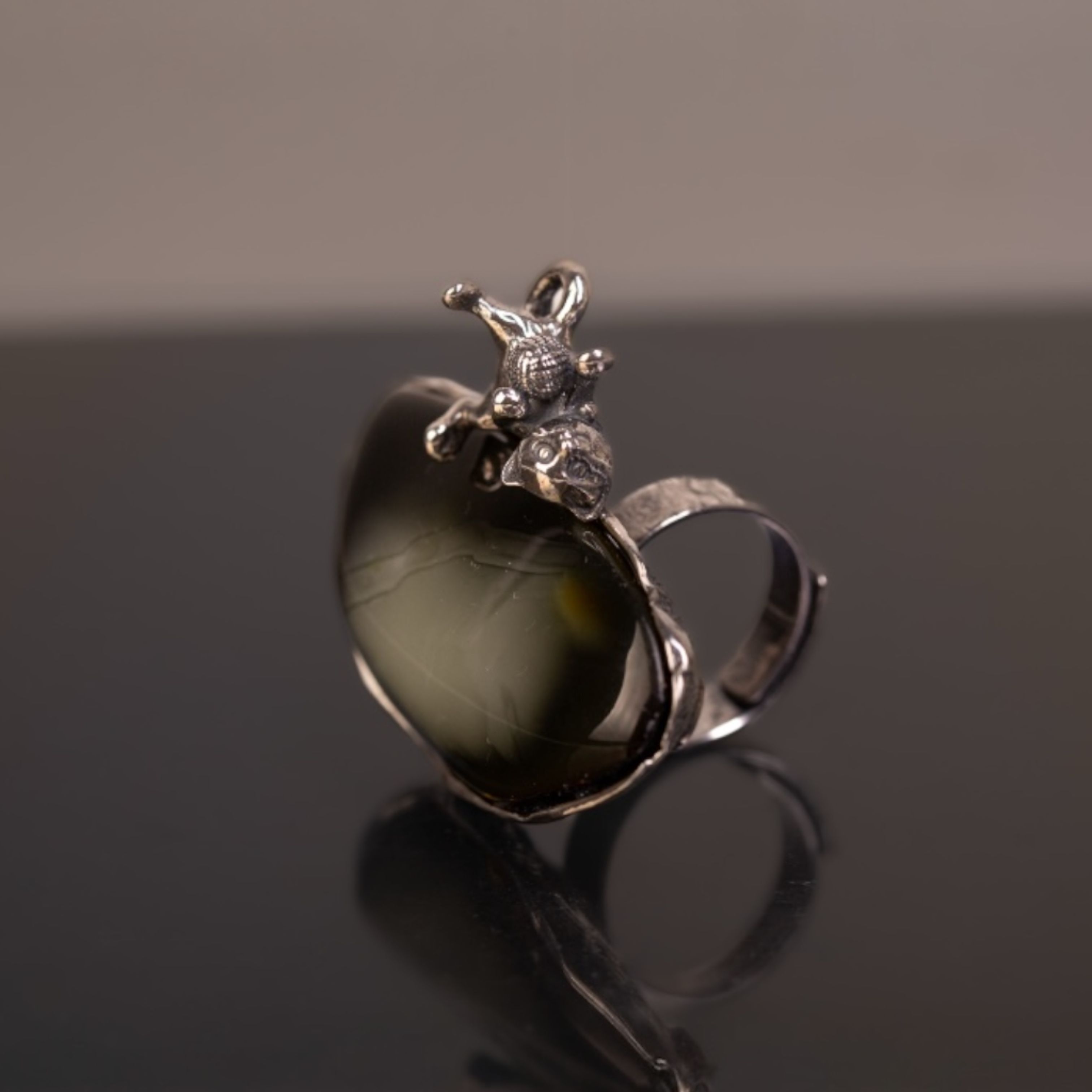 Pierścionek ręcznie wykonany ze srebra z dużym bursztynem o głębokiej, ciemnej barwie, przypominającej nocne niebo. Na krawędzi kamienia bawi się mały srebrny kotek z kłębkiem – dopracowany w detalach, dodaje całości lekkości i odrobiny humoru. Masywny, wyrazisty pierścień świetnie prezentuje się na dłoni, a regulowana obrączka pozwala wygodnie dopasować go do różnych rozmiarów.