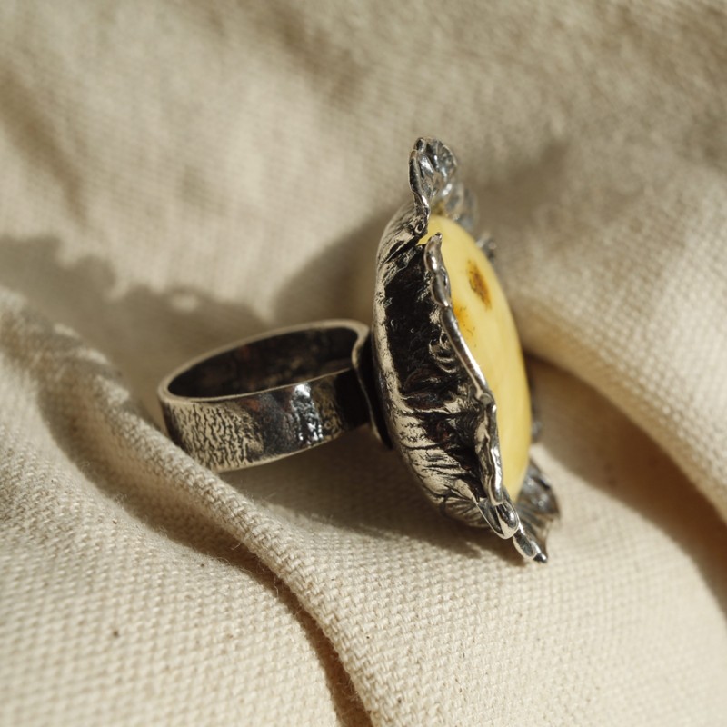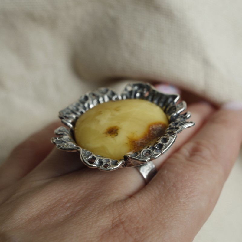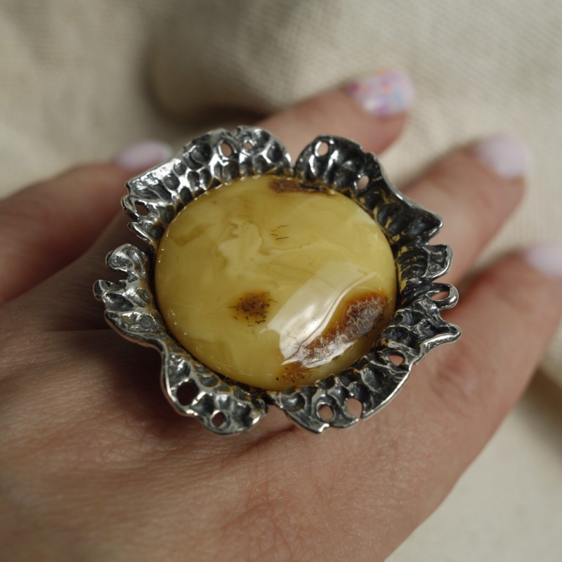 Efektowny, ręcznie robiony pierścionek wykonany ze srebra próby 925, ozdobiony okazałym bursztynem w mlecznym odcieniu z naturalnymi przebarwieniami. Ozdobna oprawa nadaje mu eleganckiego charakteru i przyciąga wzrok. Model o dużej średnicy i solidnej wadze, idealny dla osób, które lubią wyrazistą biżuterię.
