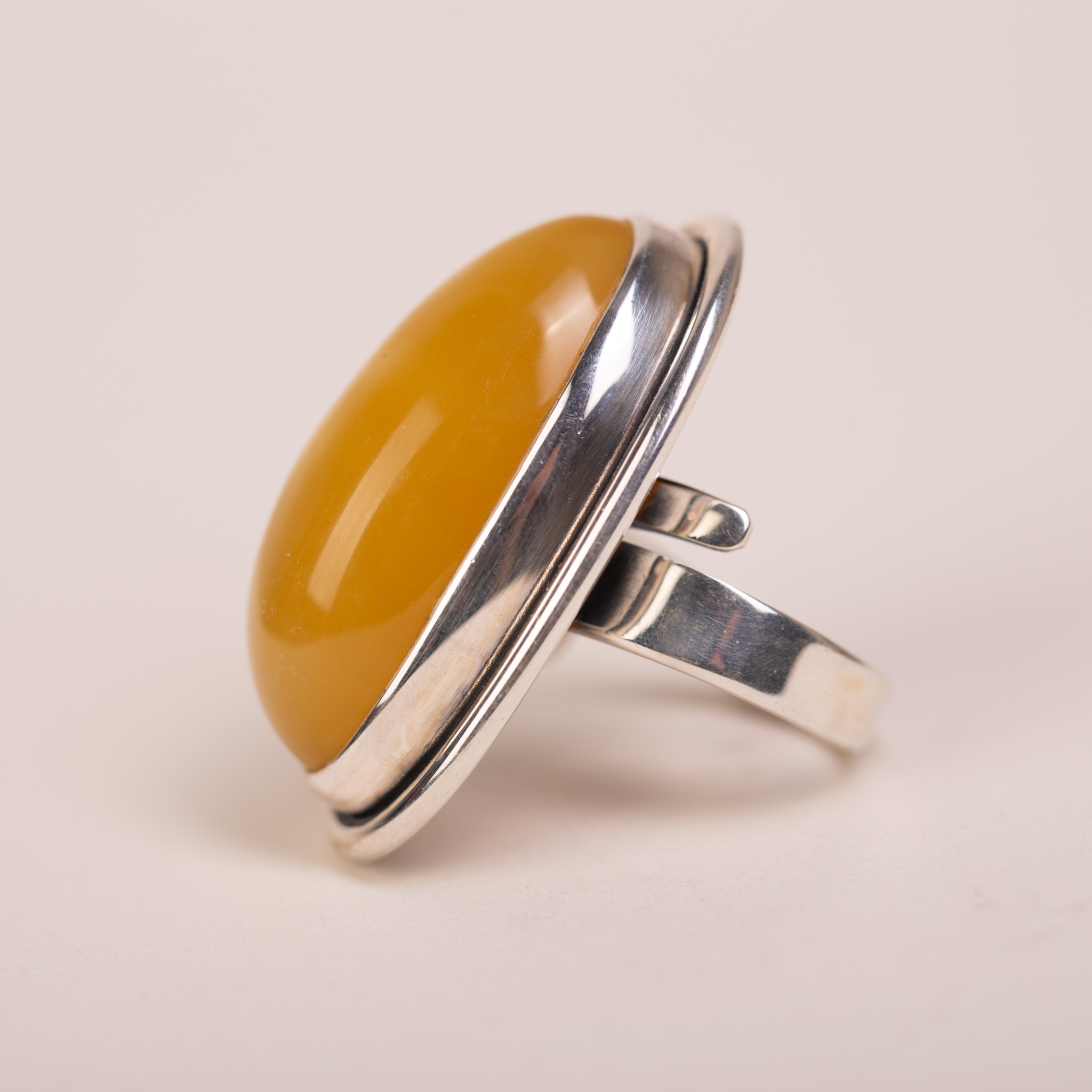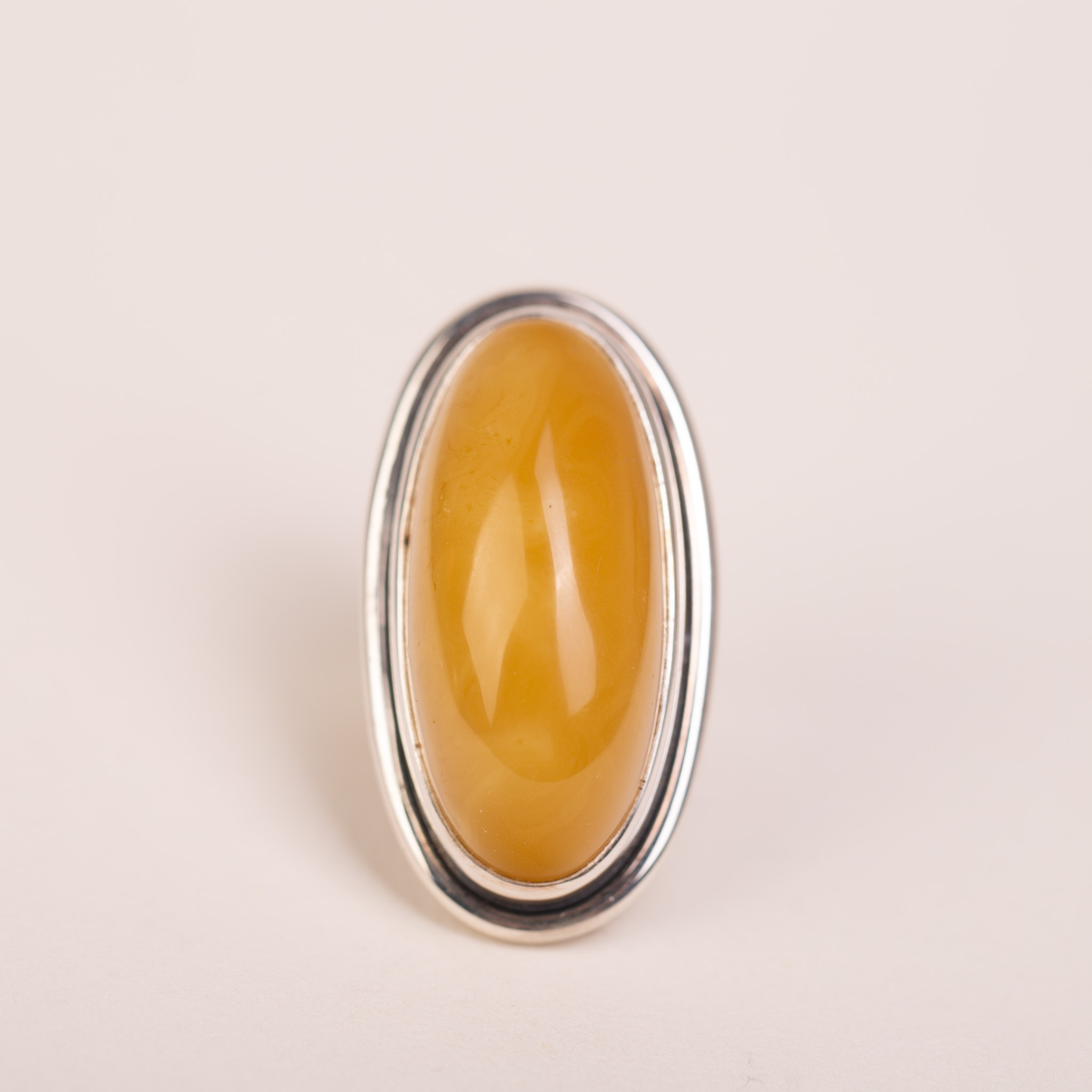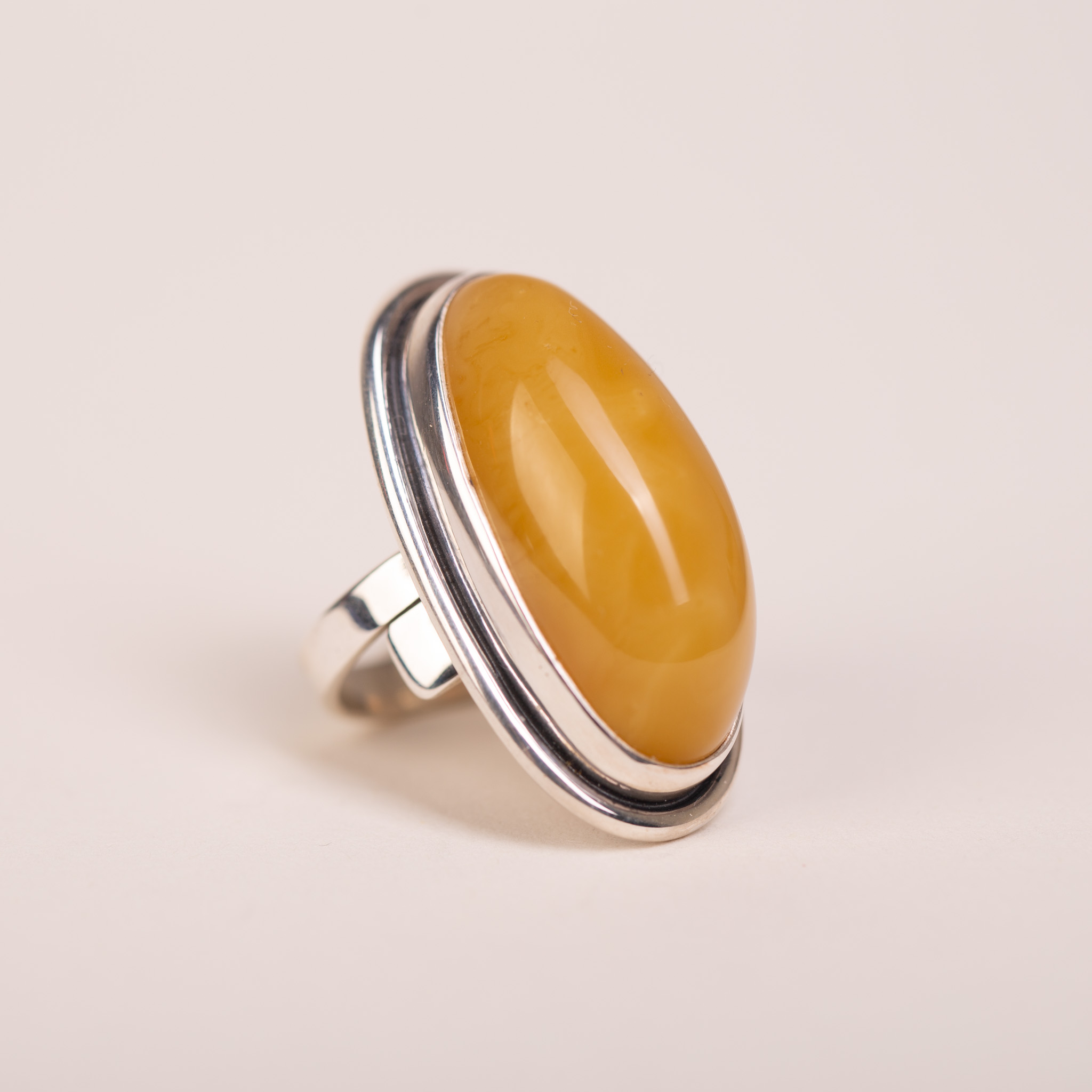 Ten pierścionek to wyrazisty akcent, który od razu przyciąga spojrzenia i pięknie ociepla dłoń. Duży, gładko wypolerowany bursztyn w ciepłym, mleczno-miodowym odcieniu został osadzony w prostej, eleganckiej oprawie, co nadaje mu klasycznego, a zarazem unikatowego charakteru. Dzięki regulowanej obrączce pierścionek jest komfortowy – możesz go dopasować i nosić na różnych palcach, zależnie od stylizacji.