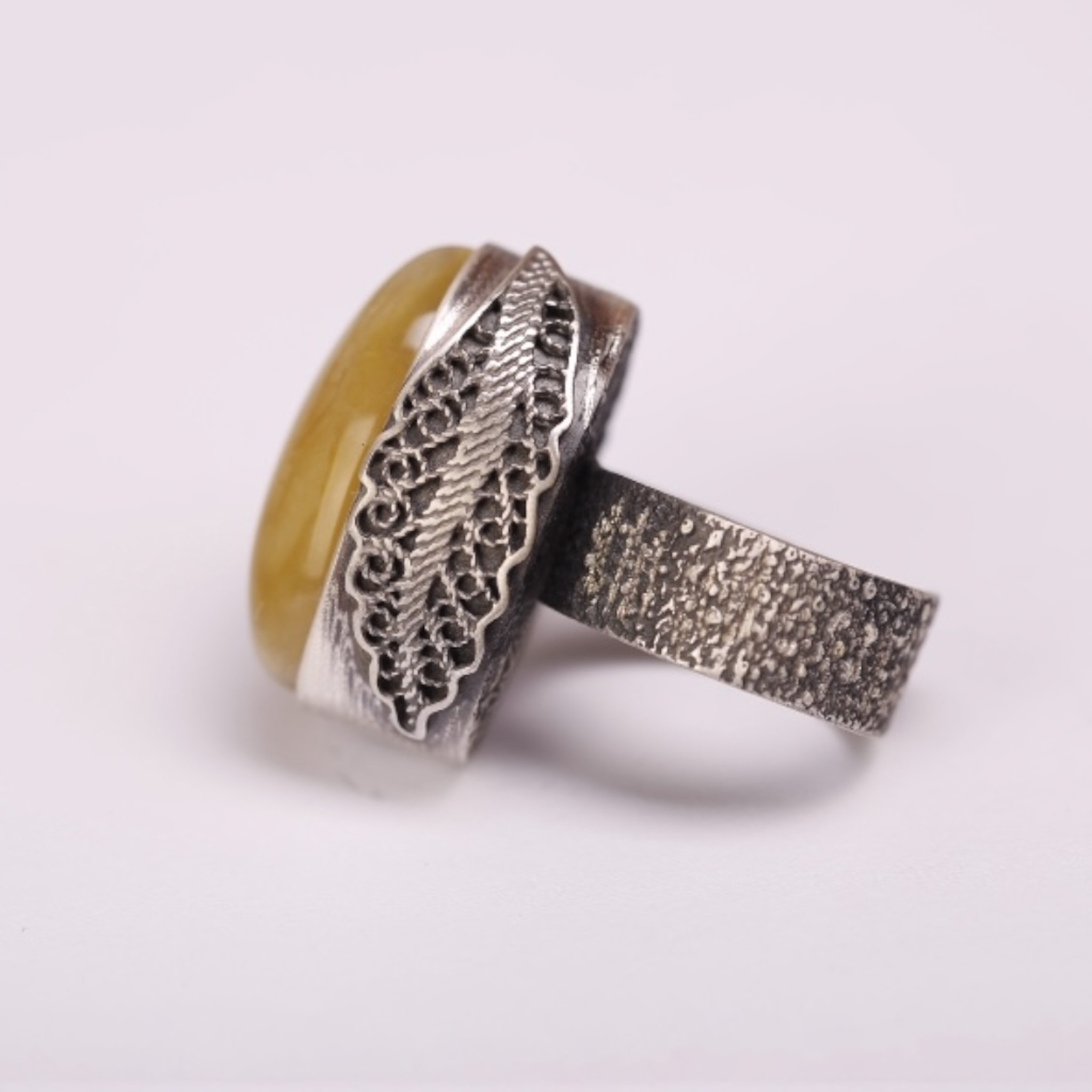 Miodowy bursztyn bałtycki o owalnym kształcie przyciąga wzrok miękkim blaskiem, a oksydowane srebro nadaje całości wyrazisty, artystyczny charakter. Szeroka, regulowana obrączka gwarantuje wygodę i idealne dopasowanie, a solidność ręcznego wykonania jest wyraźnie wyczuwalna przy każdym ruchu dłoni. To biżuteria, która dodaje stylizacji pewności i ciepła.