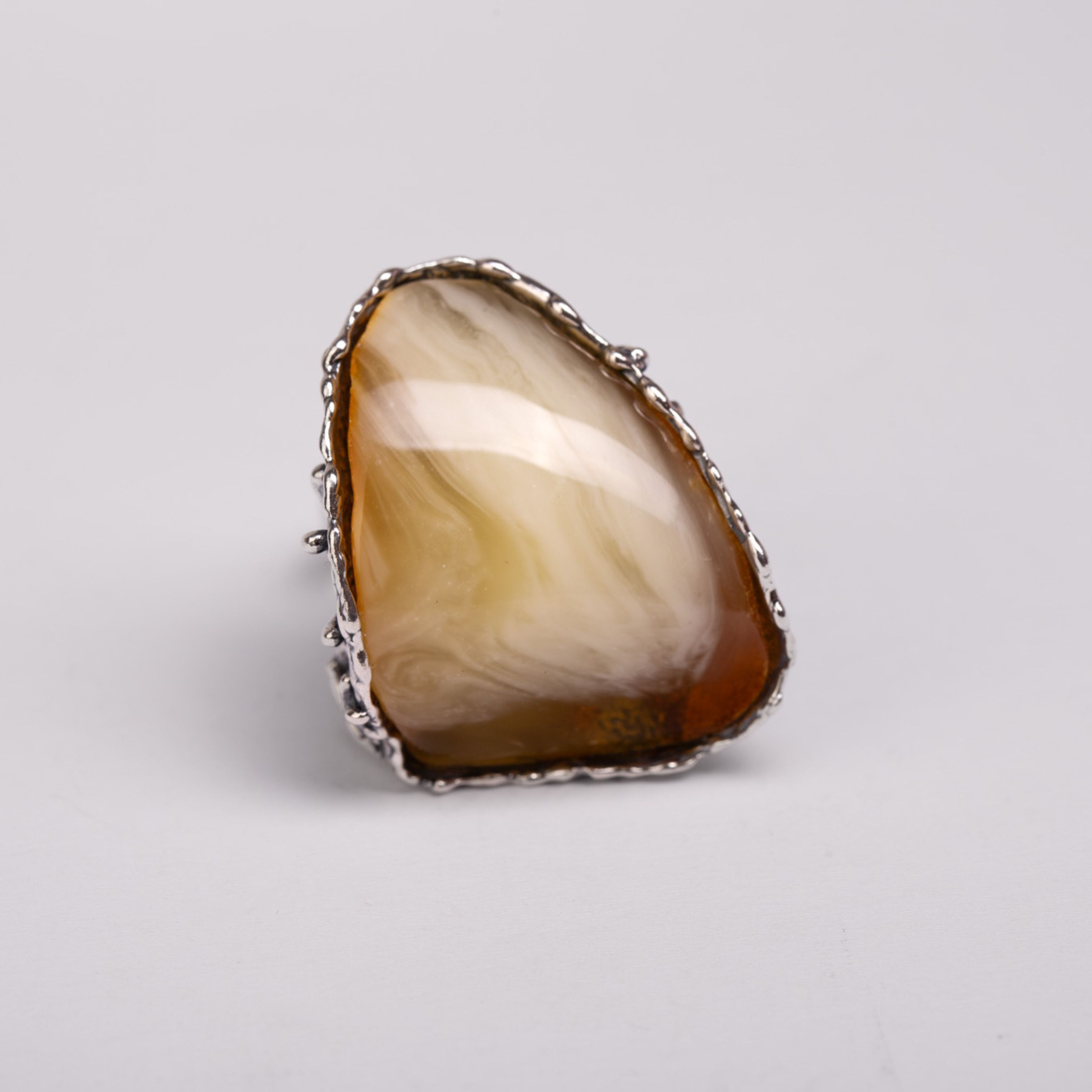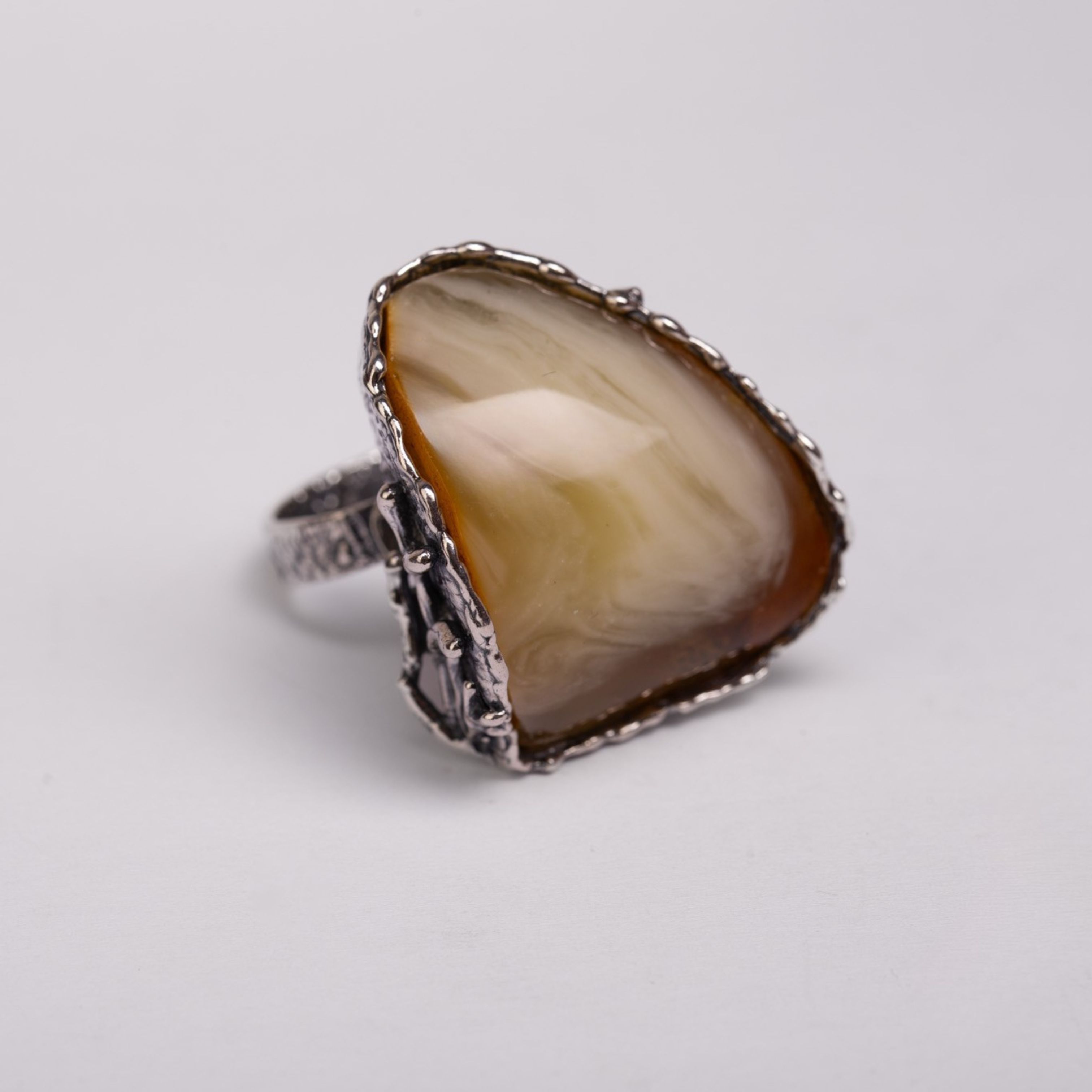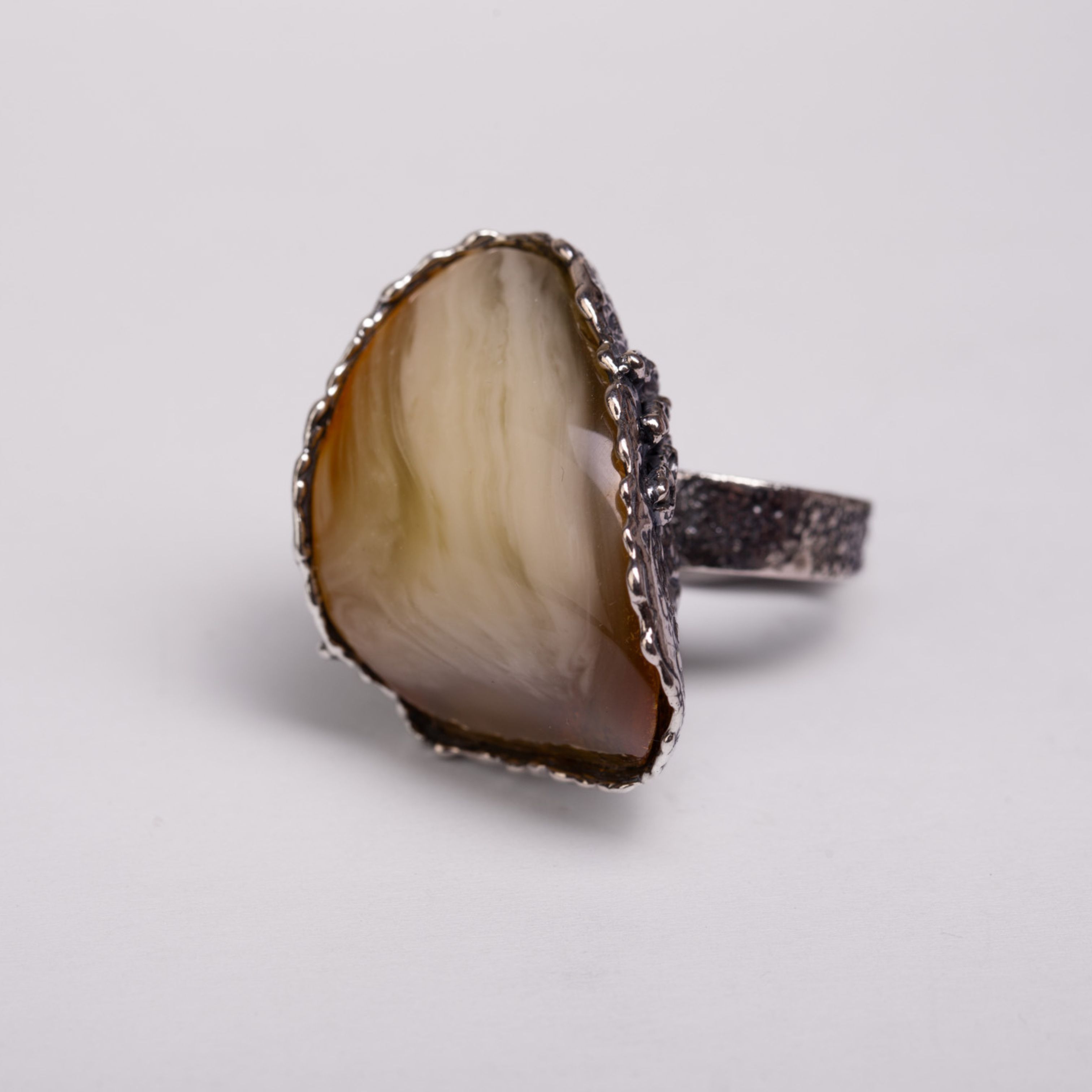 Wyrazisty, ręcznie wykonany pierścionek z oksydowanego srebra z pięknym, kremowo-miodowym bursztynem. Z jednej strony oprawy zdobiony subtelną, srebrną różą, która dodaje mu charakteru i delikatności. Ten pierścionek przyciąga spojrzenia – łączy w sobie surowość metalu i miękkość naturalnego kamienia. Na dłoni czuć jego solidność i siłę, ale też elegancką lekkość. Idealny dla kobiety, która lubi biżuterię z duszą i wyrazem.