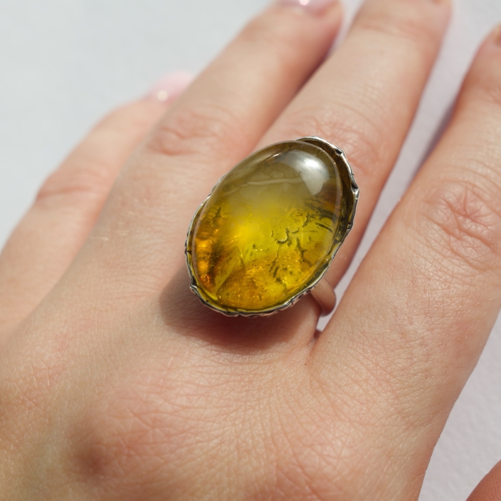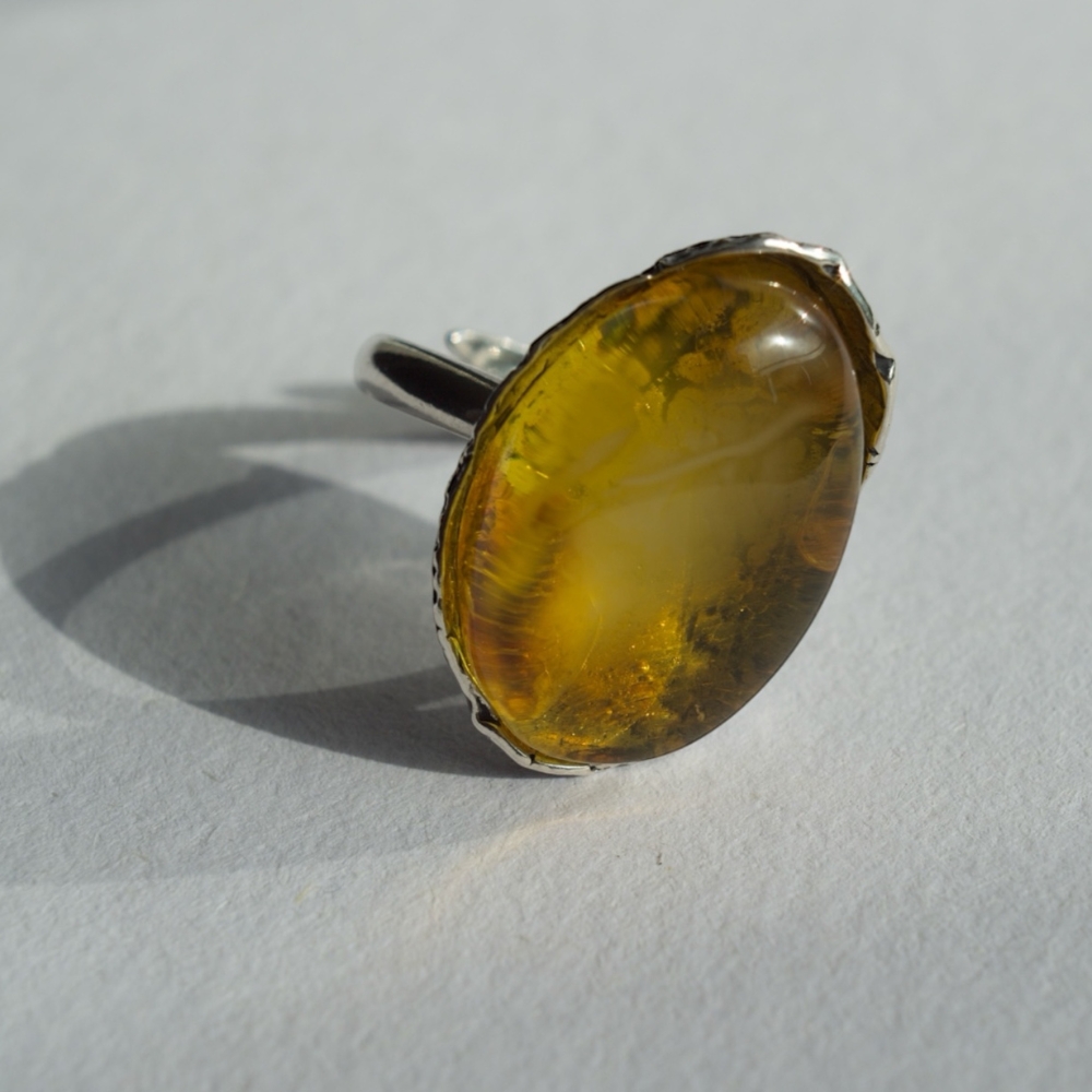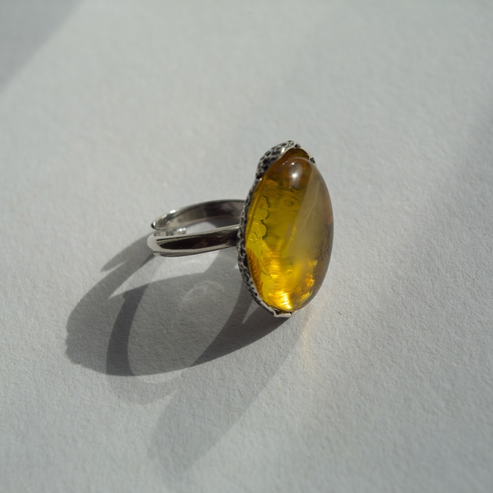 Ręcznie wykonany pierścionek z naturalnym bursztynem bałtyckim w intensywnie miodowym odcieniu. Kamień o pięknej, lekko wypukłej formie osadzony jest w srebrze próby 925, którego subtelna faktura podkreśla naturalny charakter bursztynu. Regulowana obrączka sprawia, że pierścionek dopasuje się do różnych rozmiarów, łącząc wygodę noszenia z elegancją.