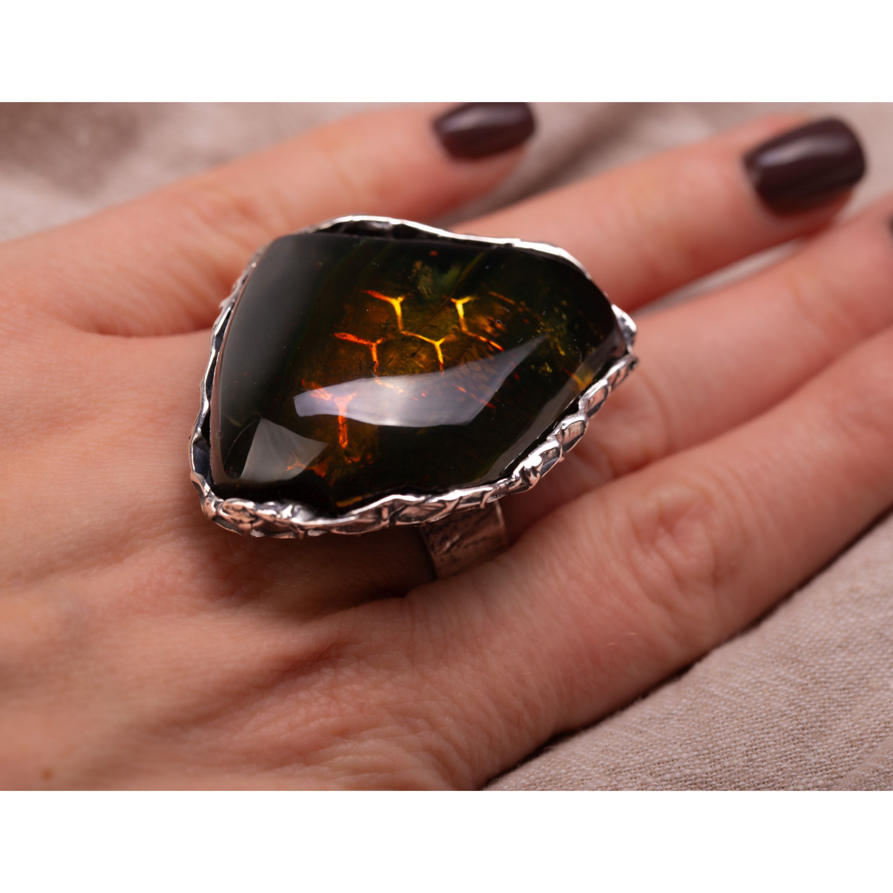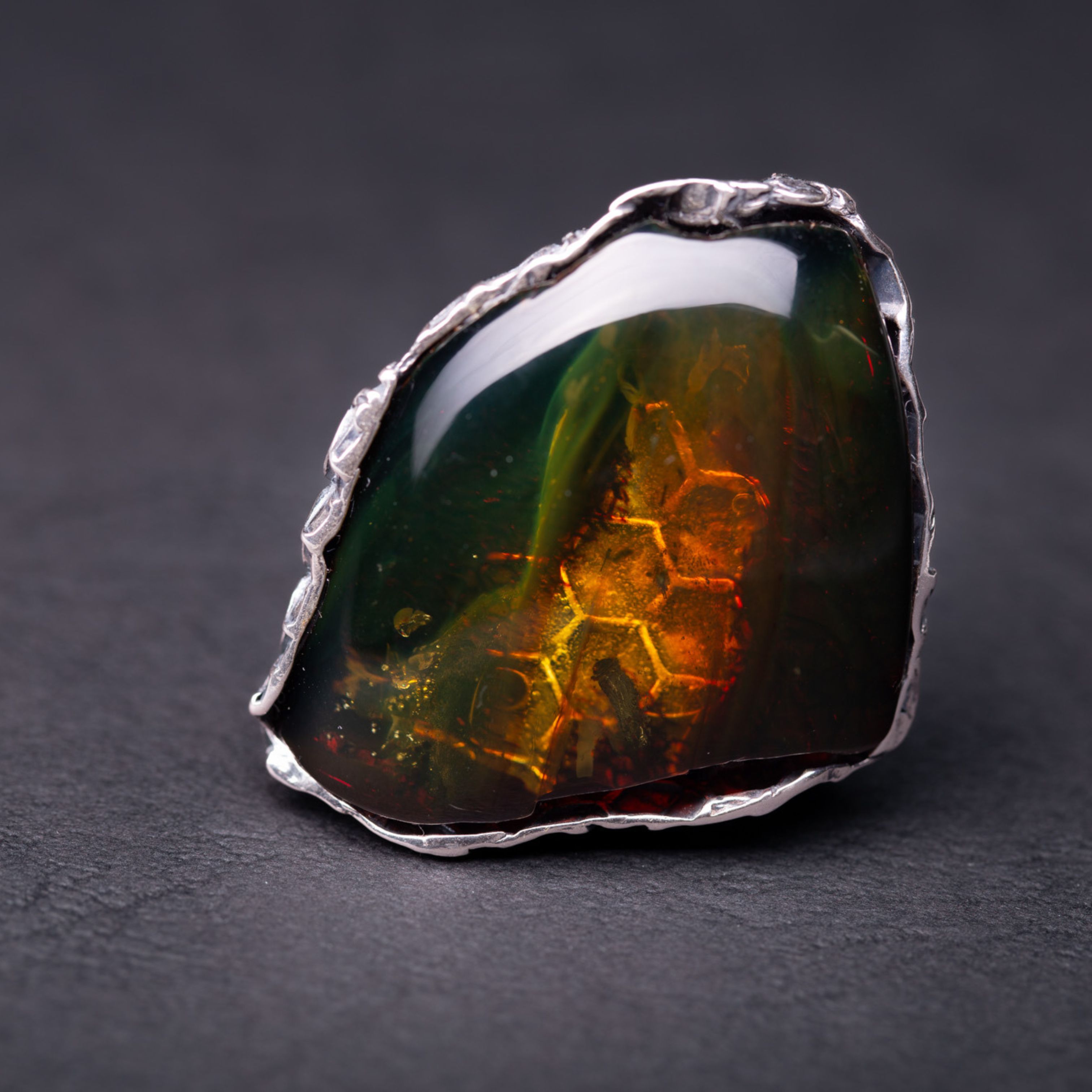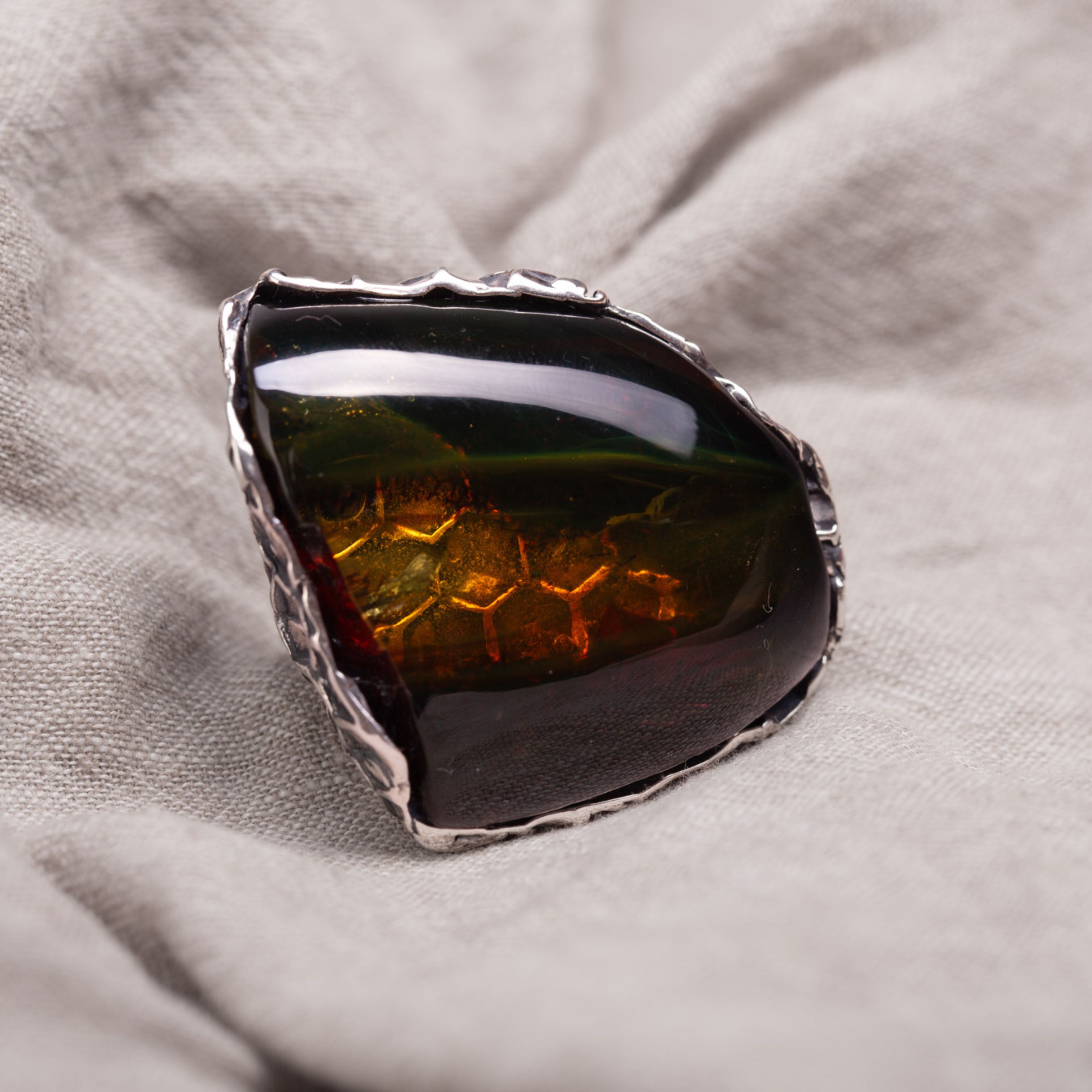 Ten pierścionek to połączenie elegancji i siły natury. Duży, głęboko zielono‑brązowy bursztyn mieni się złotymi refleksami, które ożywają przy każdym ruchu dłoni. Oprawa z oksydowanego srebra podkreśla wyjątkowy charakter kamienia, dodając całości szlachetnej surowości. Masywna forma pięknie układa się na palcu, a regulowana obrączka zapewnia wygodę. To biżuteria, która przyciąga uwagę i sprawia, że kobieta czuje się wyjątkowo – z klasą, pewnością i odrobiną tajemniczości.