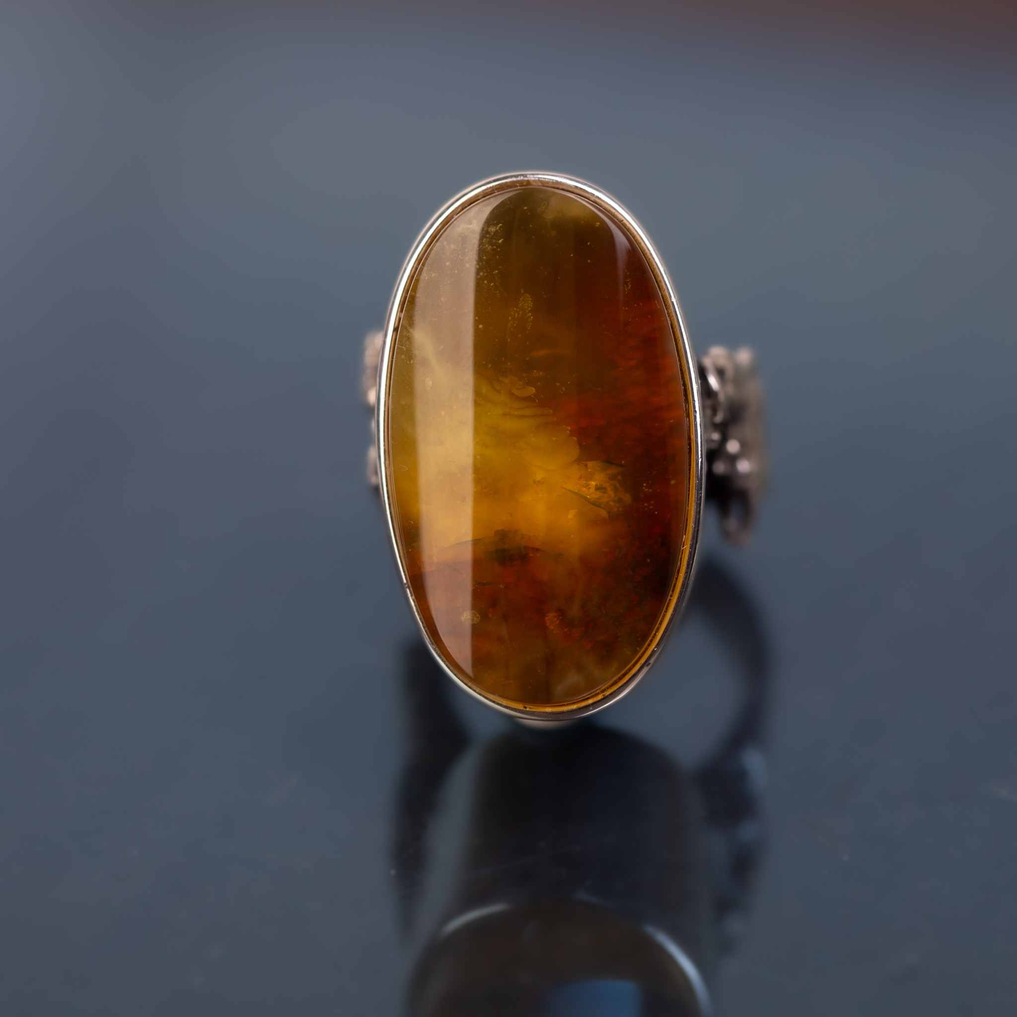 Srebro próby 925 · naturalny bursztyn bałtycki · waga 22,6 g · bursztyn 3,2 × 1,9 cm · wysokość 1,8 cm · kotki ok. 1,1 × 1,1 cm · obrączka regulowana (9–20) · wykonanie ręczne