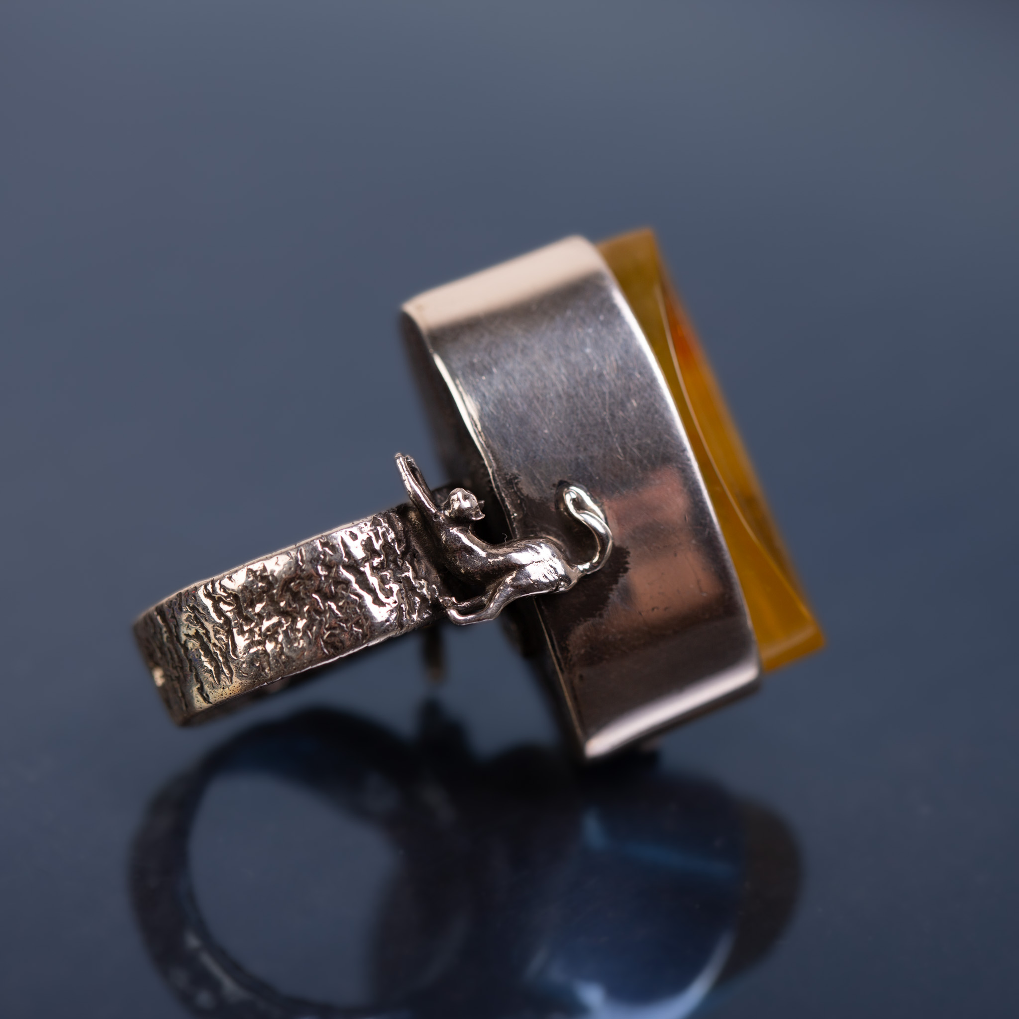 Srebrny, ręcznie wykonany pierścionek z naturalnym bursztynem bałtyckim, ozdobiony dwiema małymi figurkami kotów po bokach obrączki. Ciepły, miodowy bursztyn pięknie kontrastuje z chłodnym srebrem, a dopracowane w szczegółach kotki dodają całości lekkości i charakteru. To biżuteria, która od razu przyciąga spojrzenia.
