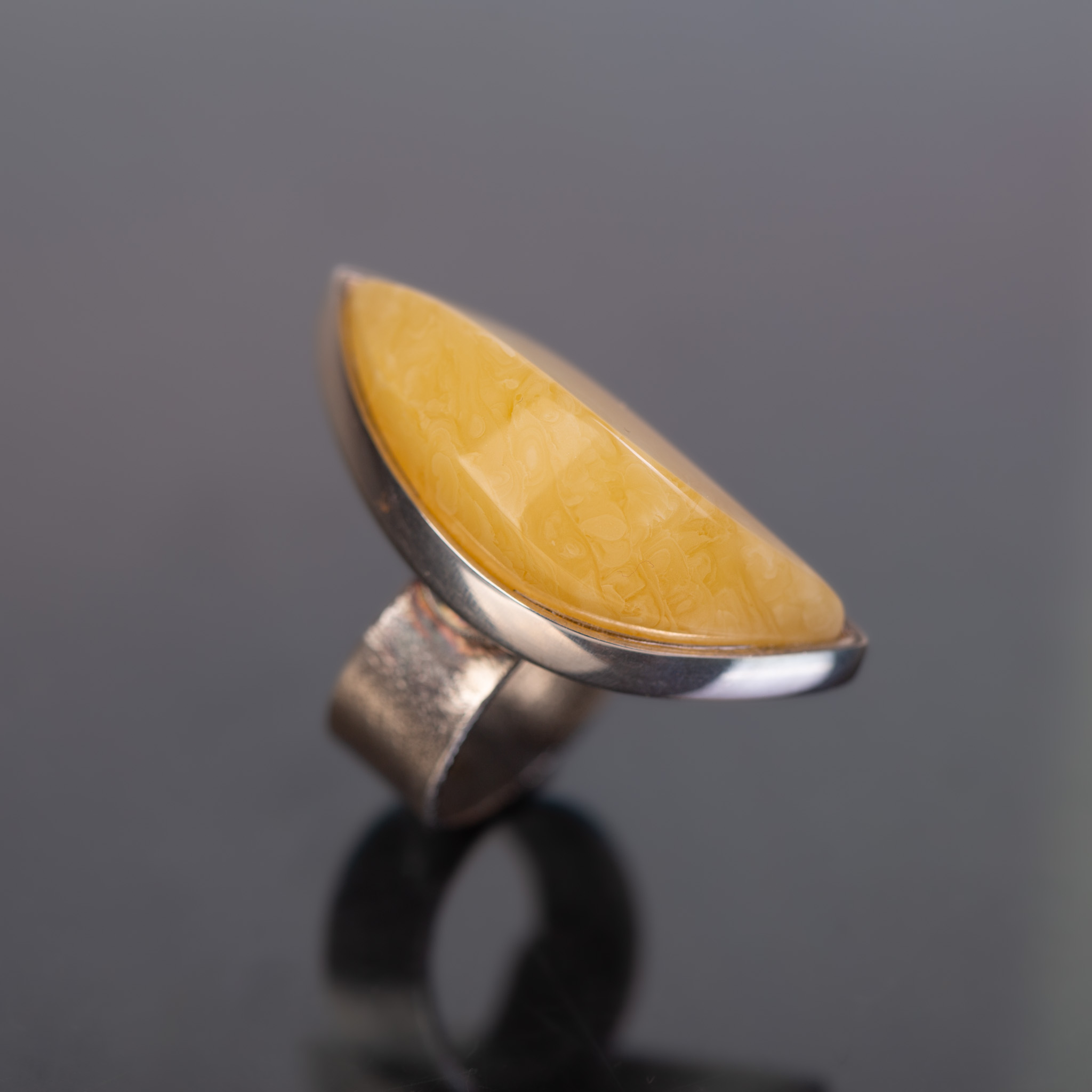 Srebro próby 925 · naturalny bursztyn bałtycki (miodowy) · waga 19 g · wymiary oprawy 4,2 × 1,7 cm · wysokość 1,5 cm · obrączka regulowana EU 9–20 · ręczna praca autorska
