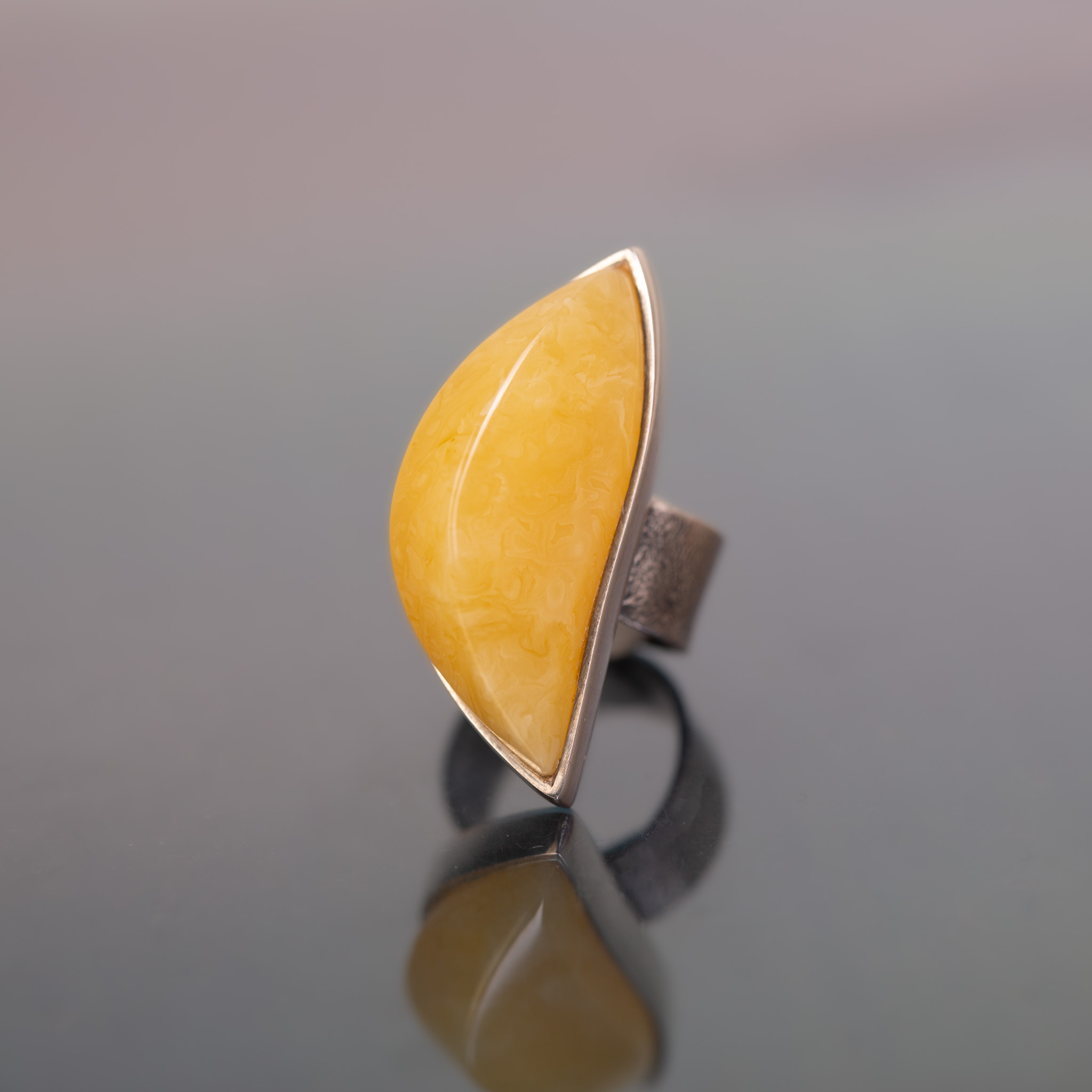Wyrazisty pierścionek z naturalnym bursztynem bałtyckim w ciepłym, miodowym odcieniu. Bursztyn ma smukłą, dynamiczną linię, która nadaje całości nowoczesny, lekko rzeźbiarski charakter. Gładka, ręcznie formowana srebrna oprawa subtelnie podkreśla jego wydłużoną formę, pozwalając bursztynowi grać światłem i kolorem.