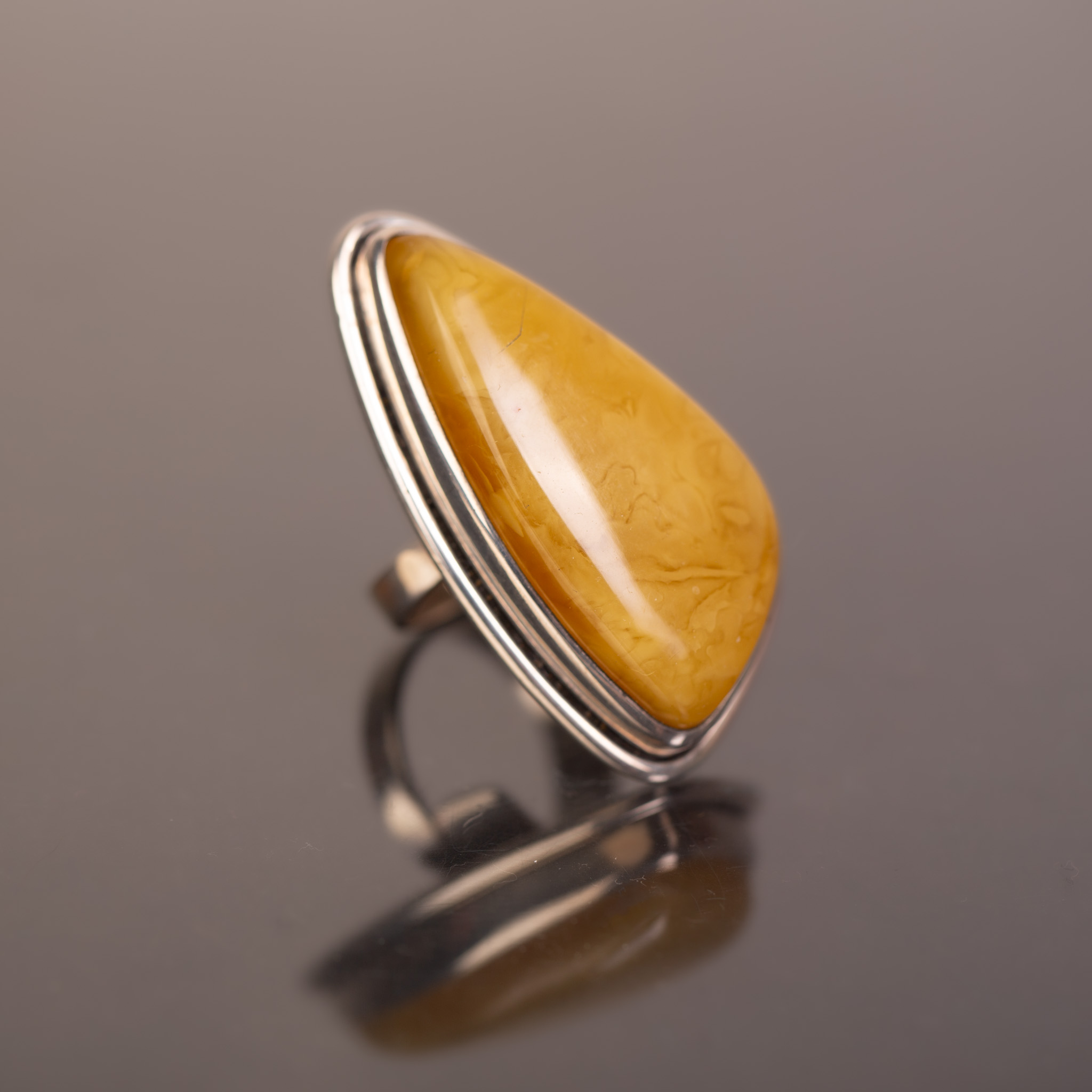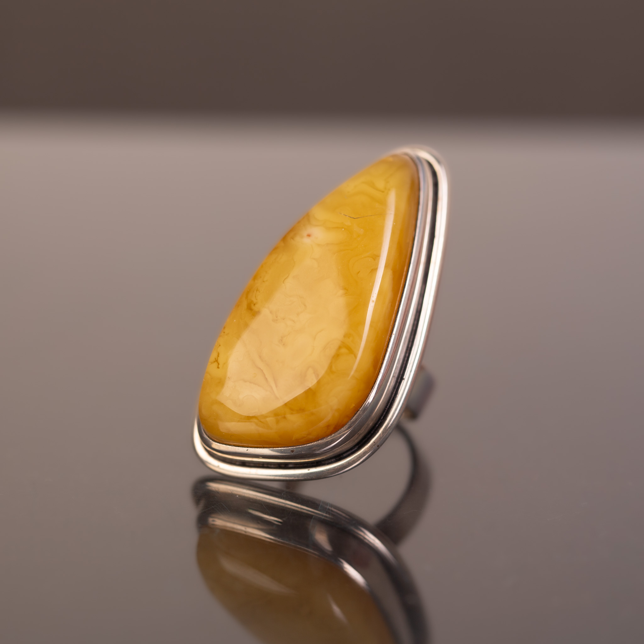 Spektakularny pierścionek z naturalnym bursztynem bałtyckim w ciepłym, miodowym odcieniu. Duża, gładko polerowana bryła bursztynu ma głębokie, żywe światło i piękną strukturę. Ręcznie formowana srebrna oprawa z delikatnymi liniami podkreśla organiczny kształt bursztynu, tworząc biżuterię o luksusowym, nowoczesnym charakterze. To jeden, dominujący akcent, który mówi sam za siebie.