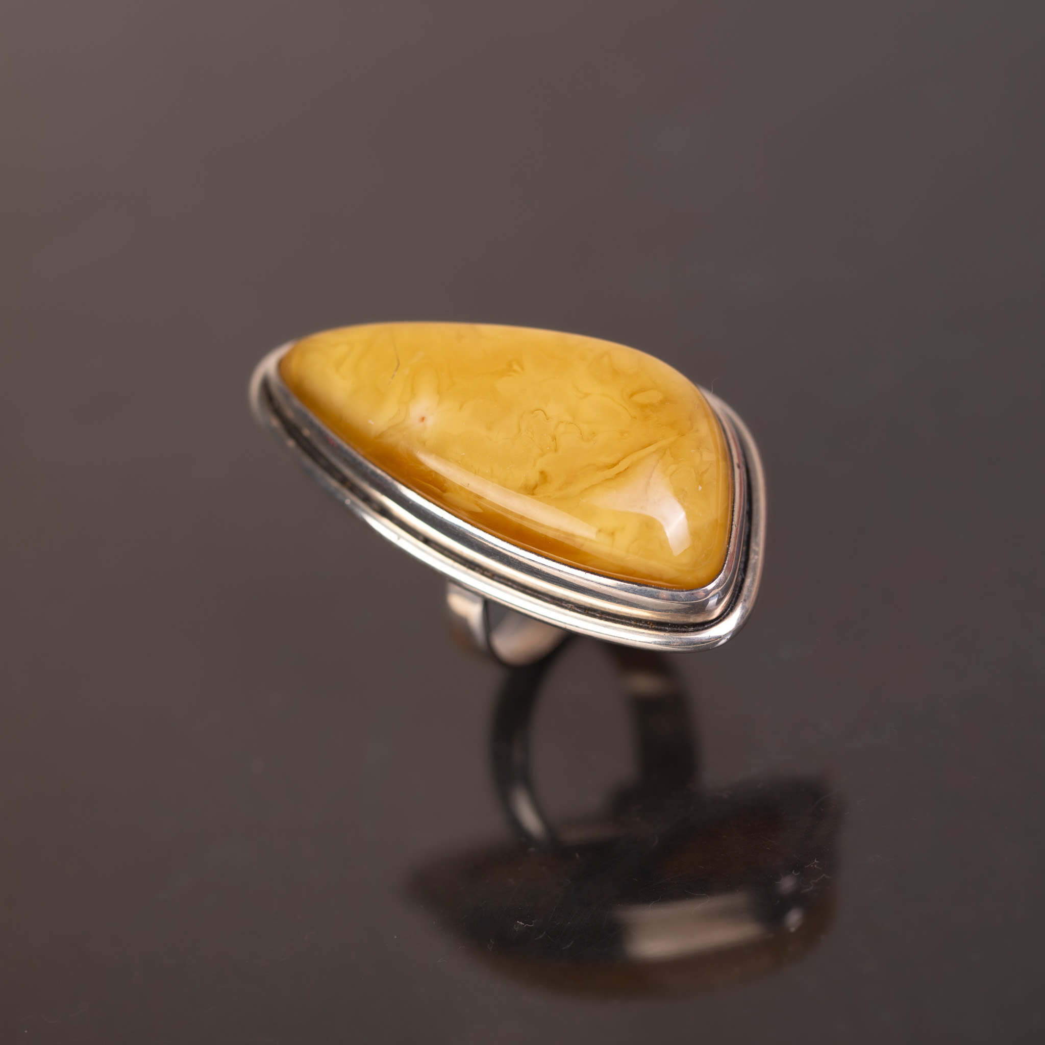 Oprawa ma wymiary 4,5 × 2,4 cm, a wysokość zaledwie 1 cm, co sprawia, że pierścionek jest bardzo elegancki i dobrze przylega do dłoni. Duża powierzchnia bursztynu jest wyraźnie widoczna i przyciąga spojrzenia.