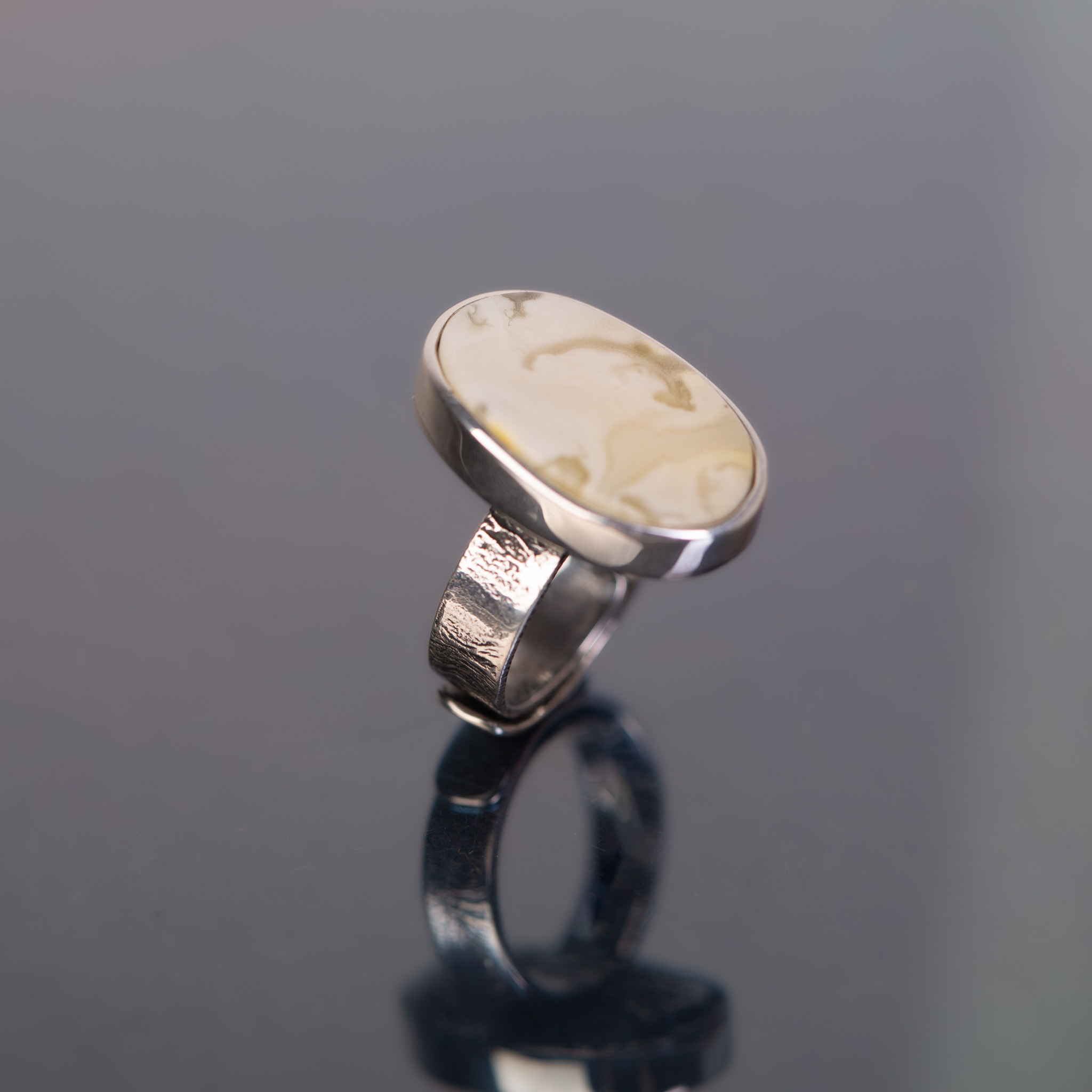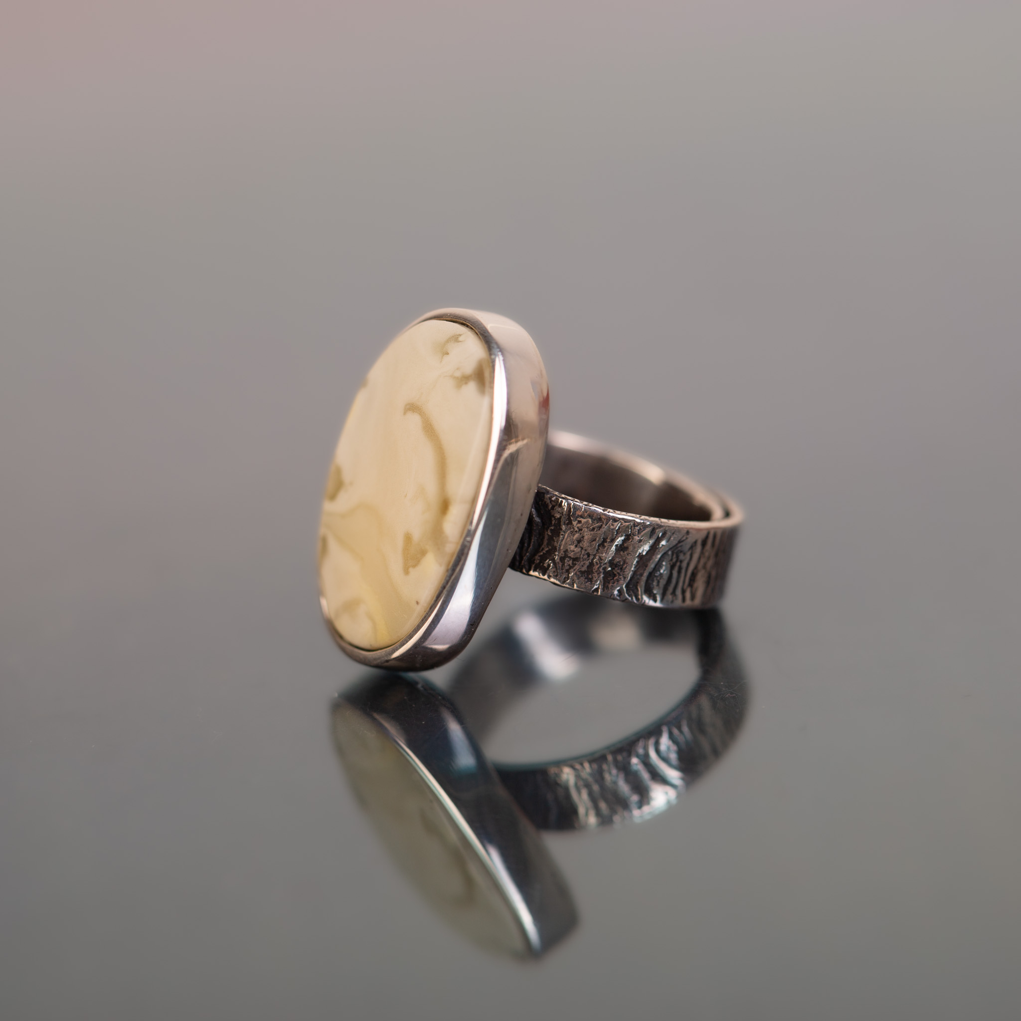 Forma: Niska oprawa o wysokości zaledwie 0,5 cm sprawia, że pierścionek bardzo dobrze przylega do palca i jest wyjątkowo komfortowy. Oksydowana, teksturowana obrączka dodaje mu artystycznego charakteru, kontrastując z gładką, jasną bryłą bursztynu.
