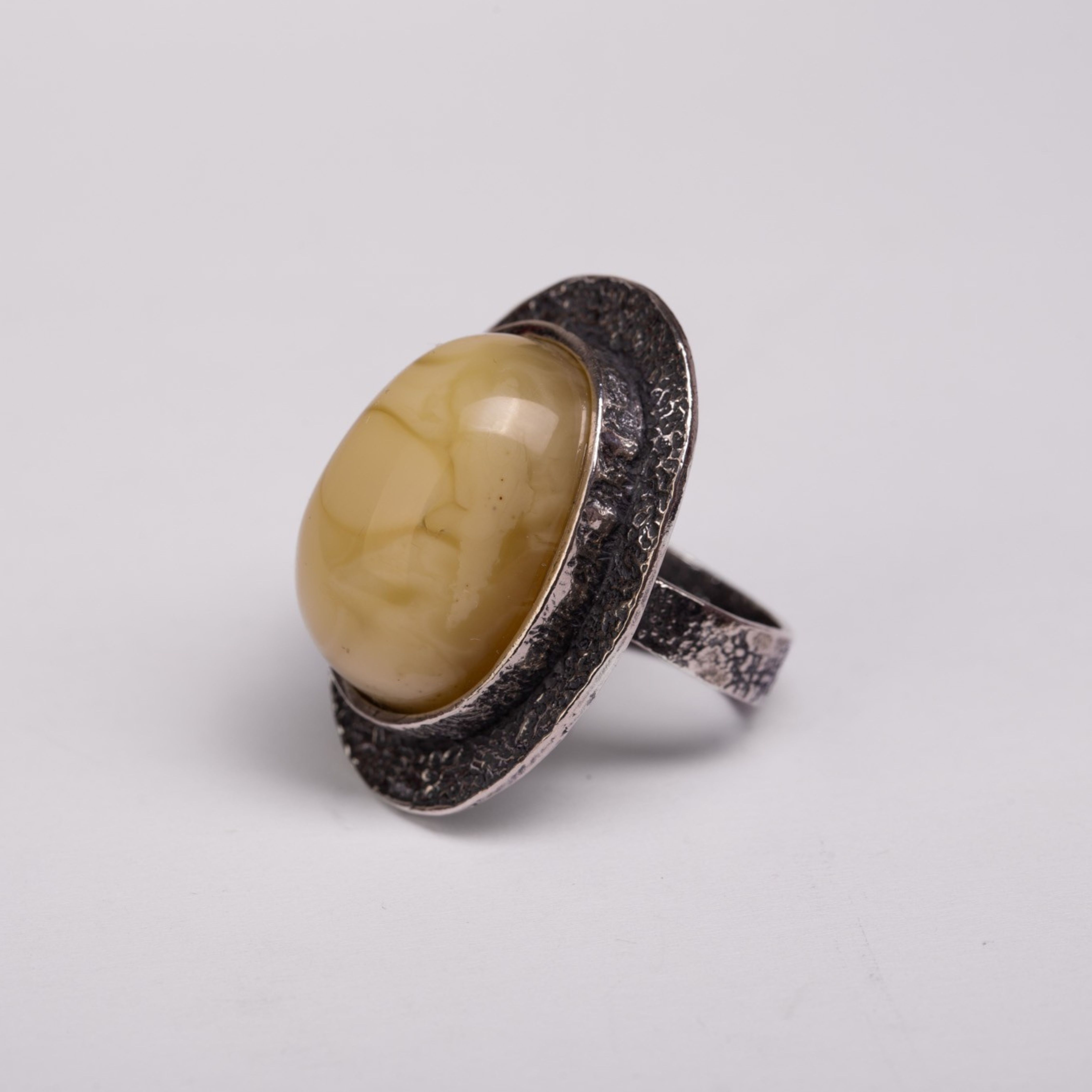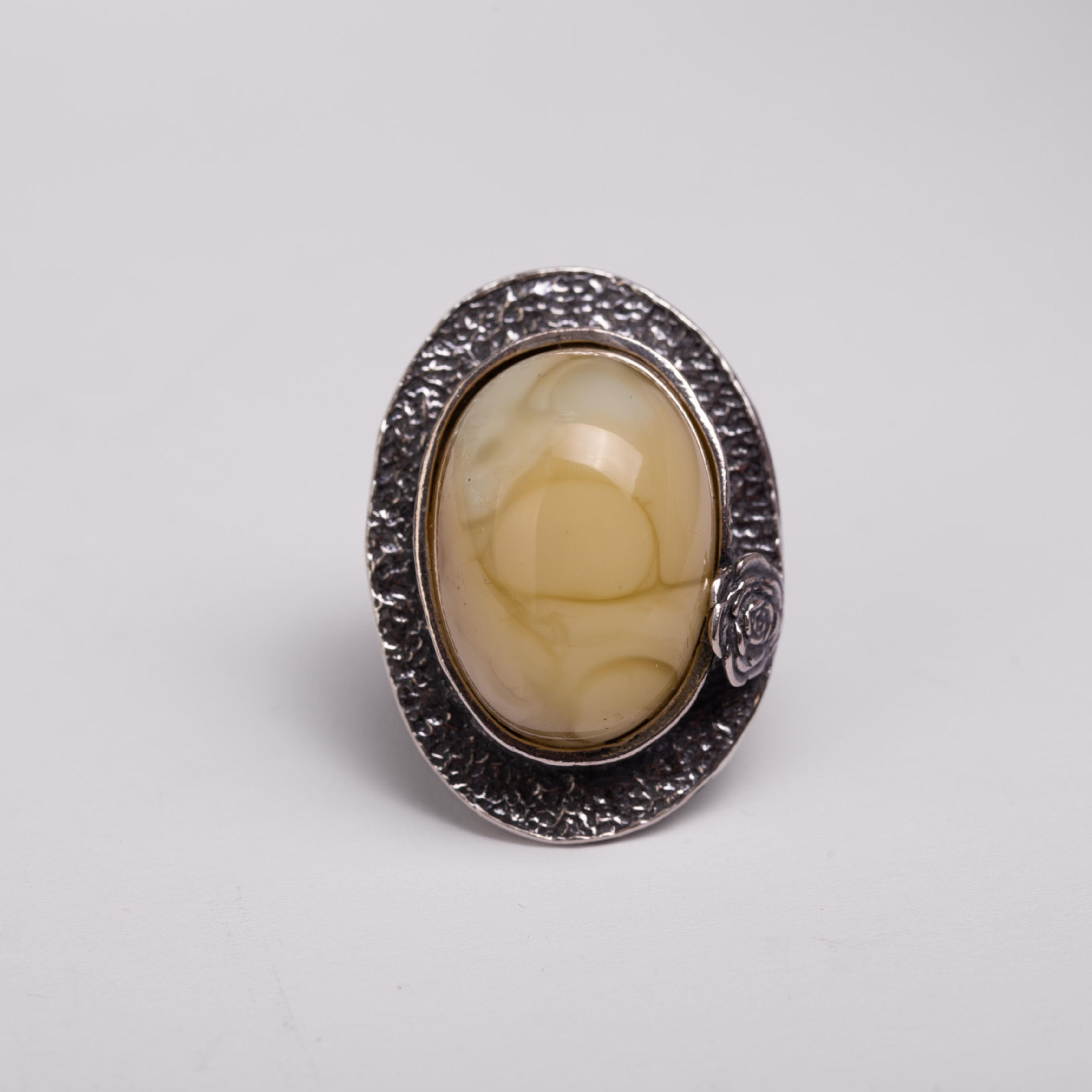 Kremowy bursztyn o miękkim, mlecznym blasku osadzony w oksydowanym srebrze zachwyca elegancją i spokojem. Delikatna róża z boku dodaje subtelnego charakteru, a ręczne wykonanie czuć w każdej fakturze. Szeroka, regulowana obrączka zapewnia wygodne dopasowanie i komfort noszenia na co dzień.