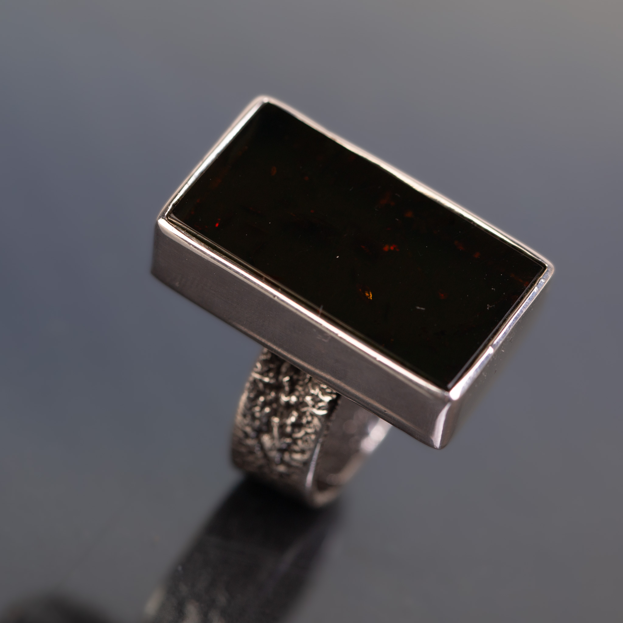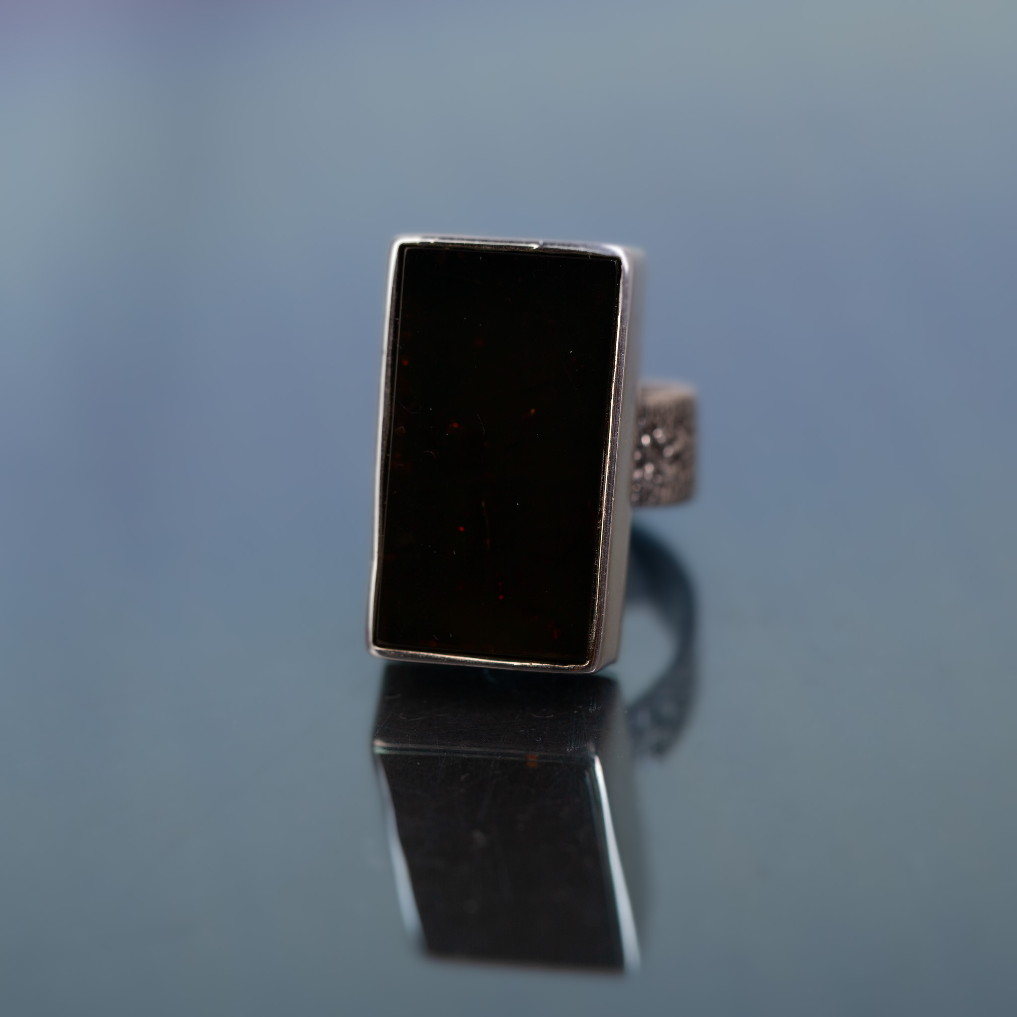 Pierścionek z prostokątnym, ciemnym bursztynem bałtyckim, oprawionym w srebro próby 925. Surowa elegancja formy i głęboka barwa kamienia tworzą nowoczesny, wyrazisty akcent w stylizacji. Regulowana obrączka umożliwia wygodne dopasowanie do różnych palców.