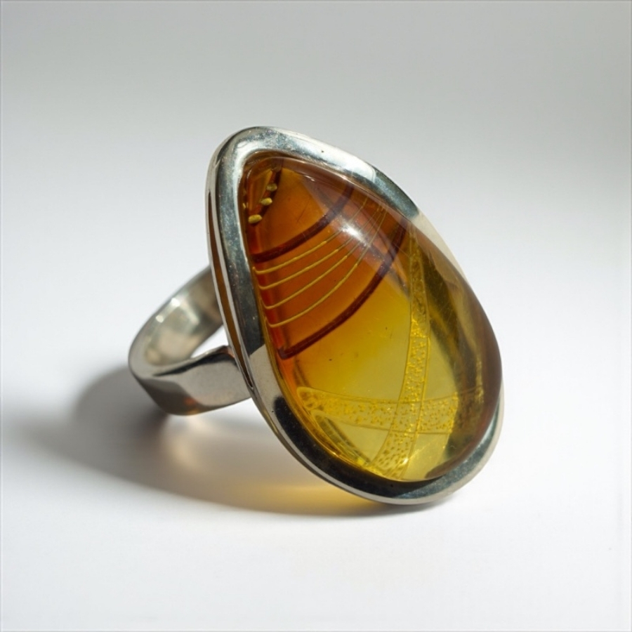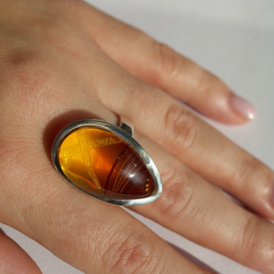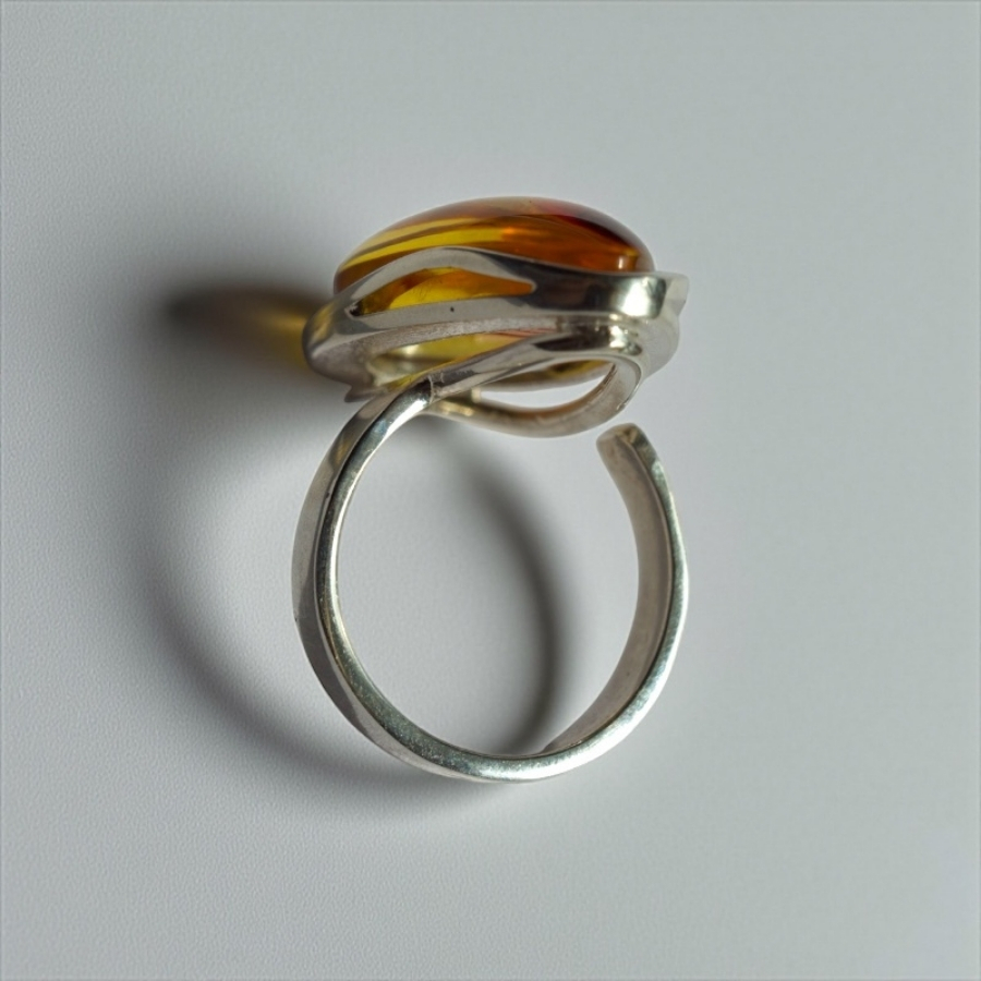 Lekki pierścionek wykonany ze srebra próby 925 z unikatowym bursztynem bałtyckim, w którego wnętrzu ręcznie wyrzeźbiono misterny wzór. Rzeźbiony bursztyn zachwyca precyzją detali i wyjątkową głębią, dzięki czemu biżuteria zyskuje artystyczny charakter. Regulowana obrączka sprawia, że pierścionek dopasowuje się do różnych rozmiarów i jest wygodny w noszeniu.