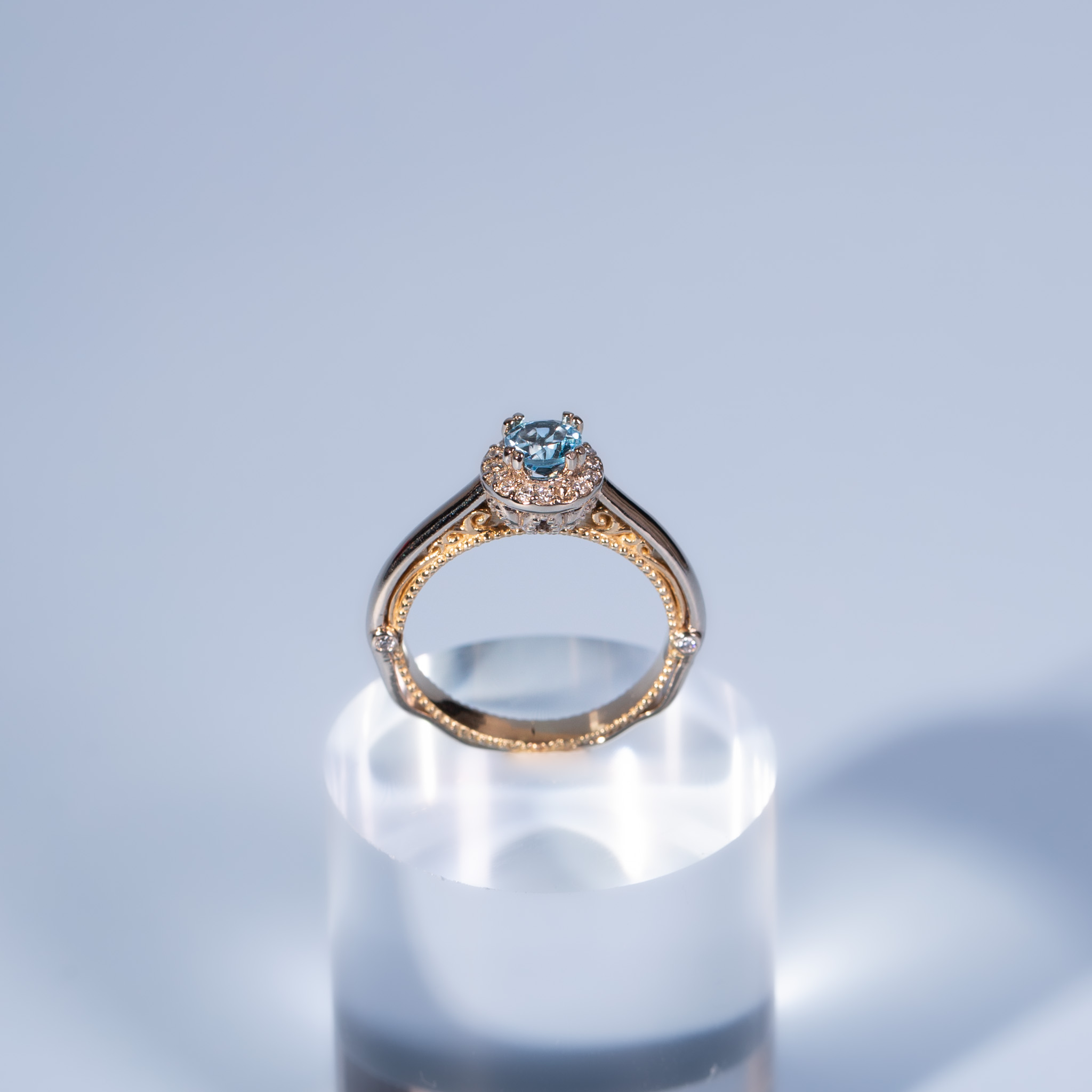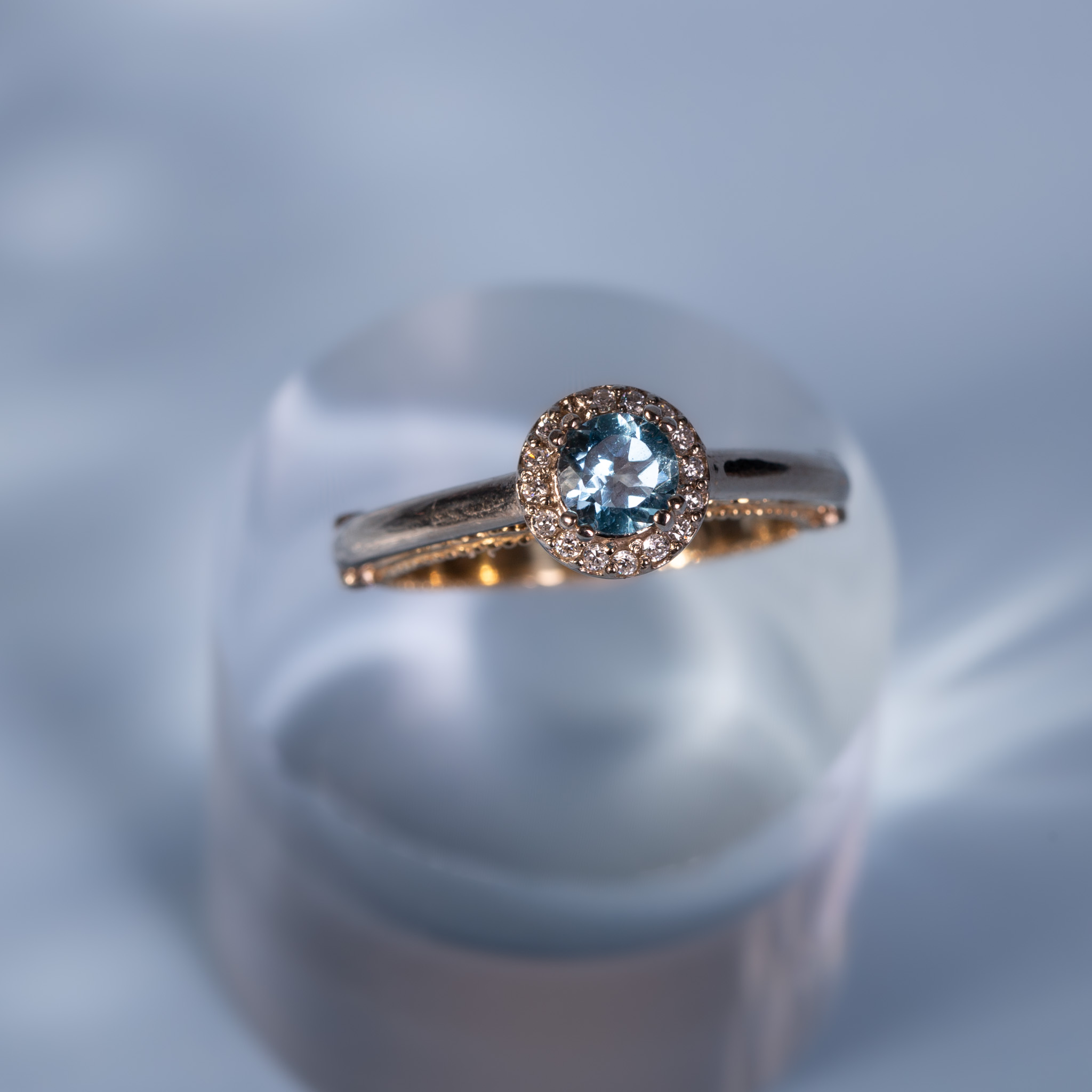 Kunsztowny pierścionek wykonany z połączenia białego i żółtego złota próby 585, który zachwyca precyzją wykonania i bogactwem detali. Centralnym punktem biżuterii jest naturalny błękitny topaz o średnicy 4,9 mm, o czystej, krystalicznej barwie przypominającej bezchmurne niebo. Kamień został otoczony lśniącym nimbem z diamentów, które efektownie rozświetlają kompozycję i nadają jej luksusowego charakteru.