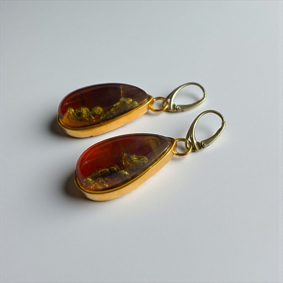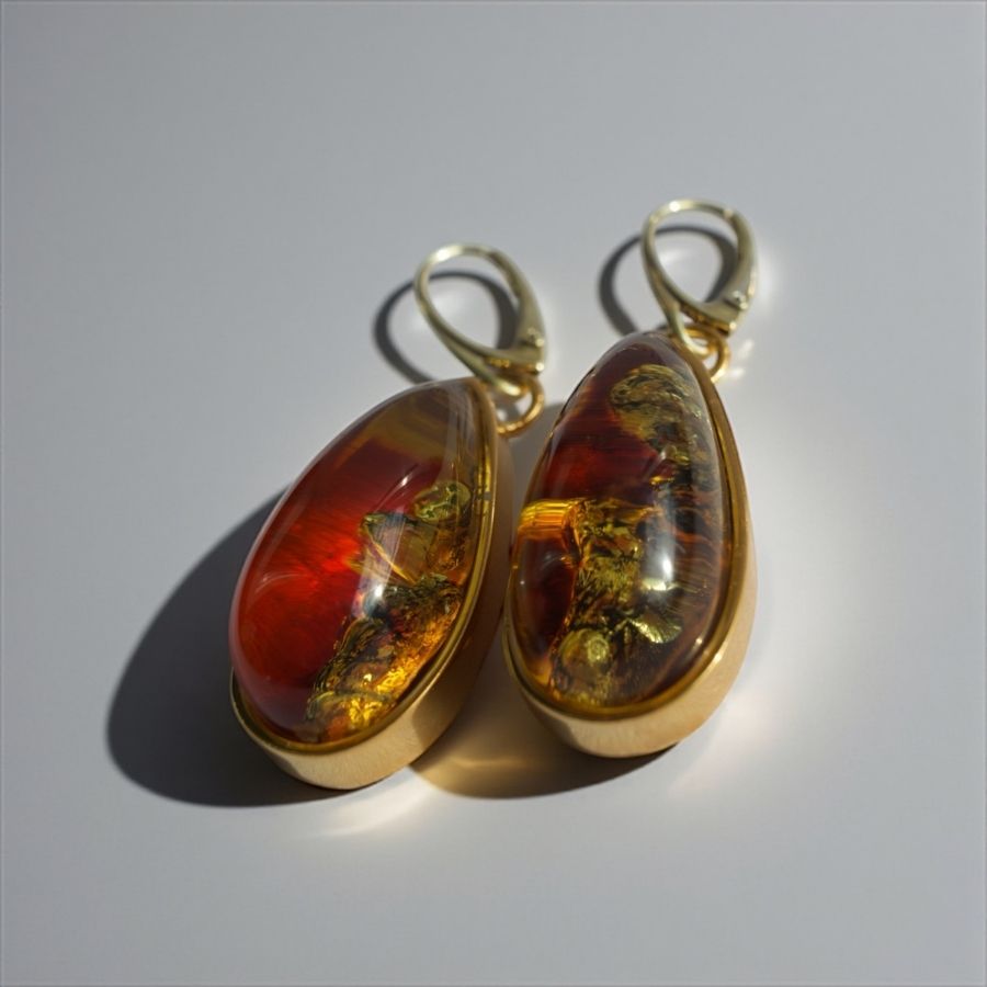 Te ręcznie wykonane kolczyki zachwycają intensywnym, głębokim odcieniem bursztynu, którego naturalna struktura pięknie współgra z elegancką, pozłacaną oprawą. Kształt bursztynu podkreślony jest 24-karatowym złotem, co dodaje całości luksusowego charakteru. Dzięki swojej długości kolczyki prezentują się niezwykle efektownie i stanowią wyjątkową ozdobę na każdą okazję.