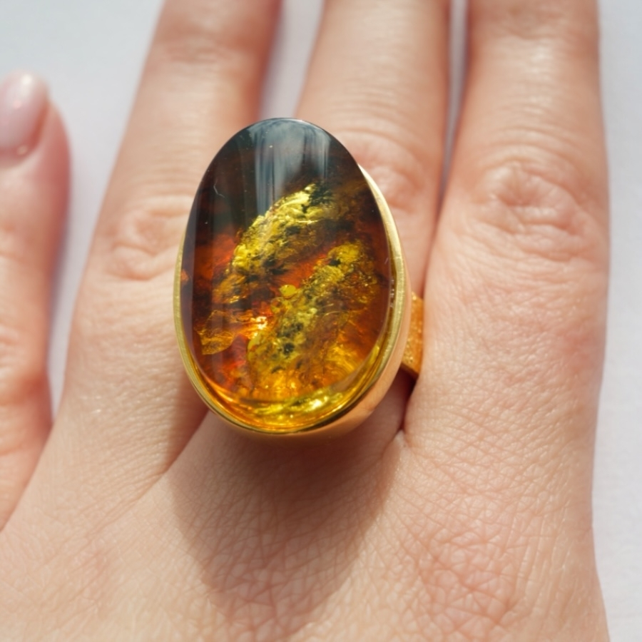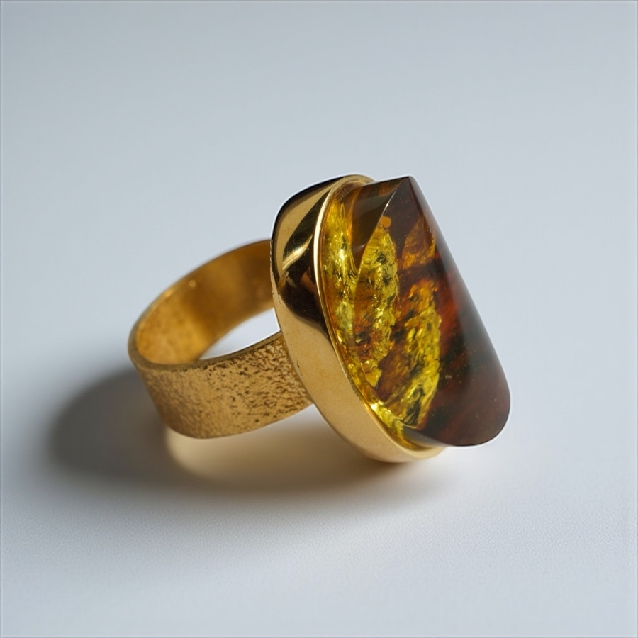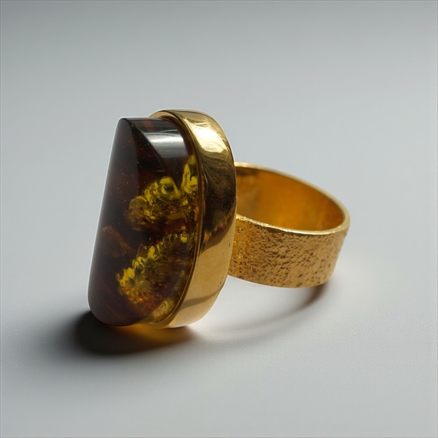 Szlachetny, owalny bursztyn w gładkiej, złoconej oprawie przyciąga wzrok głębią koniakowych tonów i złotymi inkluzjami. Szeroka, subtelnie fakturowana obrączka pięknie równoważy bryłę kamienia, tworząc wyrazisty, elegancki pierścionek na co dzień i na wieczór.